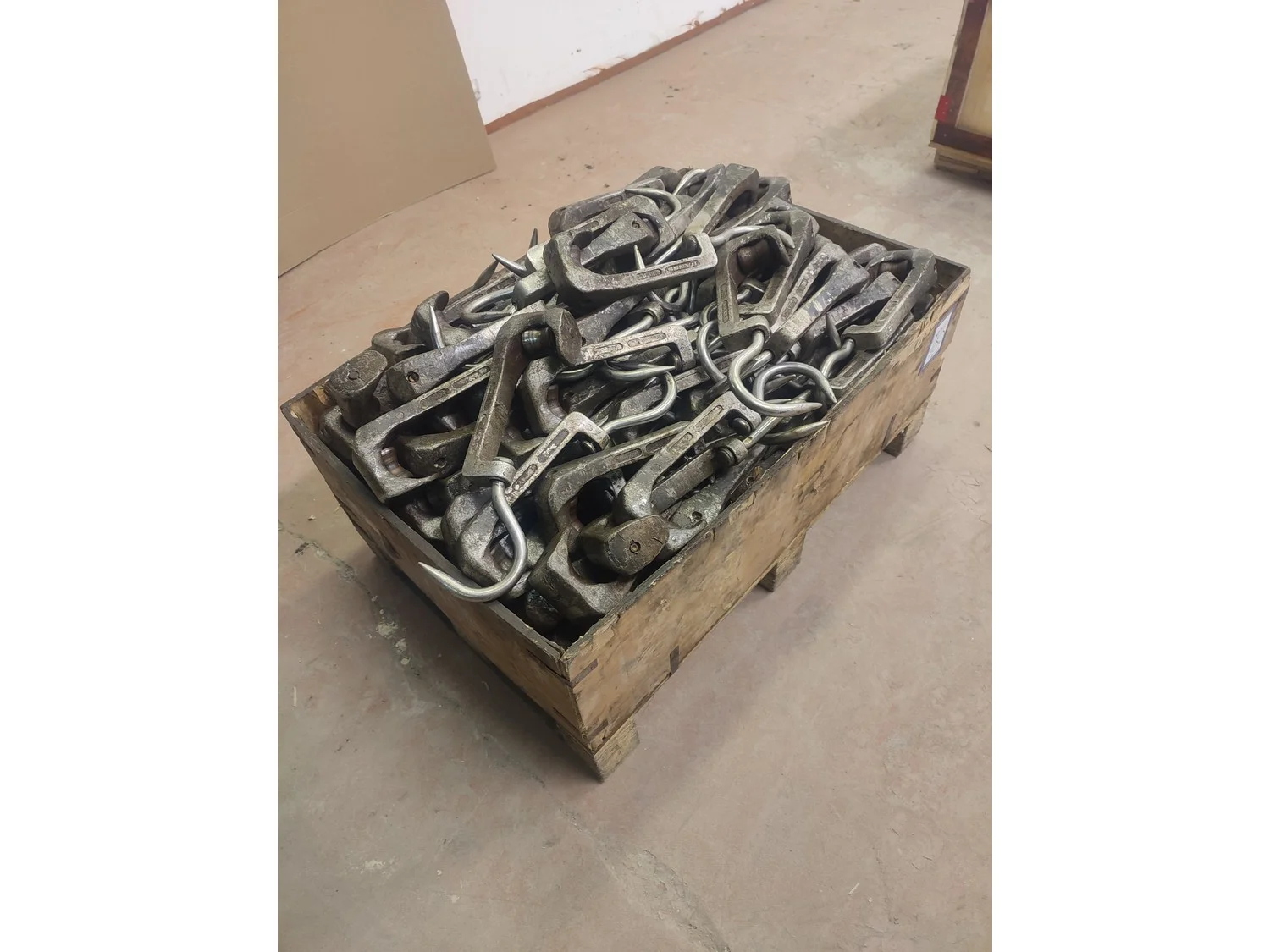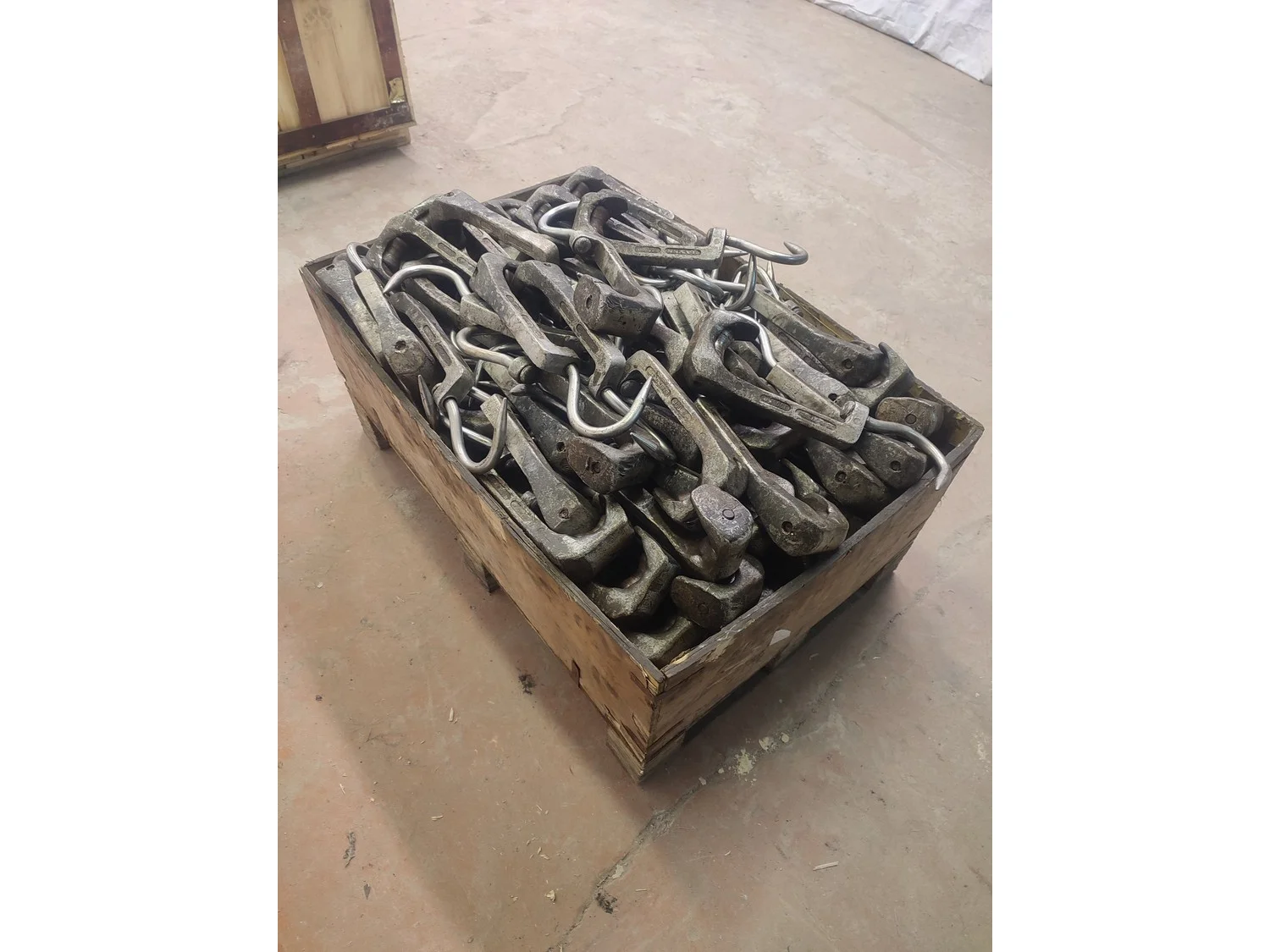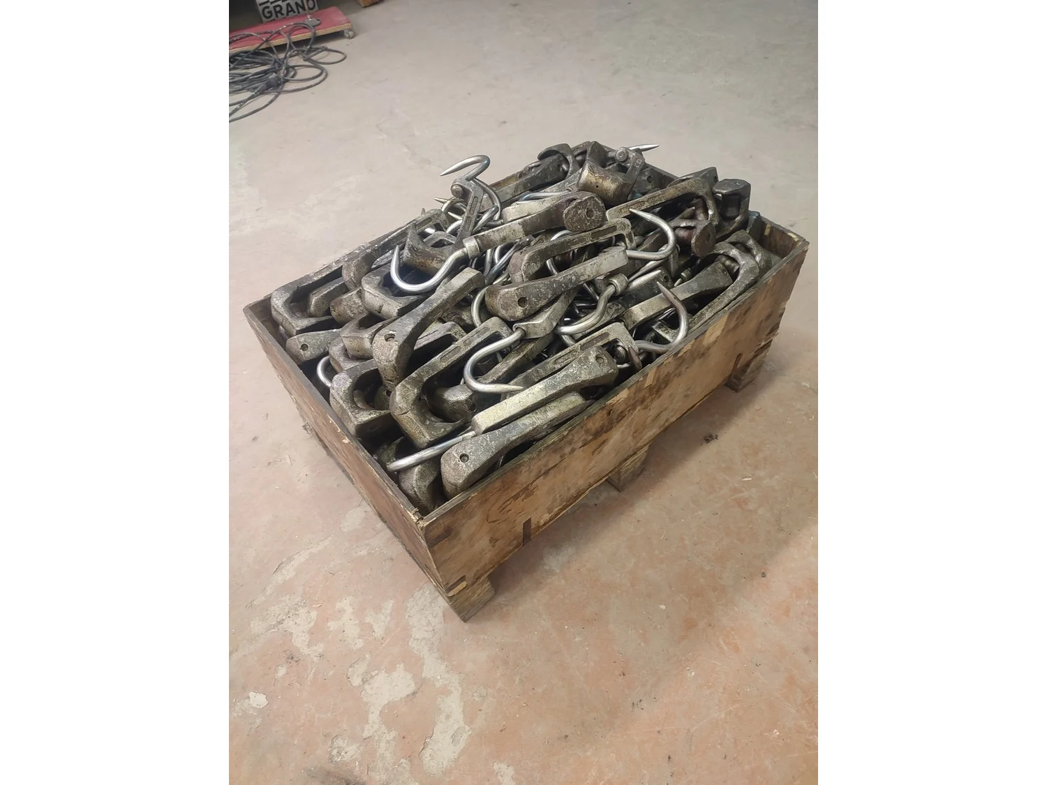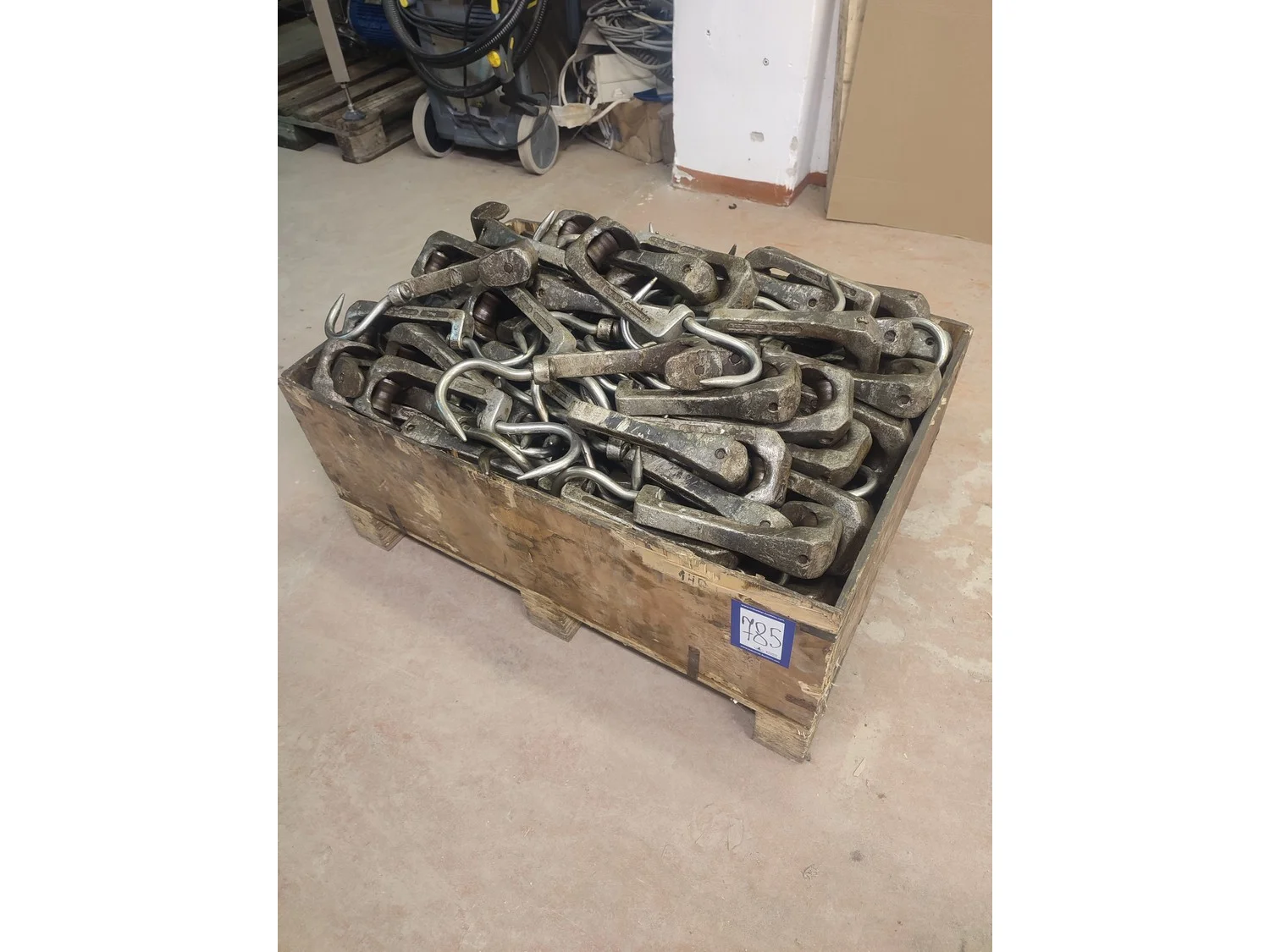 Wooden pallet box with 140 roller meat hooks, dimensions hooks: 360 mm x 115 mm x 50 mm, dimensions pallet box: 880 mm x 600 mm x 500 mm.