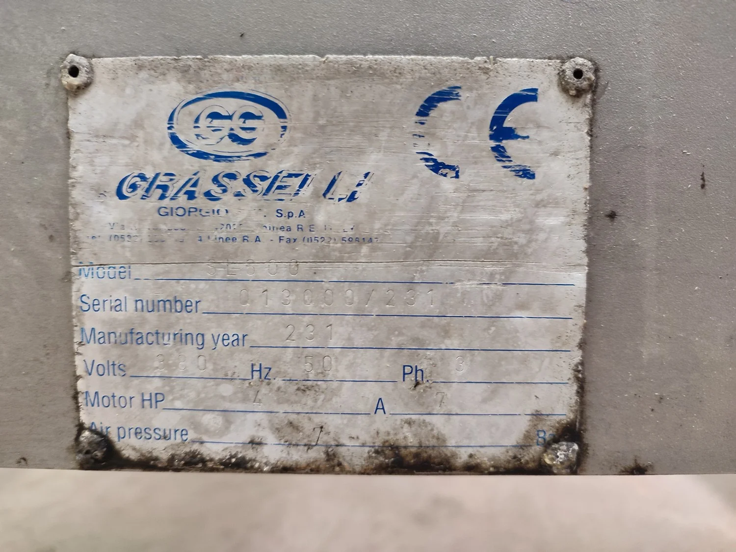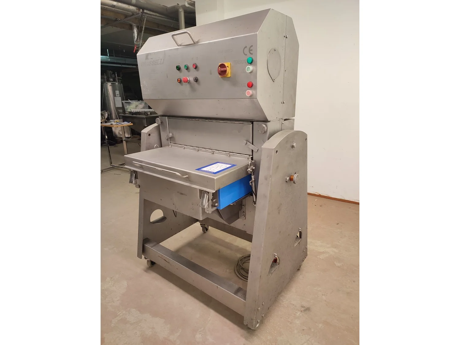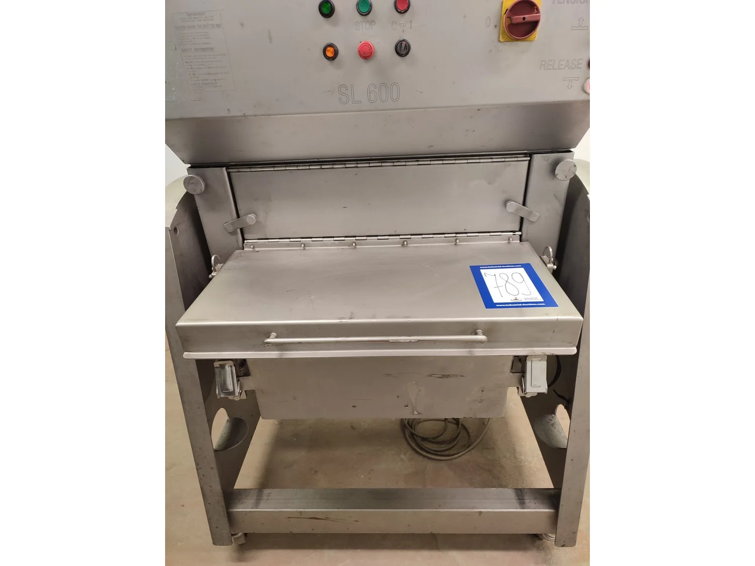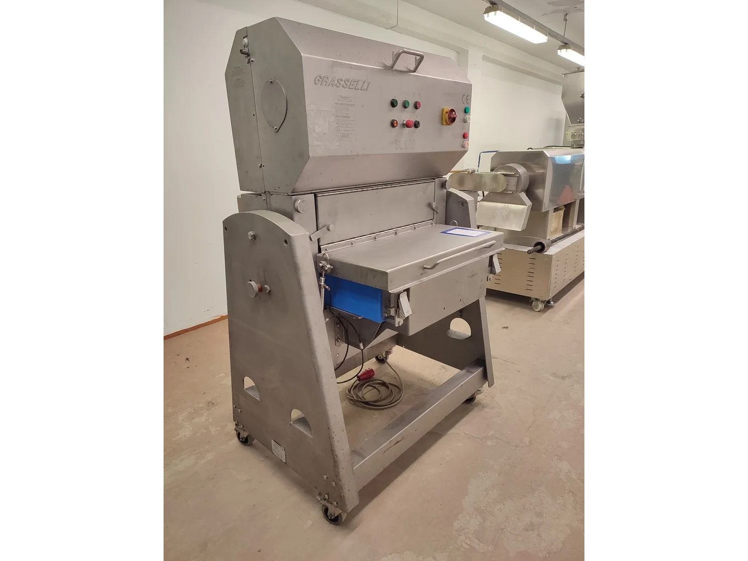 Grasselli SpA mobile automatic slicer, model: SL600, serial number: 013000/231, 380 V, 50 Hz, 3 Ph, 7 A, plastic belt, belt width: 595 mm, distance between knives: 10 mm, total dimensions: 1300 mm x 1300 mm x 1820 mm.
