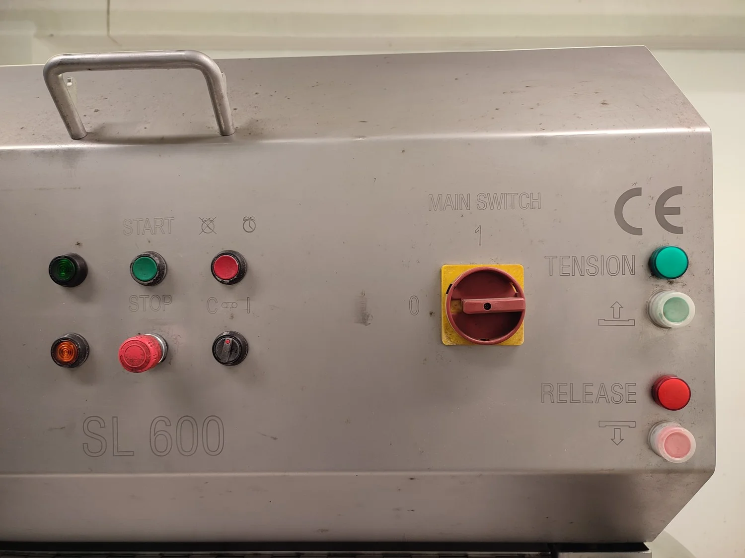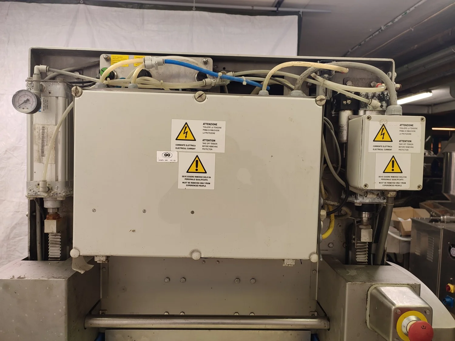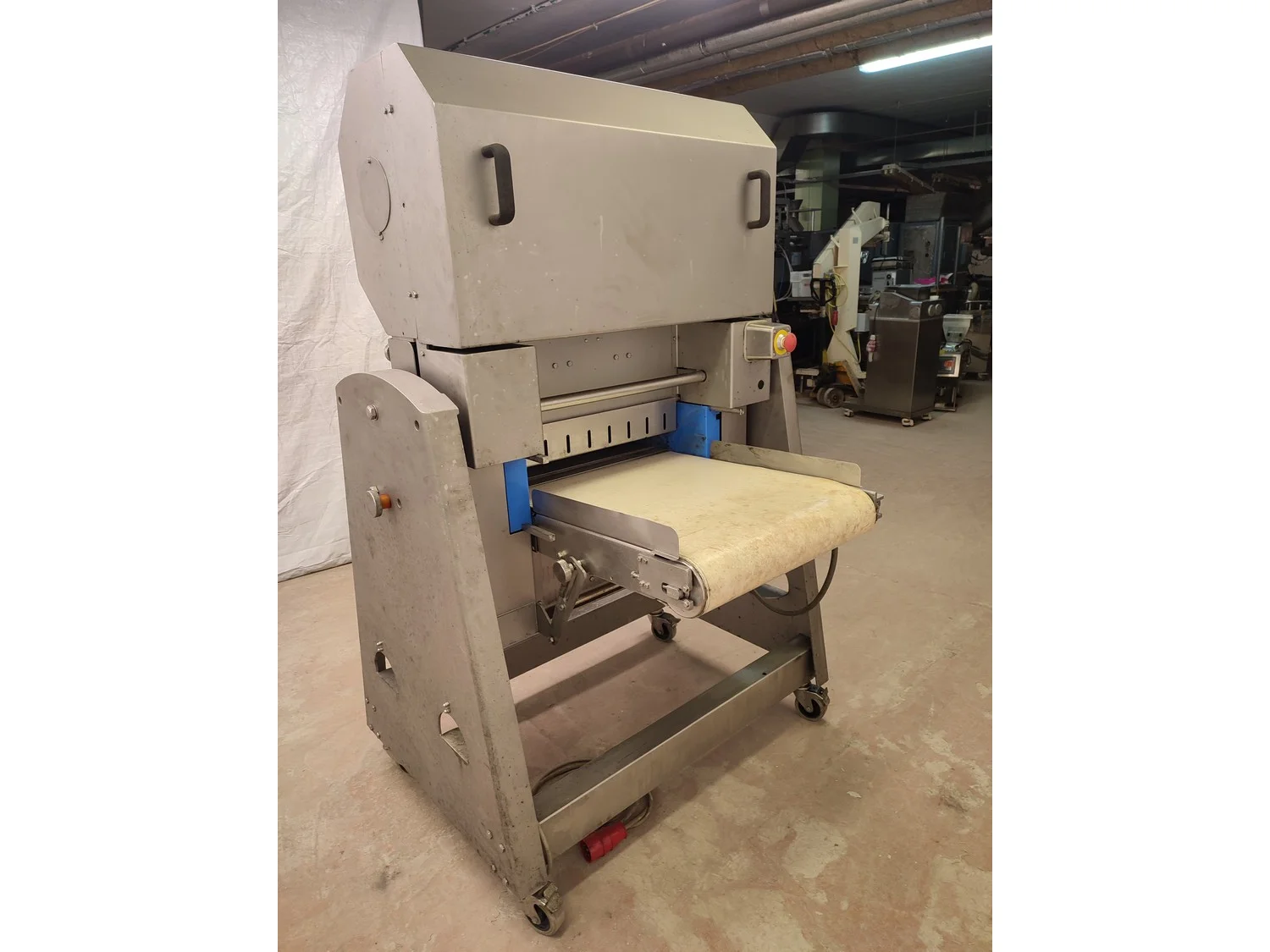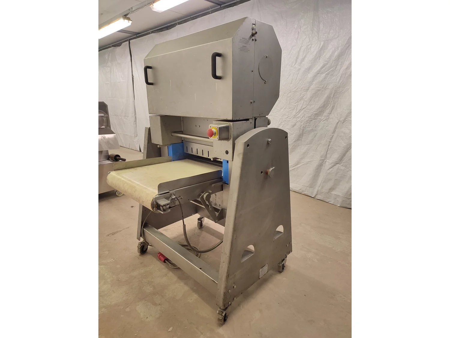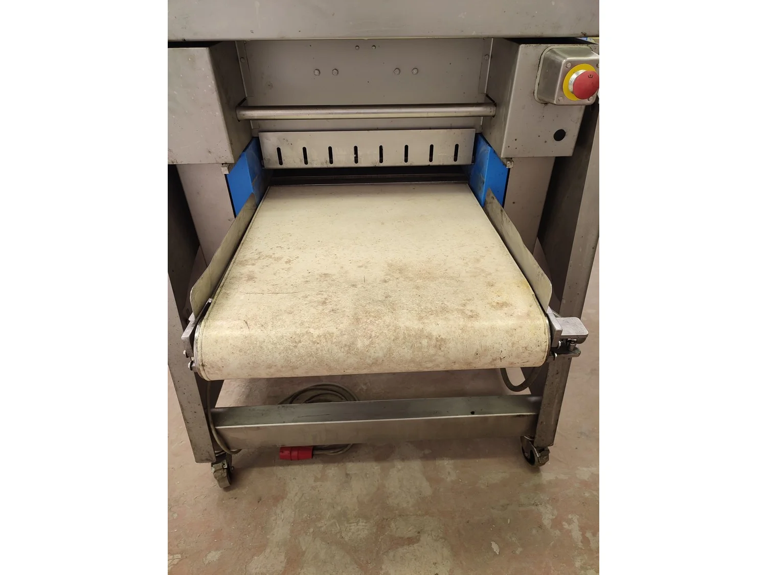 Grasselli SpA mobile automatic slicer, model: SL600, serial number: 013000/231, 380 V, 50 Hz, 3 Ph, 7 A, plastic belt, belt width: 595 mm, distance between knives: 10 mm, total dimensions: 1300 mm x 1300 mm x 1820 mm.