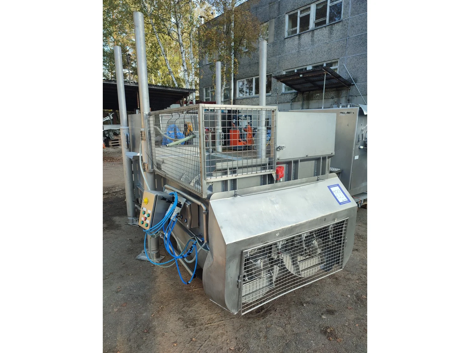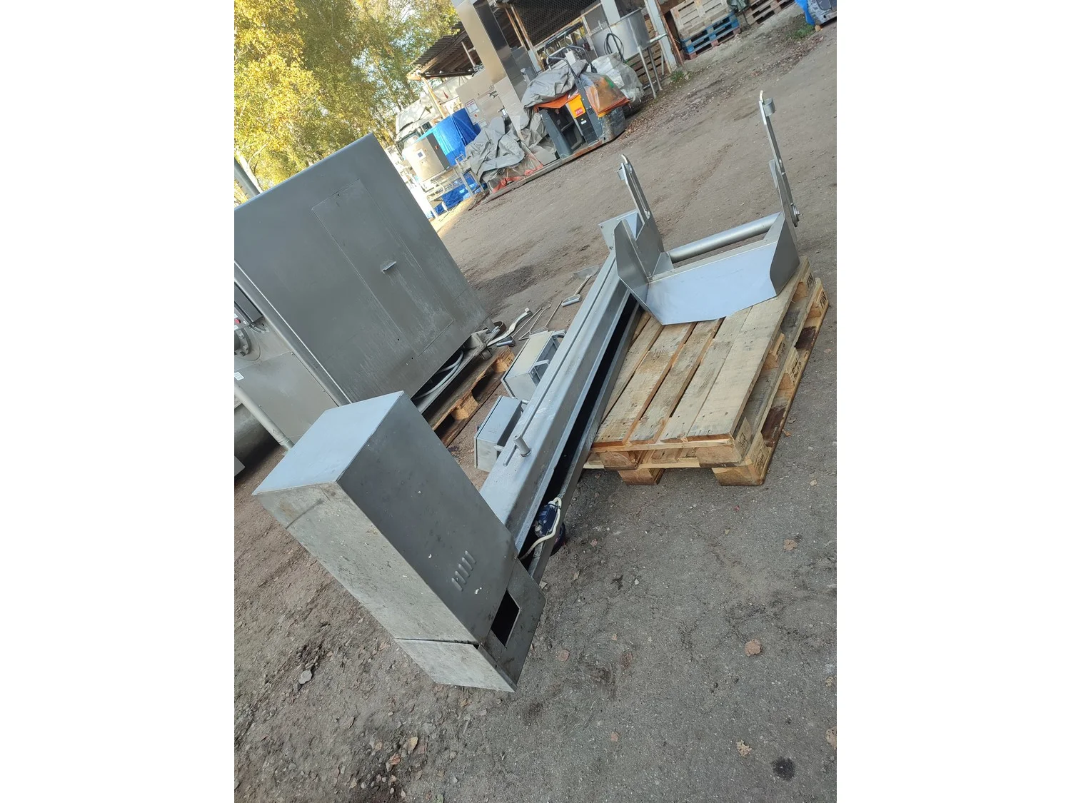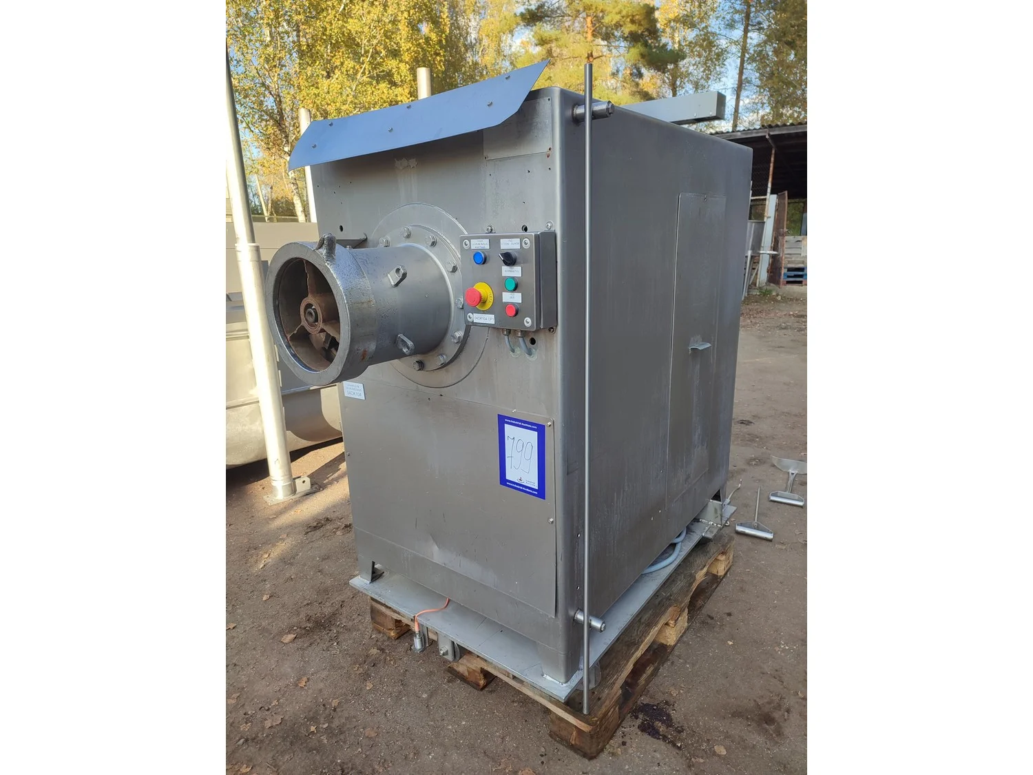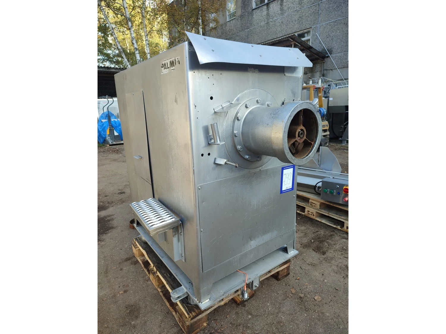 Meat processing line consisting of: Hackman s/s lifter for 200 liter meat bins; Palmia grinder, model: S257.210, number: 4377, diameter plate: 258 mm; double spiral mixer; 2 pallets of components and top frame. Lifter dimensions: 2720 mm x 1250 mm x 930 mm, grinder dimensions: 1180 mm x 1700 mm x 1620 mm, mixer dimensions: 1800 mm x 3480 mm x 2440 mm, 2 pallets dimensions: 1300 mm x 1300 mm x 540 mm and 2100 mm x 1100 mm x 1360 mm, frame dimensions: 3000 mm x 1420 mm x 370 mm.