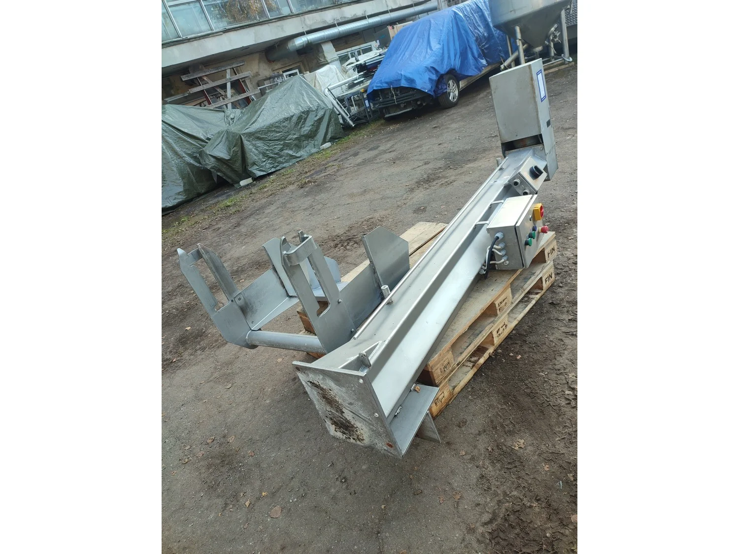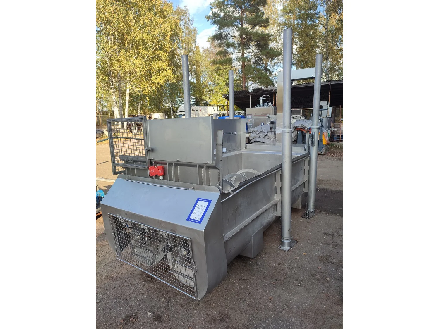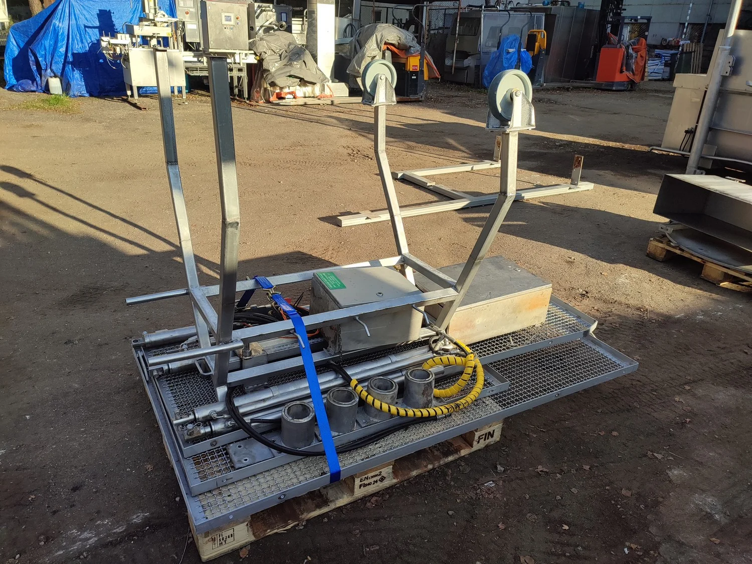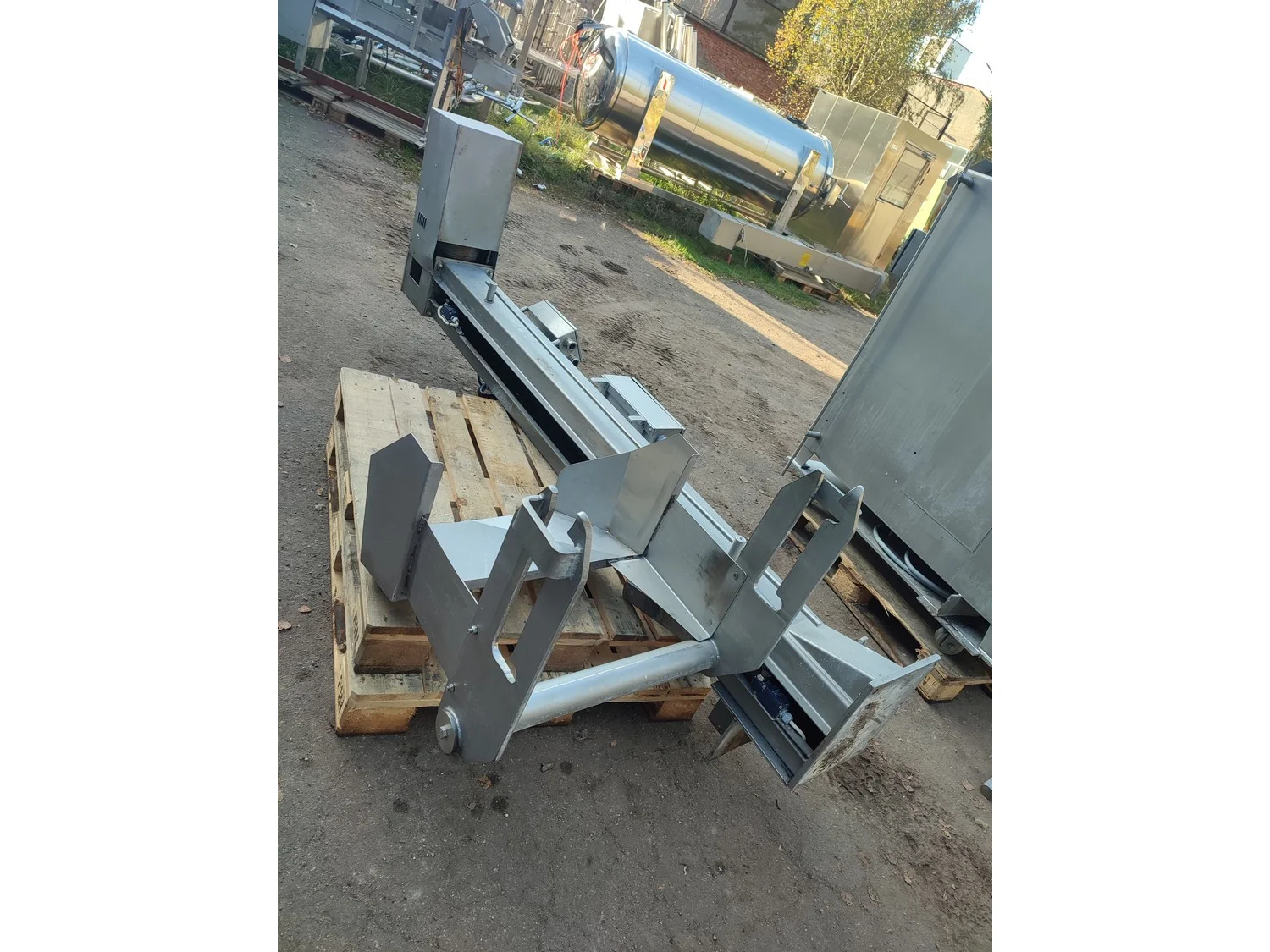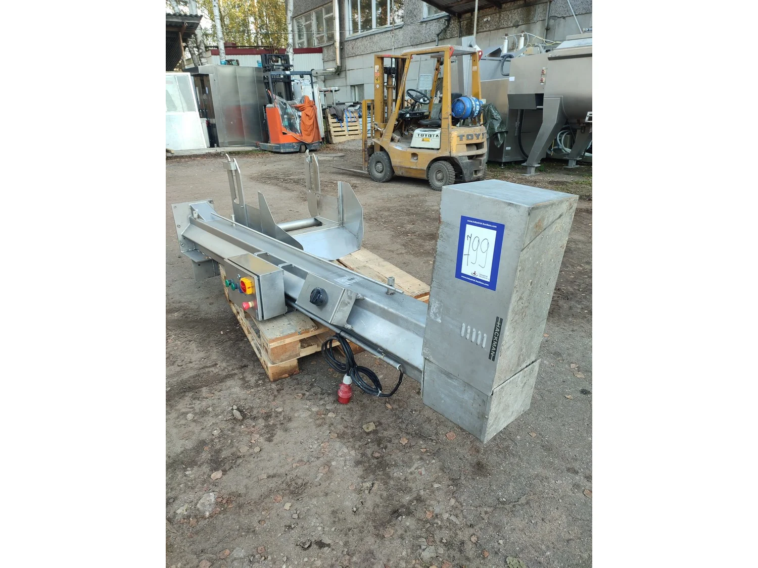 Meat processing line consisting of: Hackman s/s lifter for 200 liter meat bins; Palmia grinder, model: S257.210, number: 4377, diameter plate: 258 mm; double spiral mixer; 2 pallets of components and top frame. Lifter dimensions: 2720 mm x 1250 mm x 930 mm, grinder dimensions: 1180 mm x 1700 mm x 1620 mm, mixer dimensions: 1800 mm x 3480 mm x 2440 mm, 2 pallets dimensions: 1300 mm x 1300 mm x 540 mm and 2100 mm x 1100 mm x 1360 mm, frame dimensions: 3000 mm x 1420 mm x 370 mm.