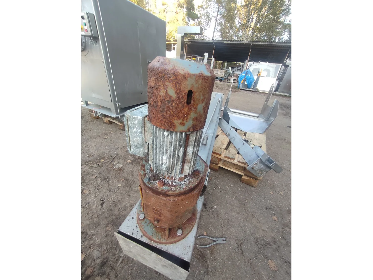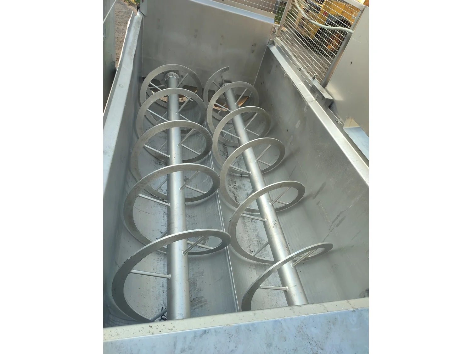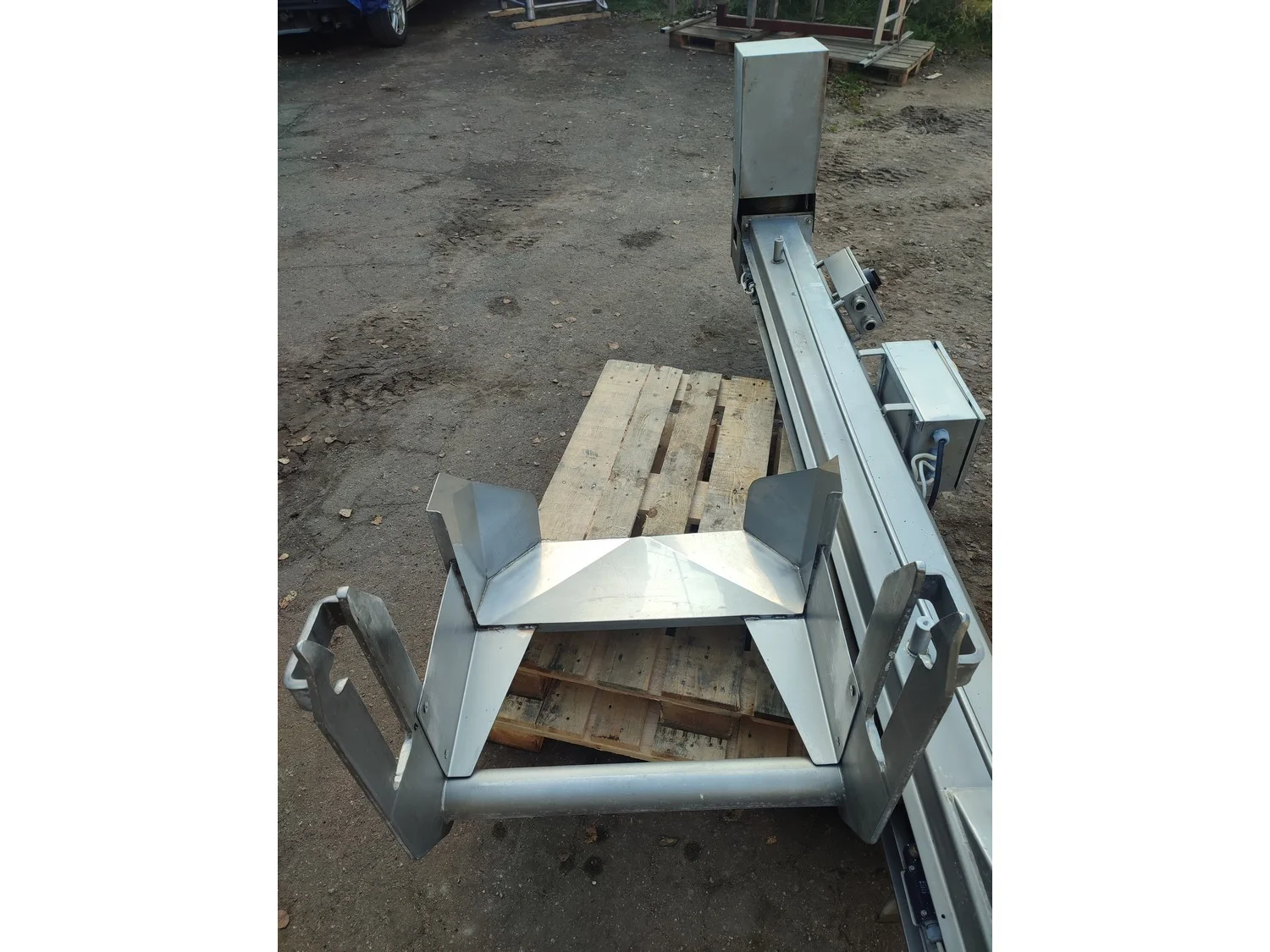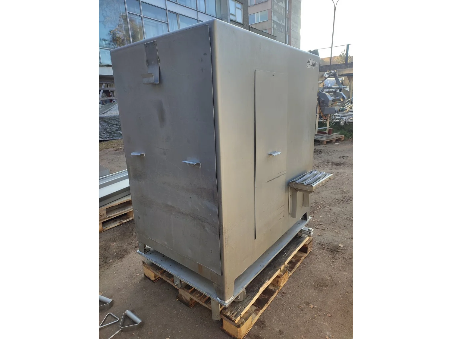 Meat processing line consisting of: Hackman s/s lifter for 200 liter meat bins; Palmia grinder, model: S257.210, number: 4377, diameter plate: 258 mm; double spiral mixer; 2 pallets of components and top frame. Lifter dimensions: 2720 mm x 1250 mm x 930 mm, grinder dimensions: 1180 mm x 1700 mm x 1620 mm, mixer dimensions: 1800 mm x 3480 mm x 2440 mm, 2 pallets dimensions: 1300 mm x 1300 mm x 540 mm and 2100 mm x 1100 mm x 1360 mm, frame dimensions: 3000 mm x 1420 mm x 370 mm.