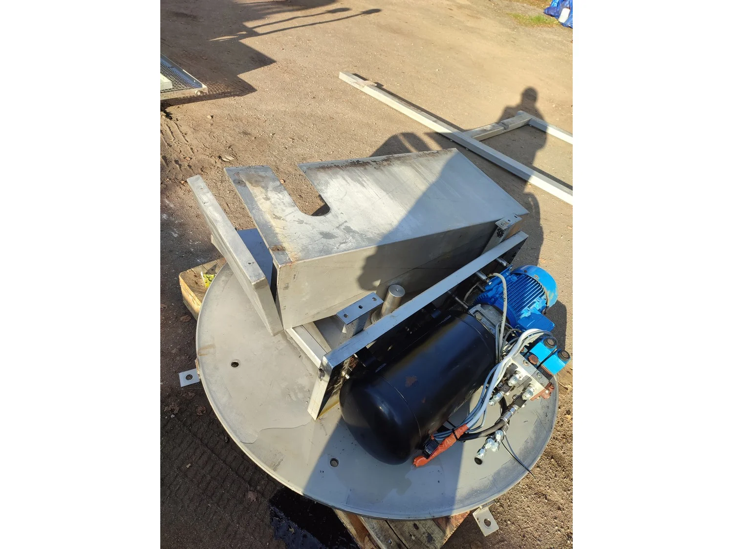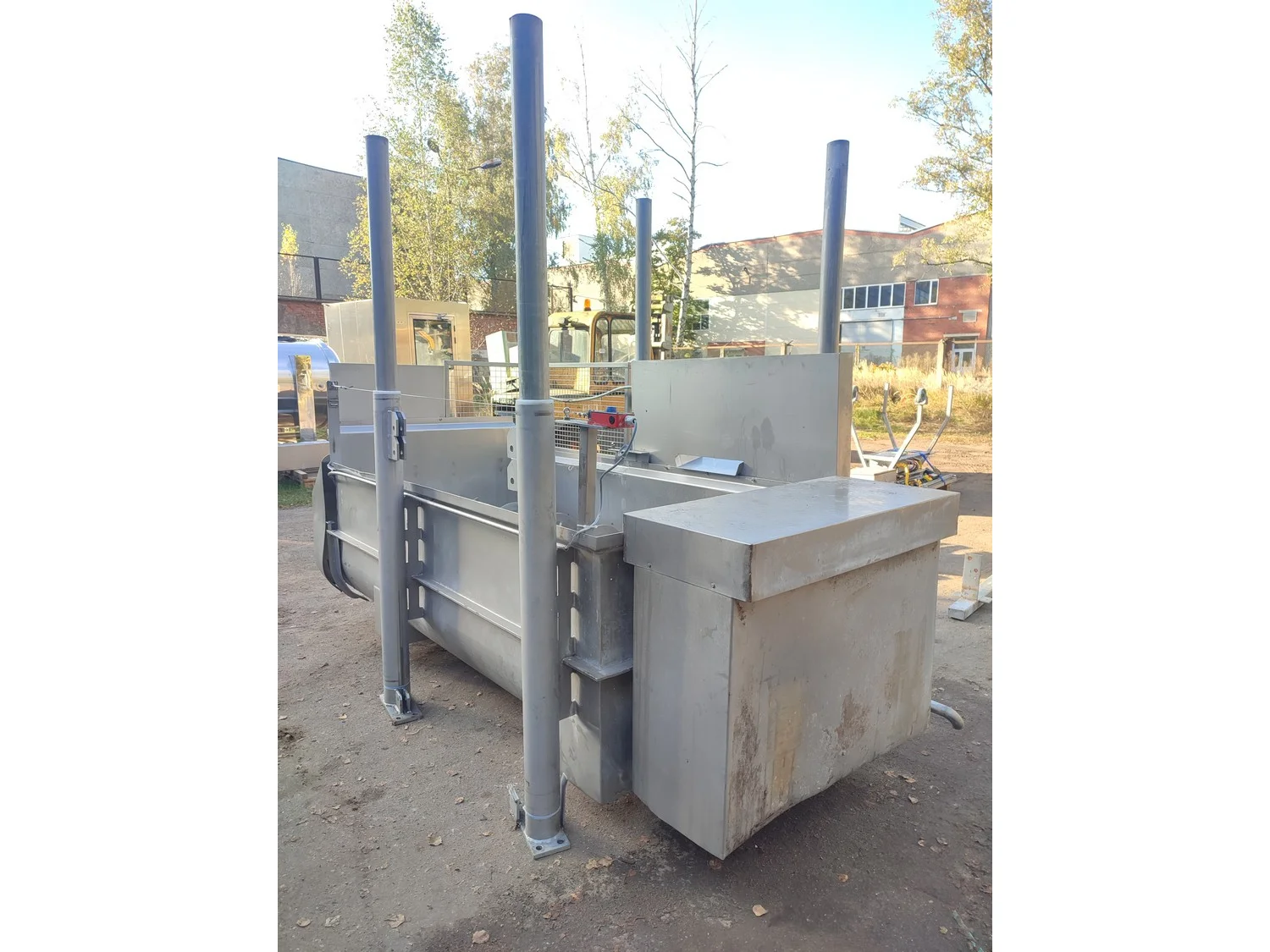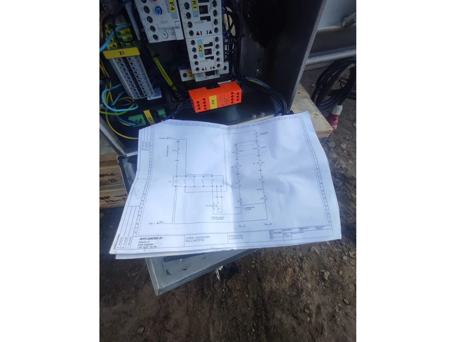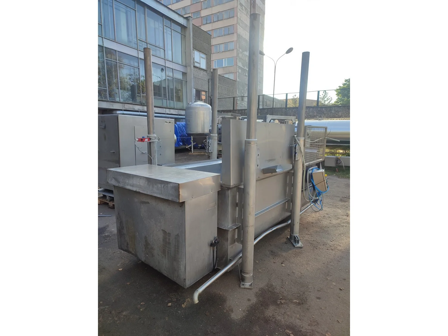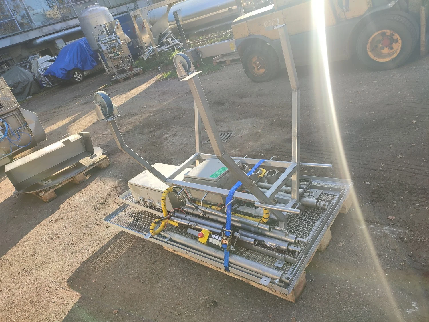 Meat processing line consisting of: Hackman s/s lifter for 200 liter meat bins; Palmia grinder, model: S257.210, number: 4377, diameter plate: 258 mm; double spiral mixer; 2 pallets of components and top frame. Lifter dimensions: 2720 mm x 1250 mm x 930 mm, grinder dimensions: 1180 mm x 1700 mm x 1620 mm, mixer dimensions: 1800 mm x 3480 mm x 2440 mm, 2 pallets dimensions: 1300 mm x 1300 mm x 540 mm and 2100 mm x 1100 mm x 1360 mm, frame dimensions: 3000 mm x 1420 mm x 370 mm.