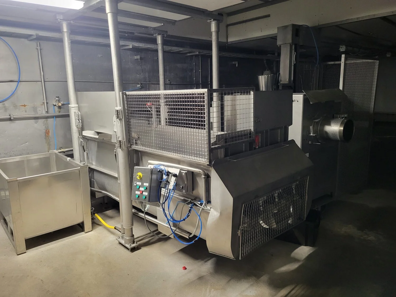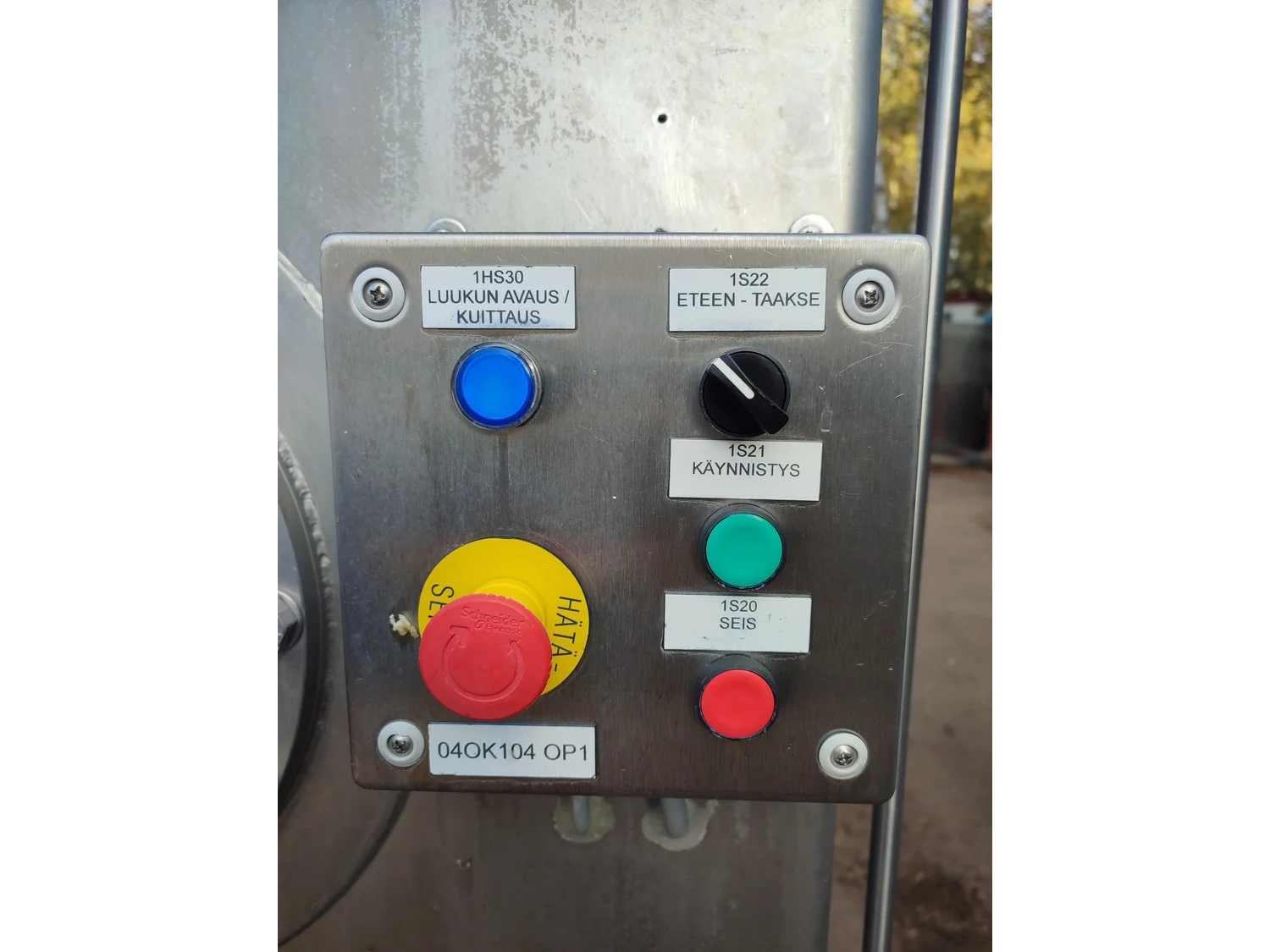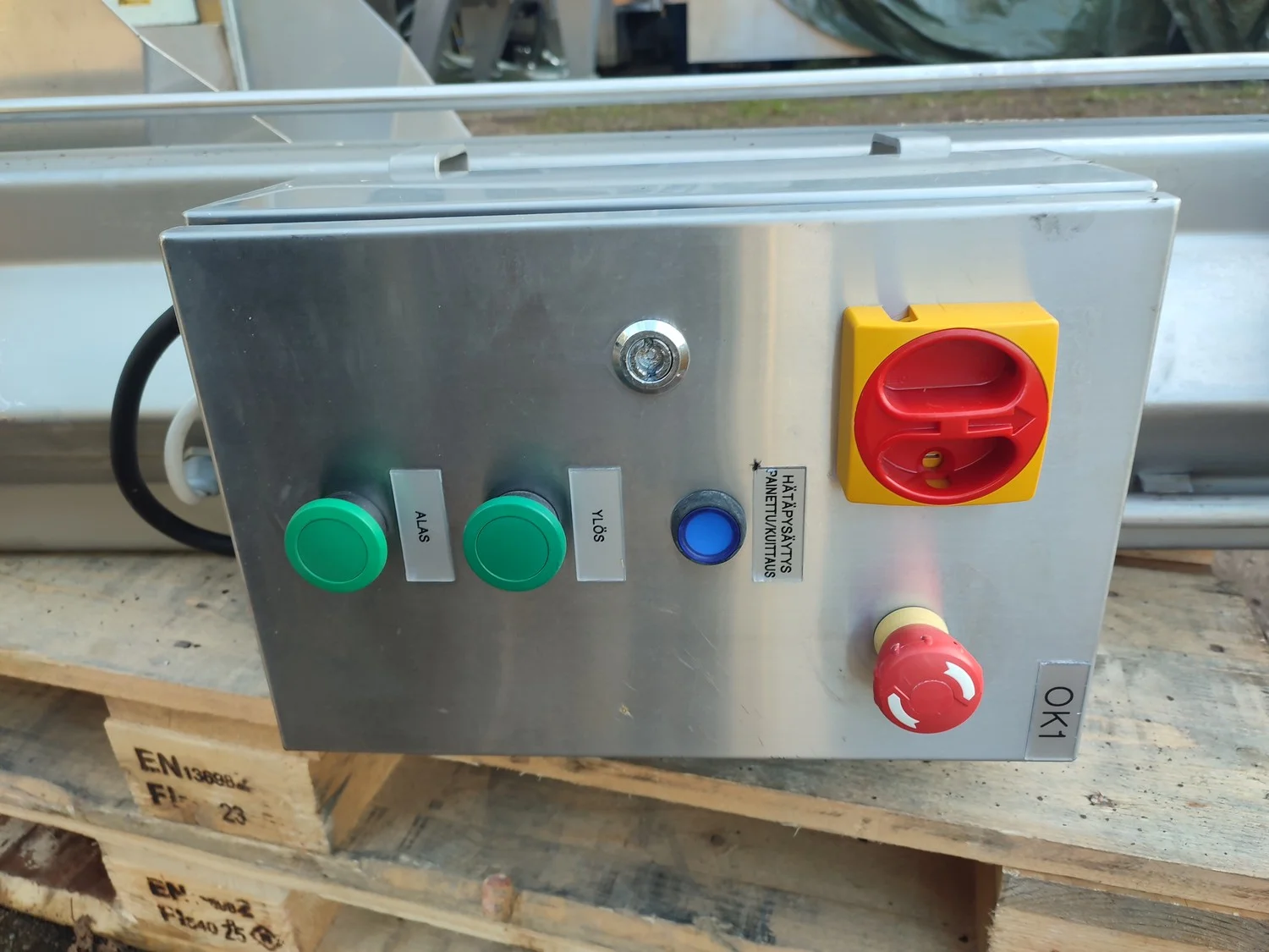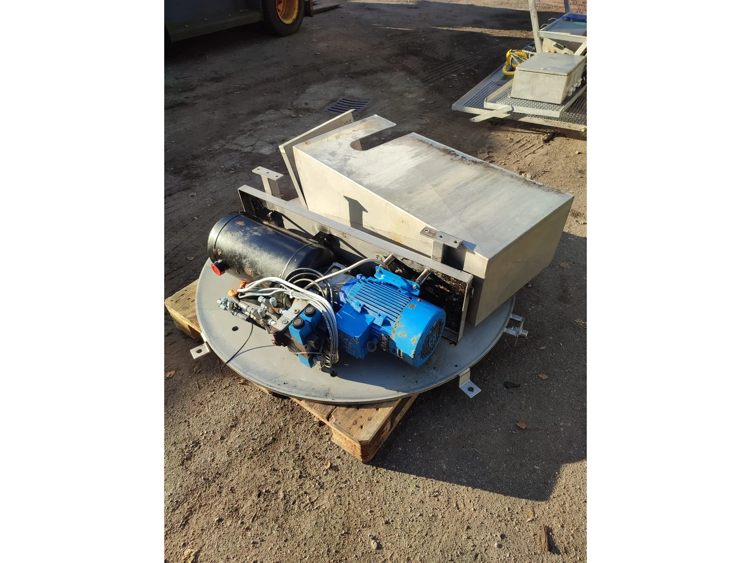 Meat processing line consisting of: Hackman s/s lifter for 200 liter meat bins; Palmia grinder, model: S257.210, number: 4377, diameter plate: 258 mm; double spiral mixer; 2 pallets of components and top frame. Lifter dimensions: 2720 mm x 1250 mm x 930 mm, grinder dimensions: 1180 mm x 1700 mm x 1620 mm, mixer dimensions: 1800 mm x 3480 mm x 2440 mm, 2 pallets dimensions: 1300 mm x 1300 mm x 540 mm and 2100 mm x 1100 mm x 1360 mm, frame dimensions: 3000 mm x 1420 mm x 370 mm.