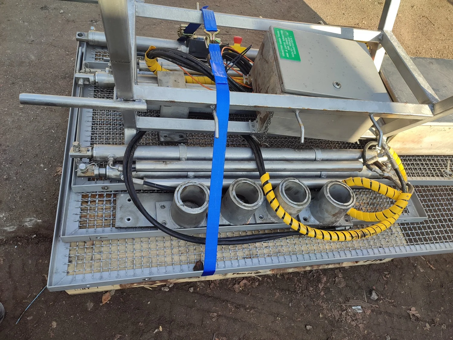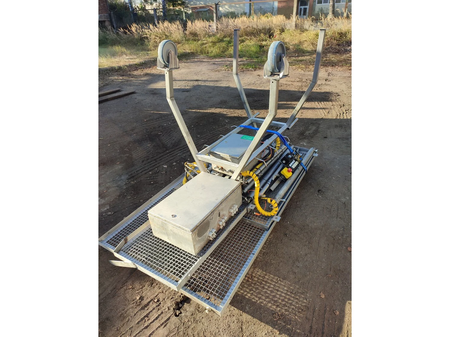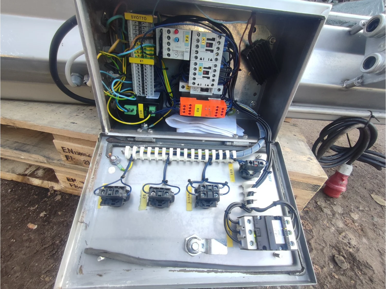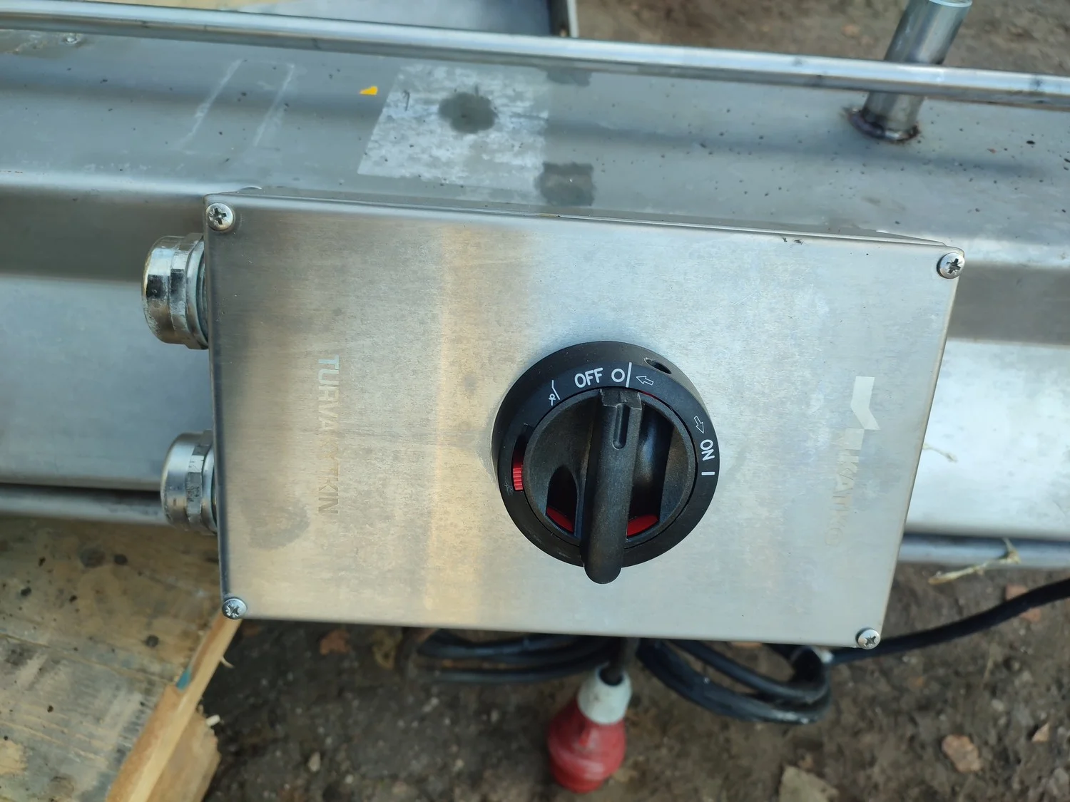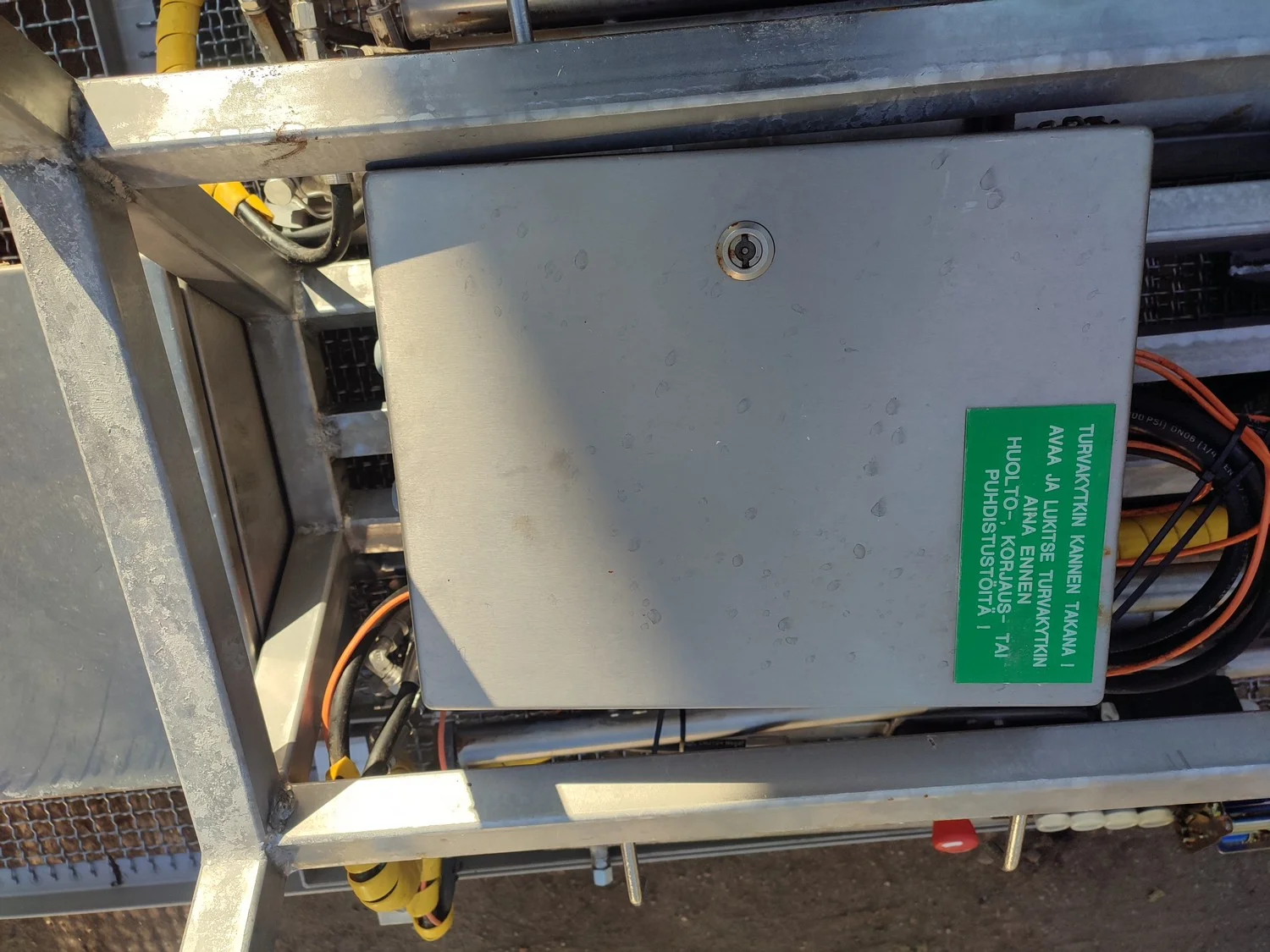 Meat processing line consisting of: Hackman s/s lifter for 200 liter meat bins; Palmia grinder, model: S257.210, number: 4377, diameter plate: 258 mm; double spiral mixer; 2 pallets of components and top frame. Lifter dimensions: 2720 mm x 1250 mm x 930 mm, grinder dimensions: 1180 mm x 1700 mm x 1620 mm, mixer dimensions: 1800 mm x 3480 mm x 2440 mm, 2 pallets dimensions: 1300 mm x 1300 mm x 540 mm and 2100 mm x 1100 mm x 1360 mm, frame dimensions: 3000 mm x 1420 mm x 370 mm.
