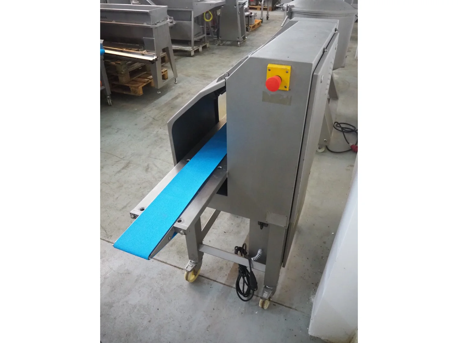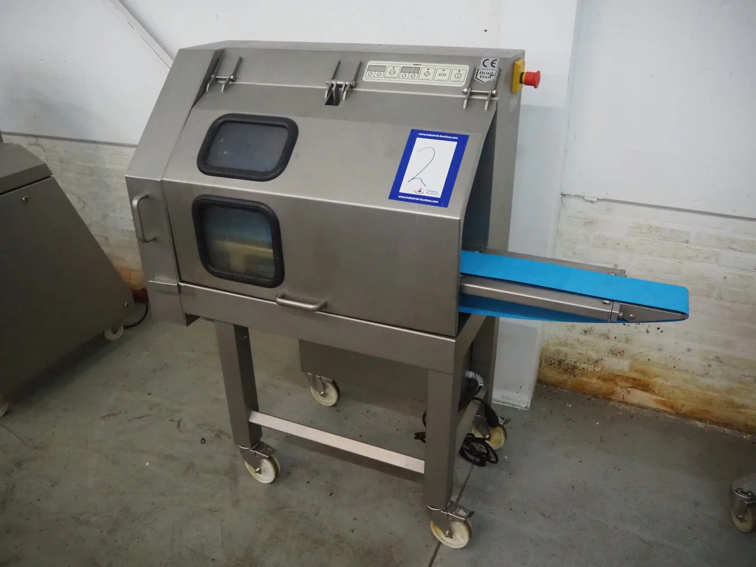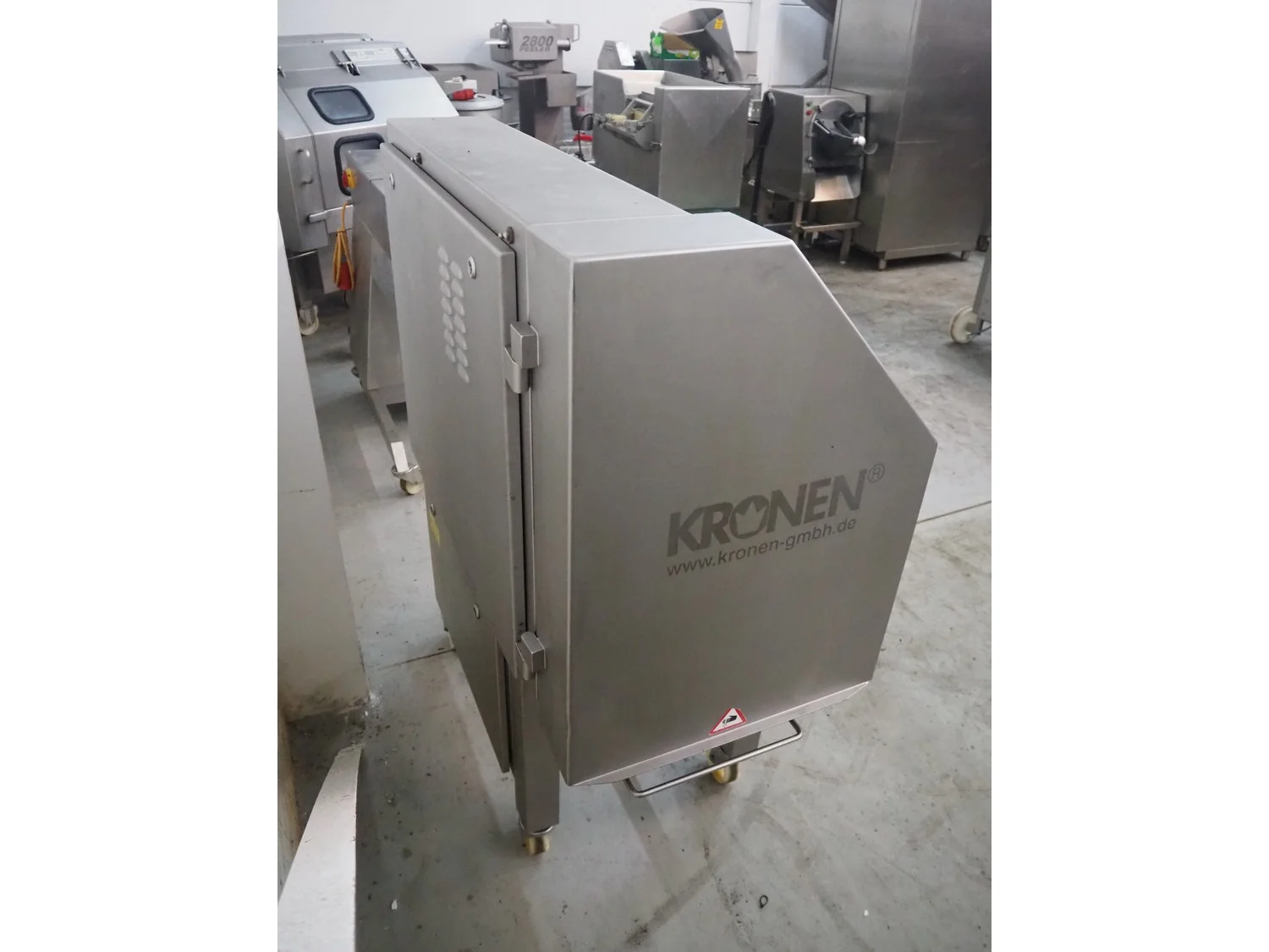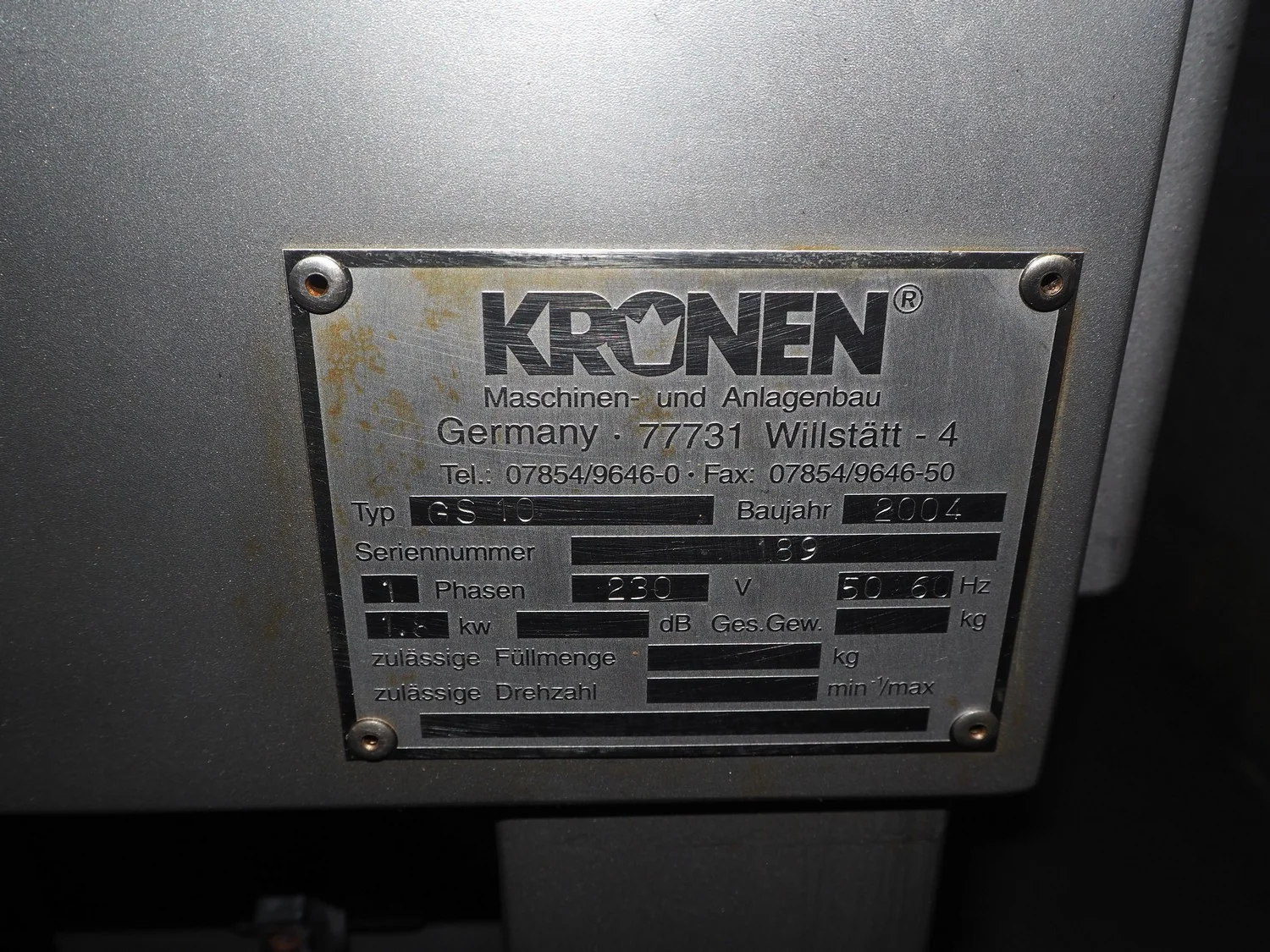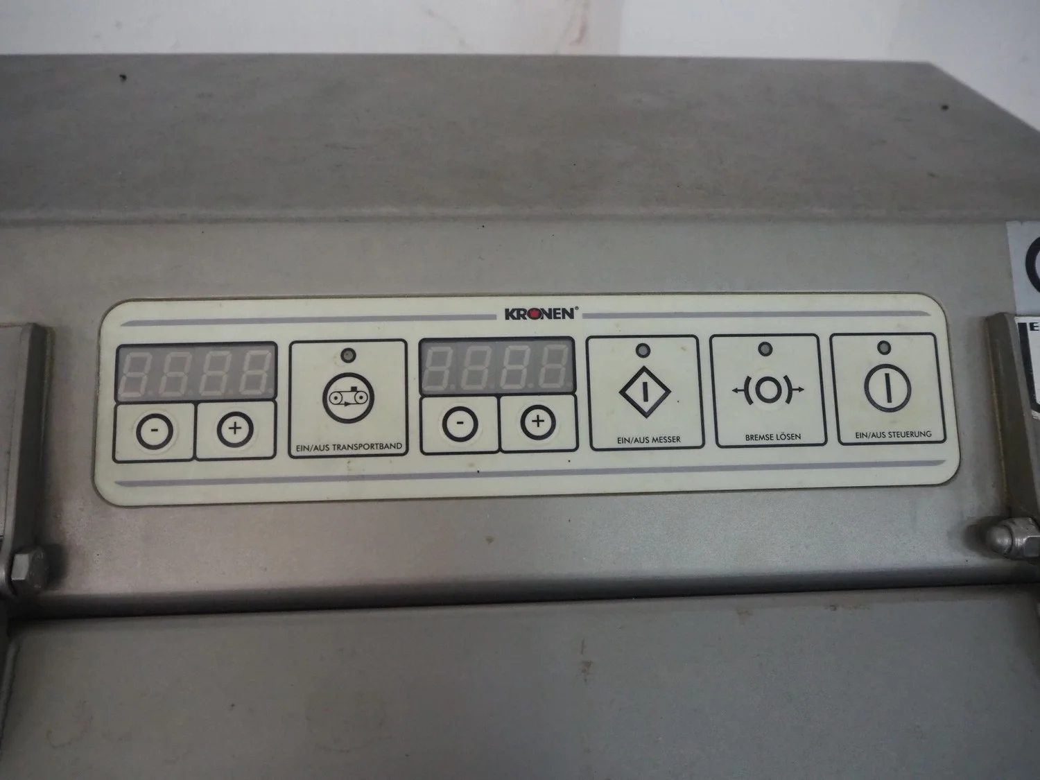 Kronen mobile slicer, type: GS 10, serial number: 189, year of construction: 2004, 230 V, 50/60 Hz, 1 Ph, 1.8 kW, plastic belt, belt width: 130 mm, diameter knife: 460 mm, total dimensions: 1550 mm x 600 mm x 1380 mm.