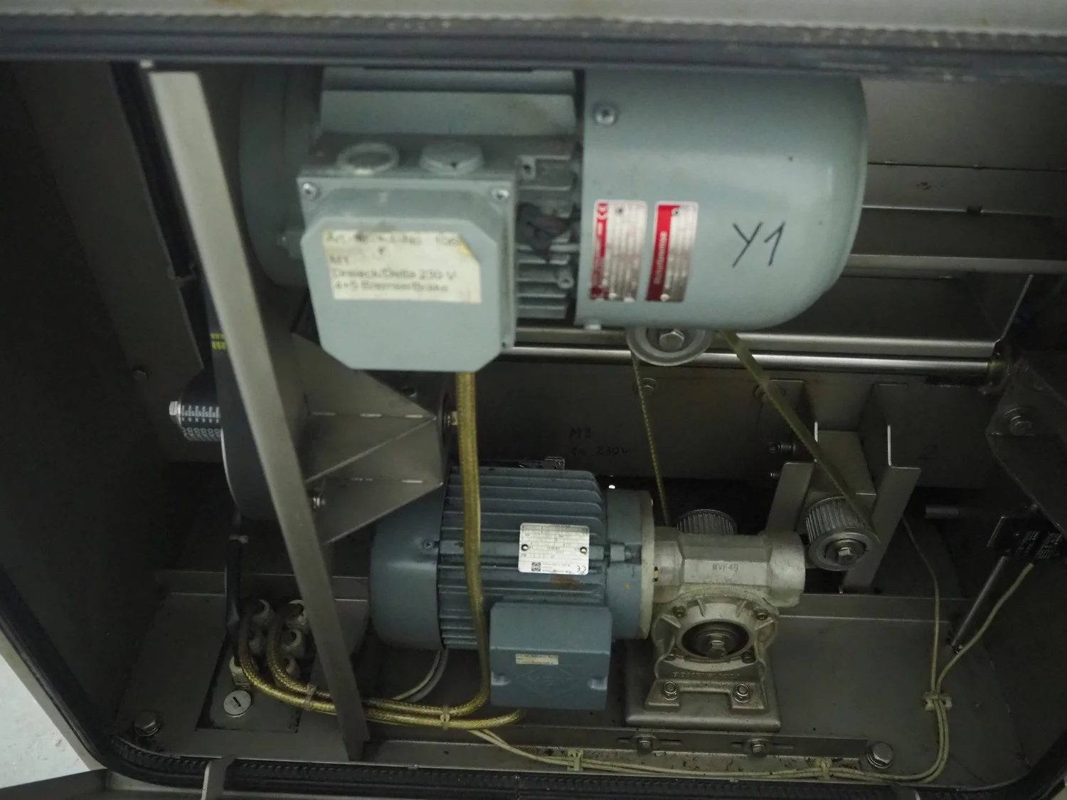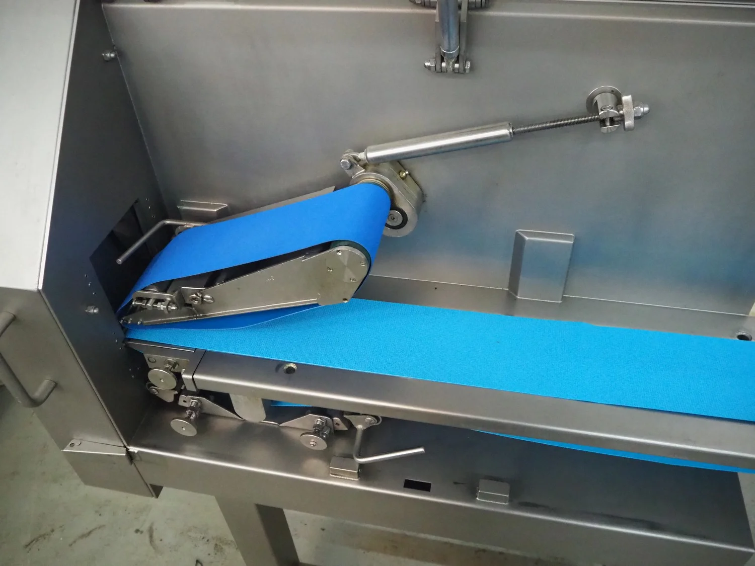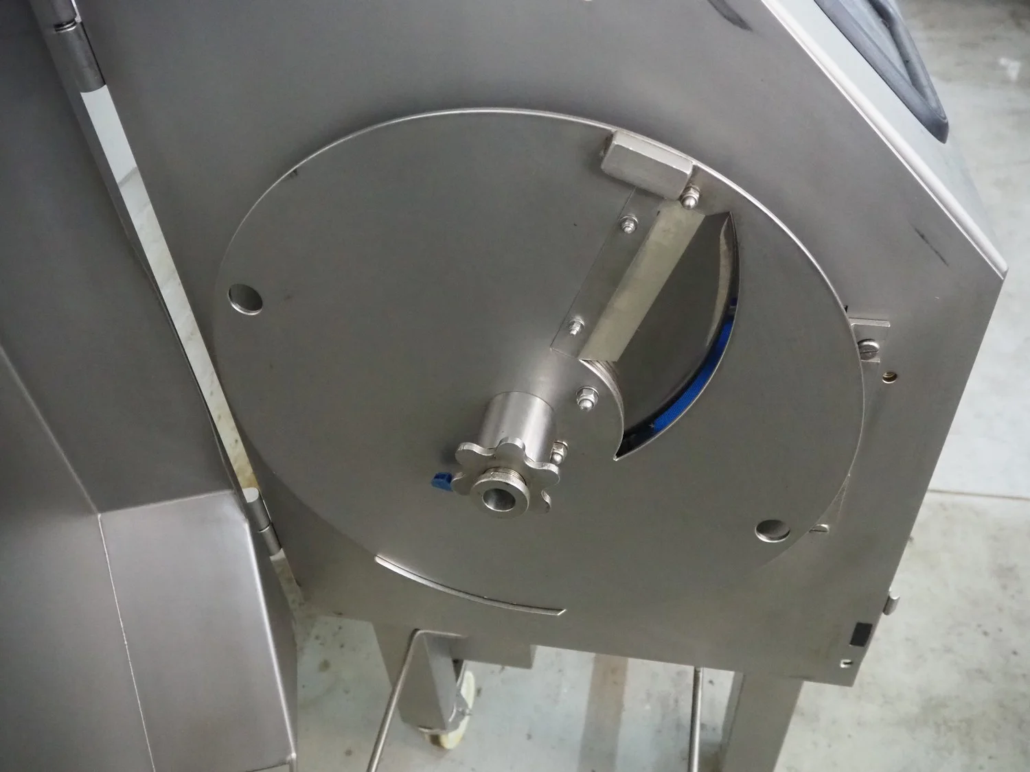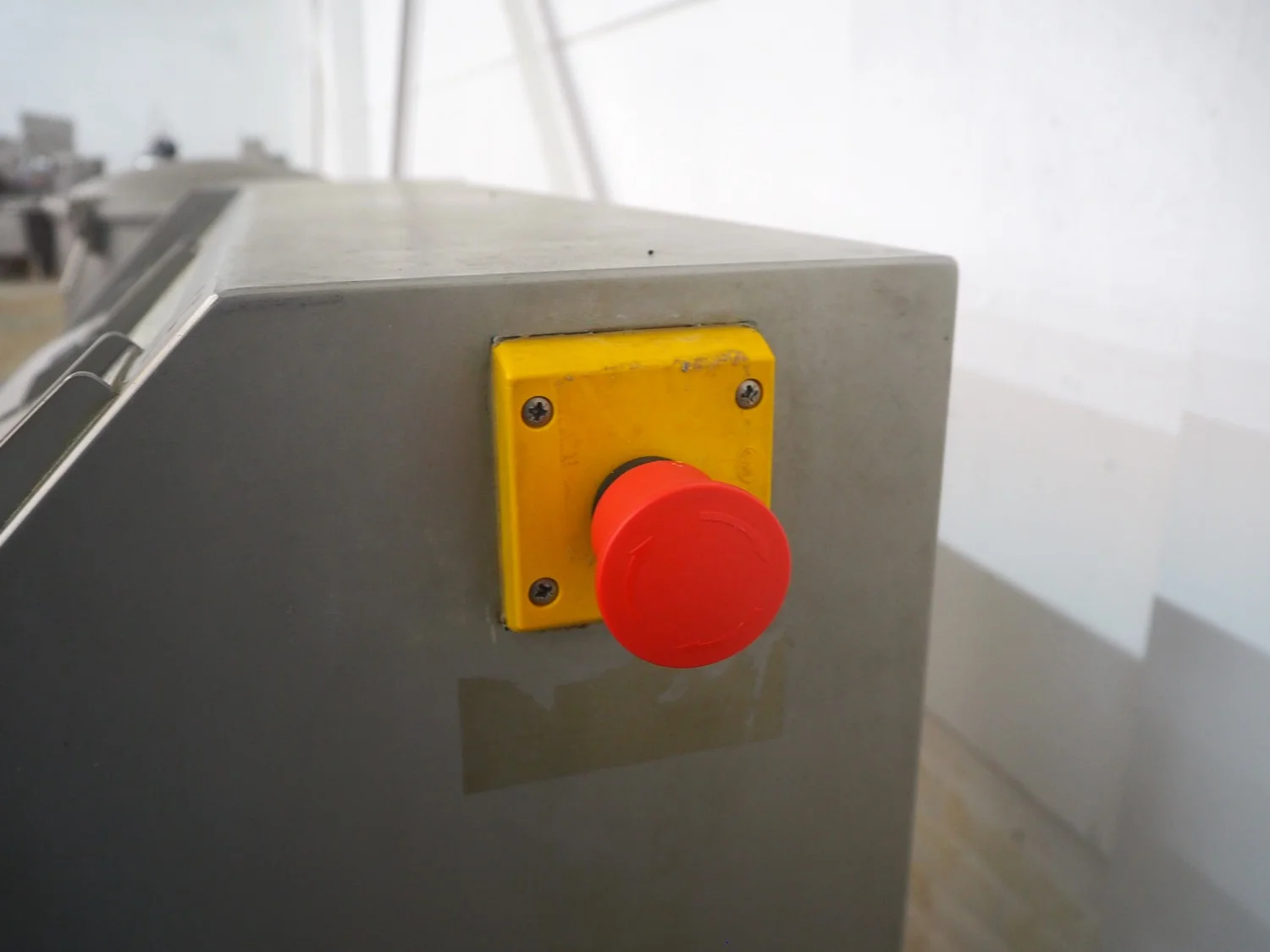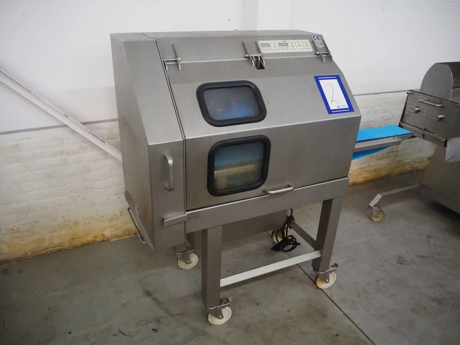 Kronen mobile slicer, type: GS 10, serial number: 189, year of construction: 2004, 230 V, 50/60 Hz, 1 Ph, 1.8 kW, plastic belt, belt width: 130 mm, diameter knife: 460 mm, total dimensions: 1550 mm x 600 mm x 1380 mm.