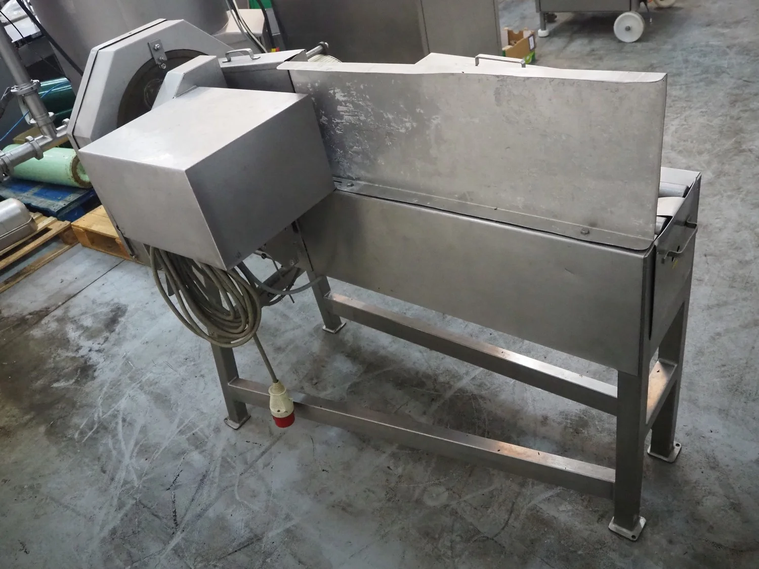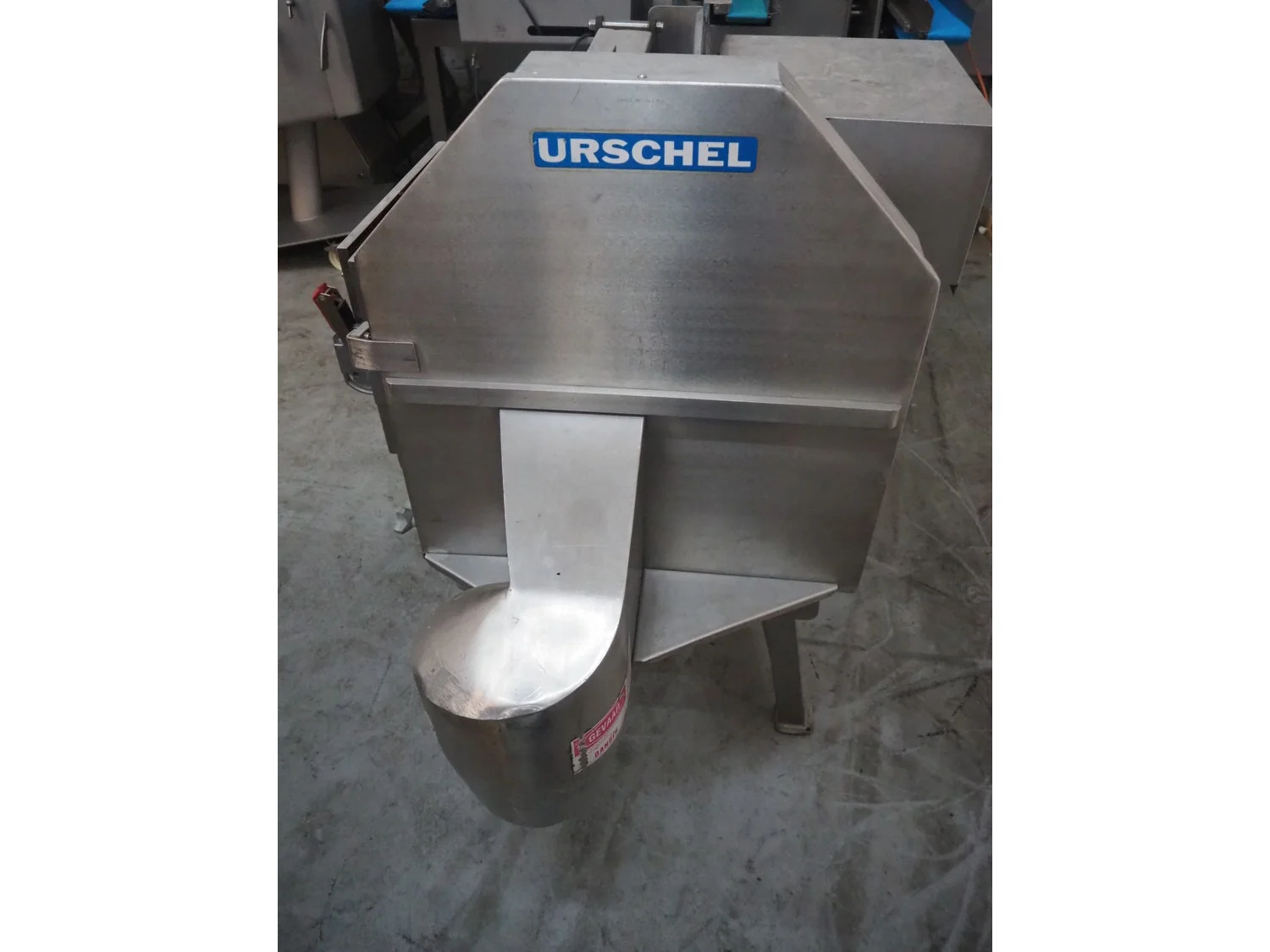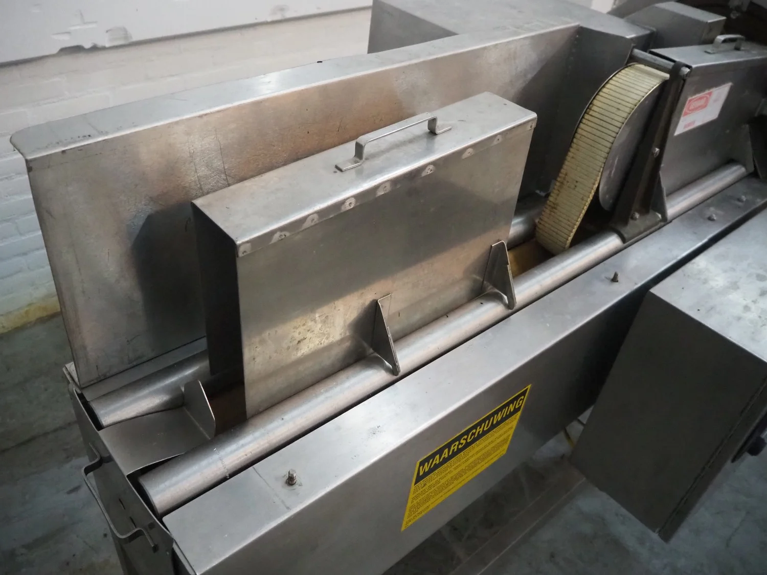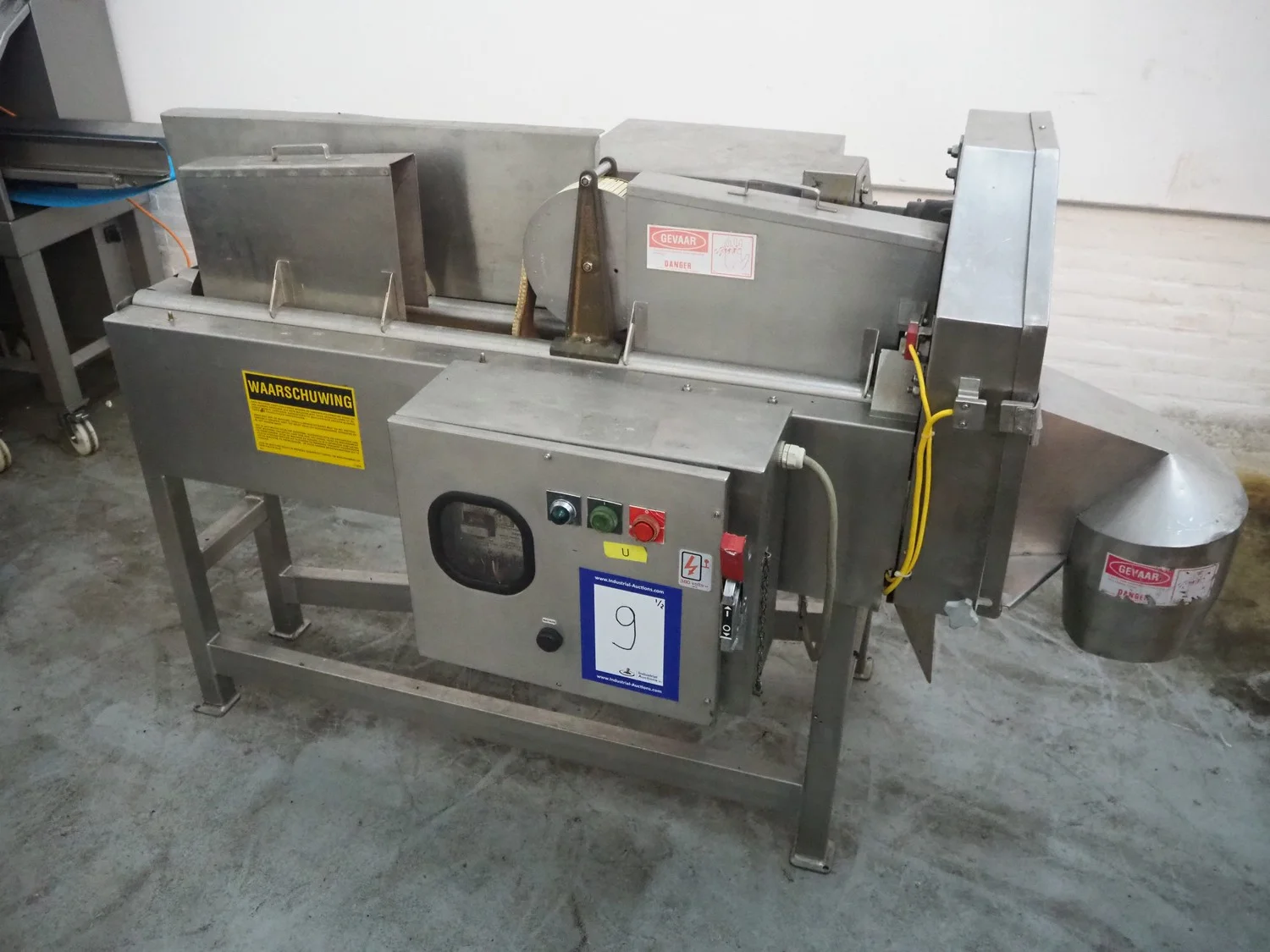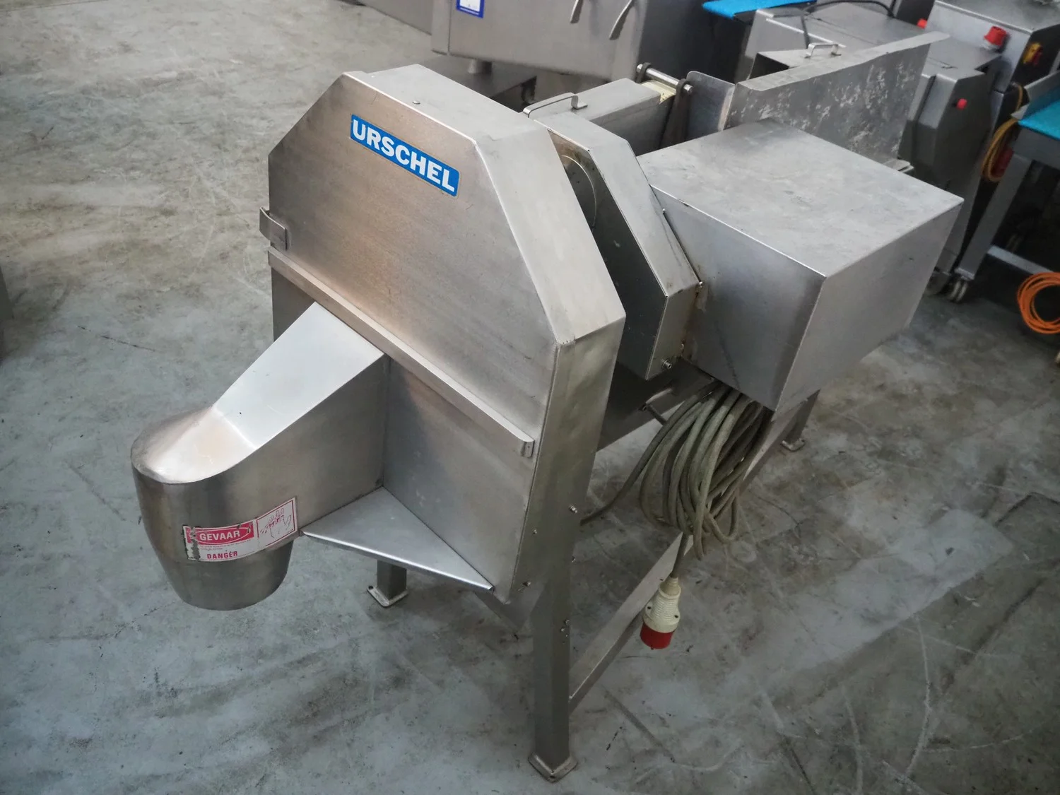 Urschel slicer with down holder, type: OV, serial number: 1054, 400 V, 3 Ph, plastic infeed belt, distance between slicers: 70 mm, total dimensions: 1850 mm x 950 mm x 1250 mm.