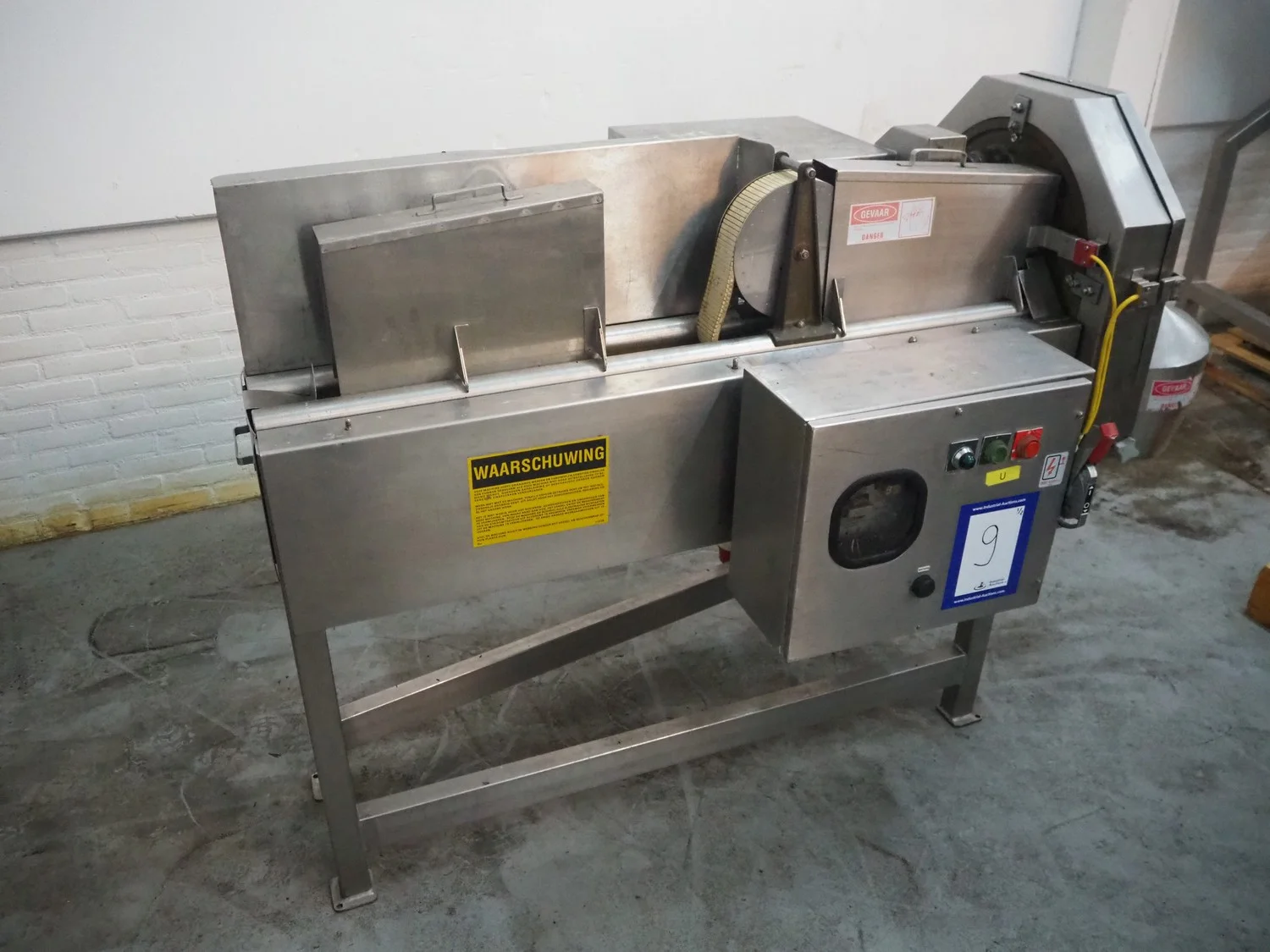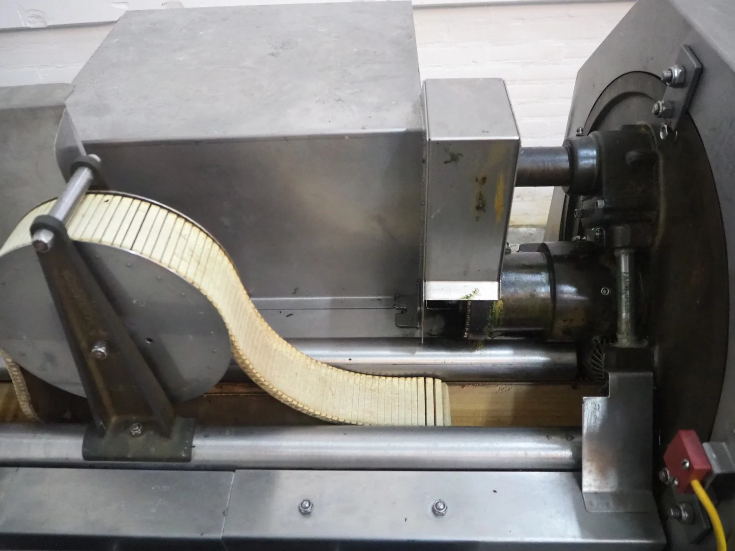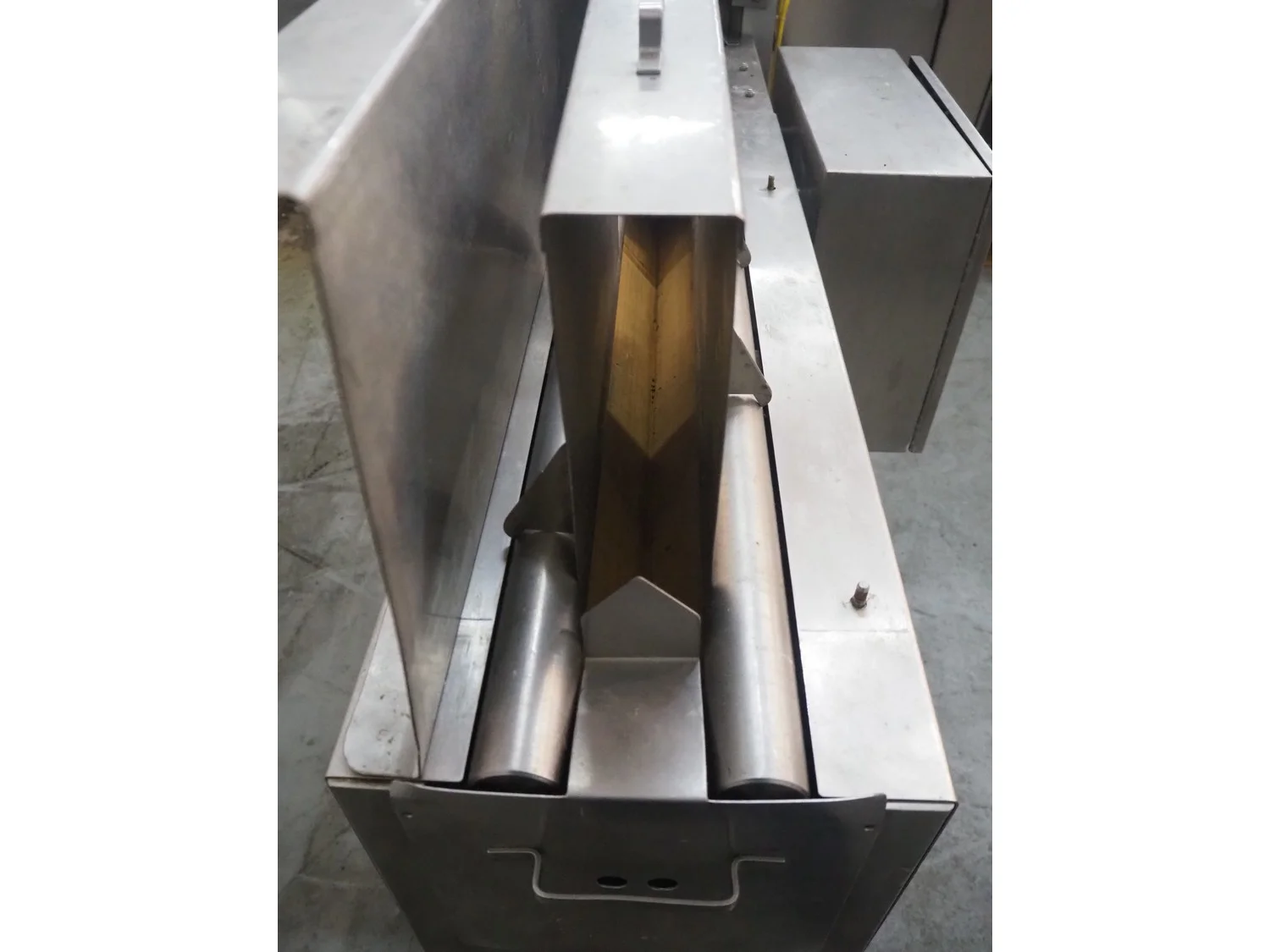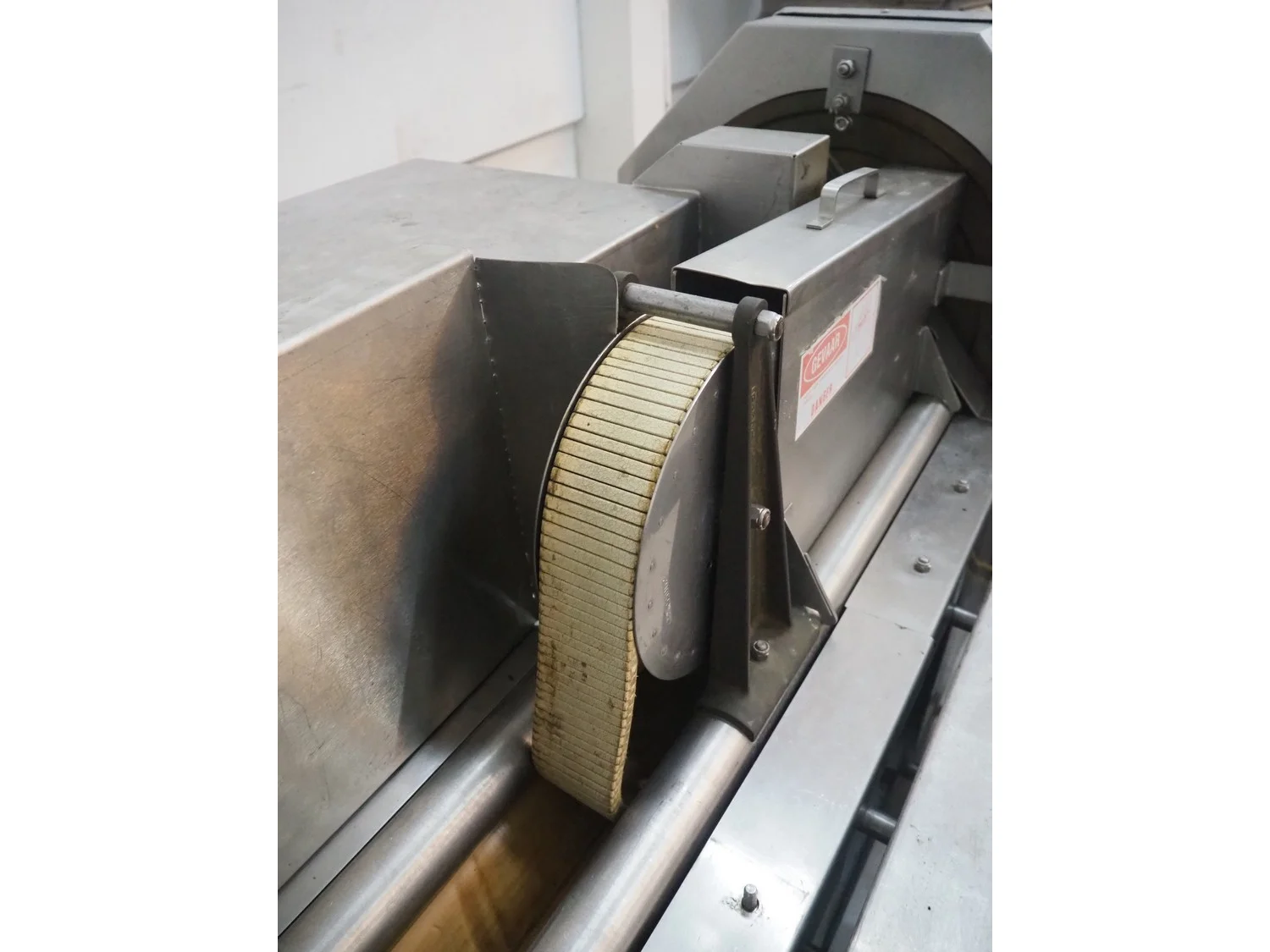 Urschel slicer with down holder, type: OV, serial number: 1054, 400 V, 3 Ph, plastic infeed belt, distance between slicers: 70 mm, total dimensions: 1850 mm x 950 mm x 1250 mm.