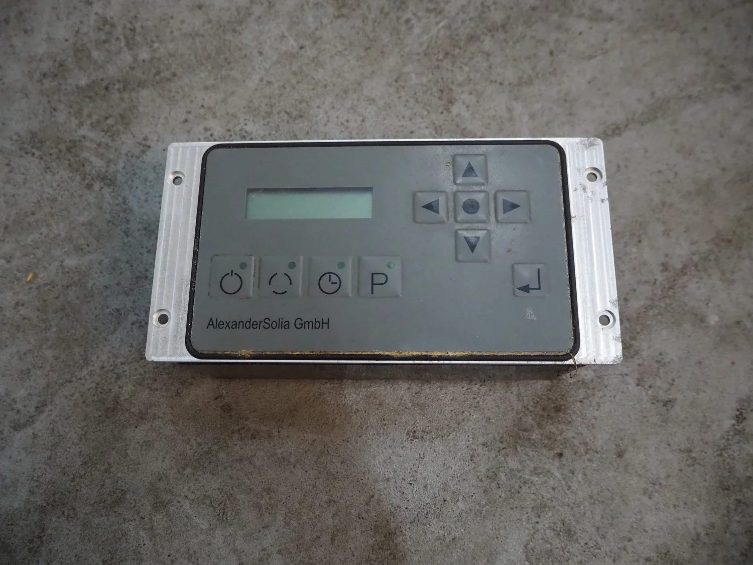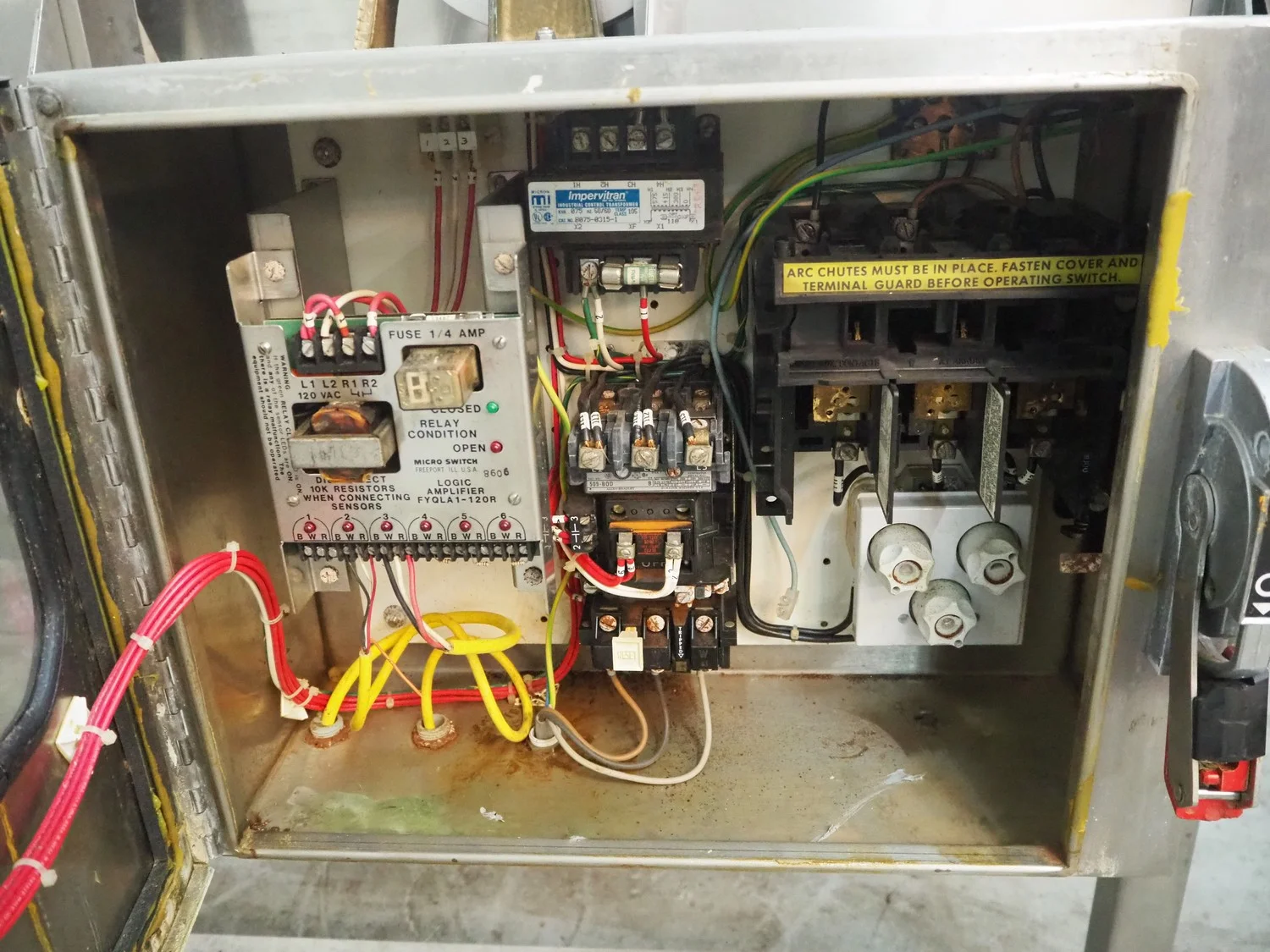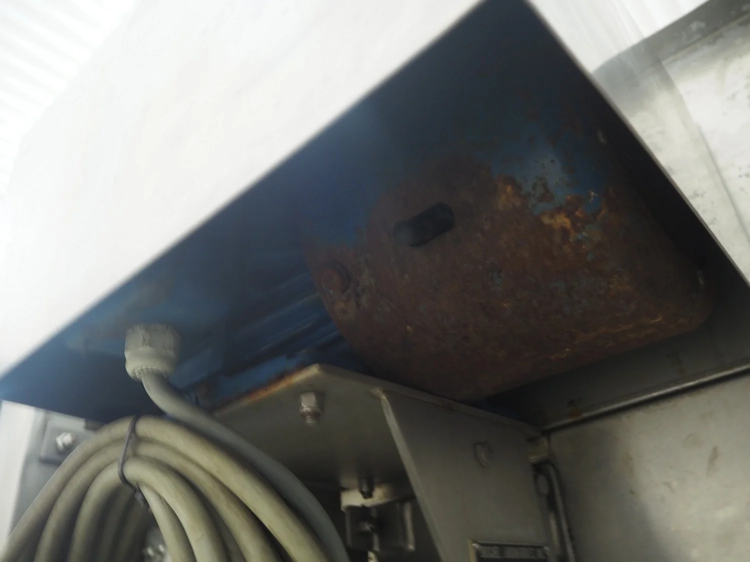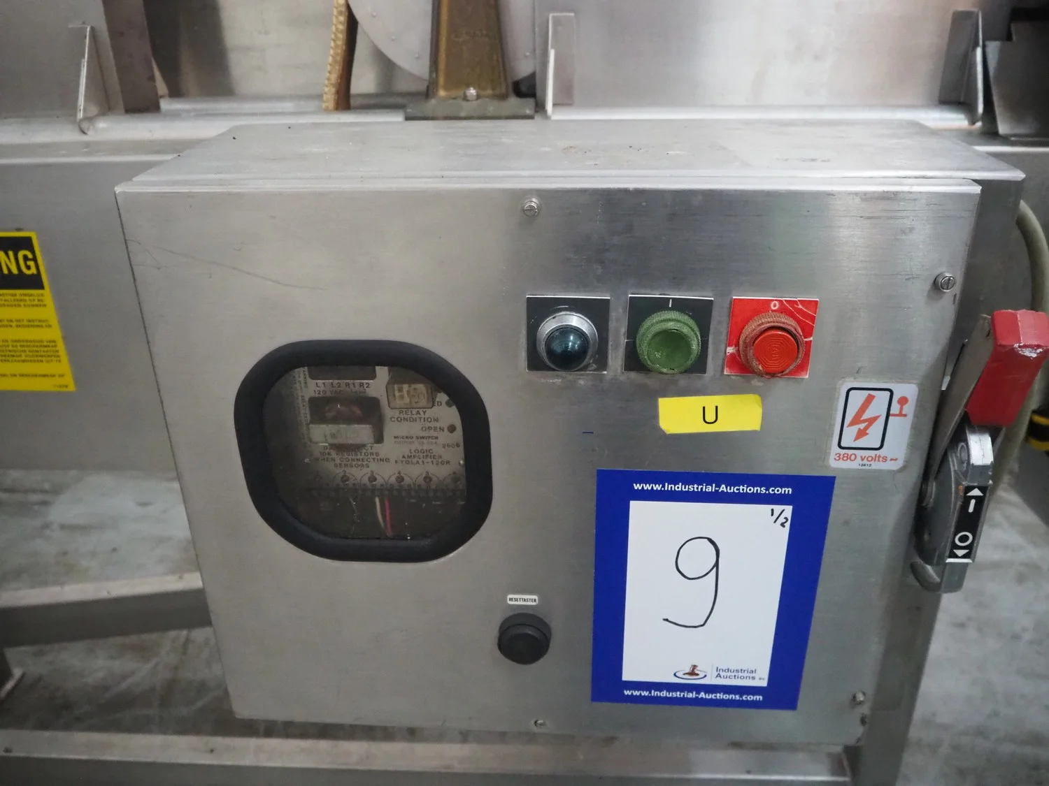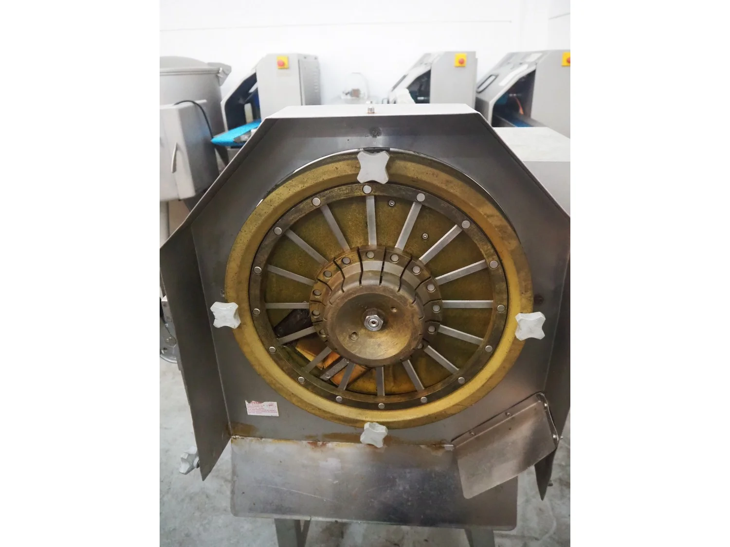 Urschel slicer with down holder, type: OV, serial number: 1054, 400 V, 3 Ph, plastic infeed belt, distance between slicers: 70 mm, total dimensions: 1850 mm x 950 mm x 1250 mm.