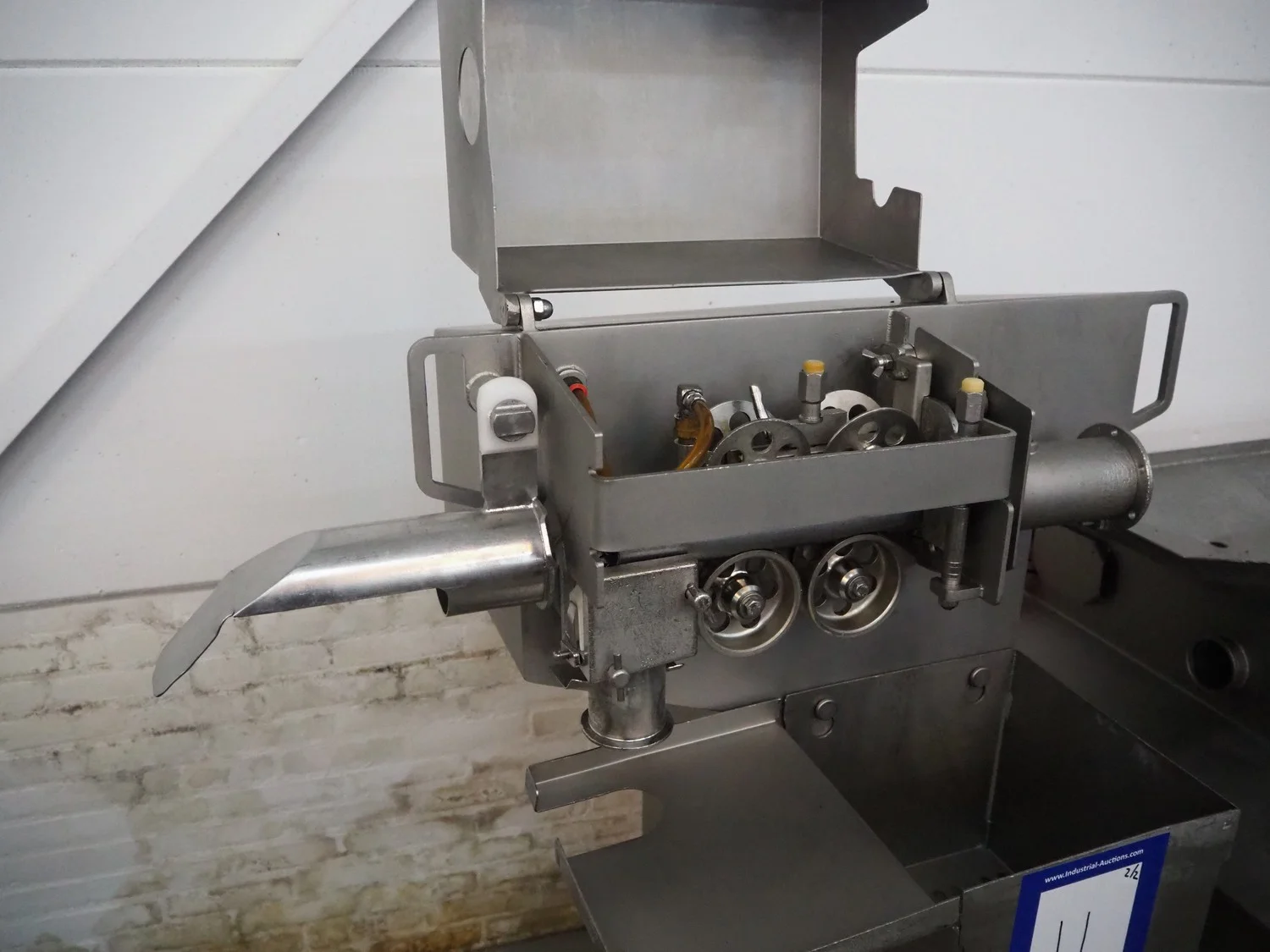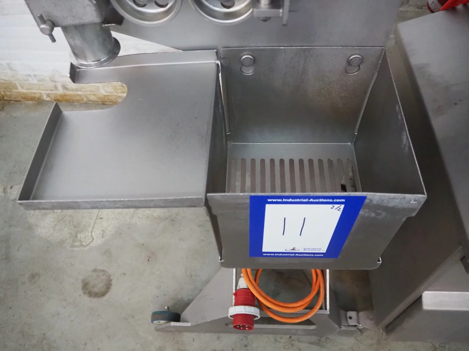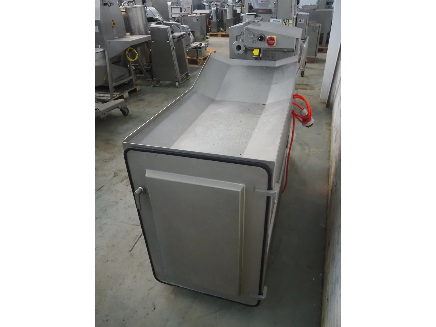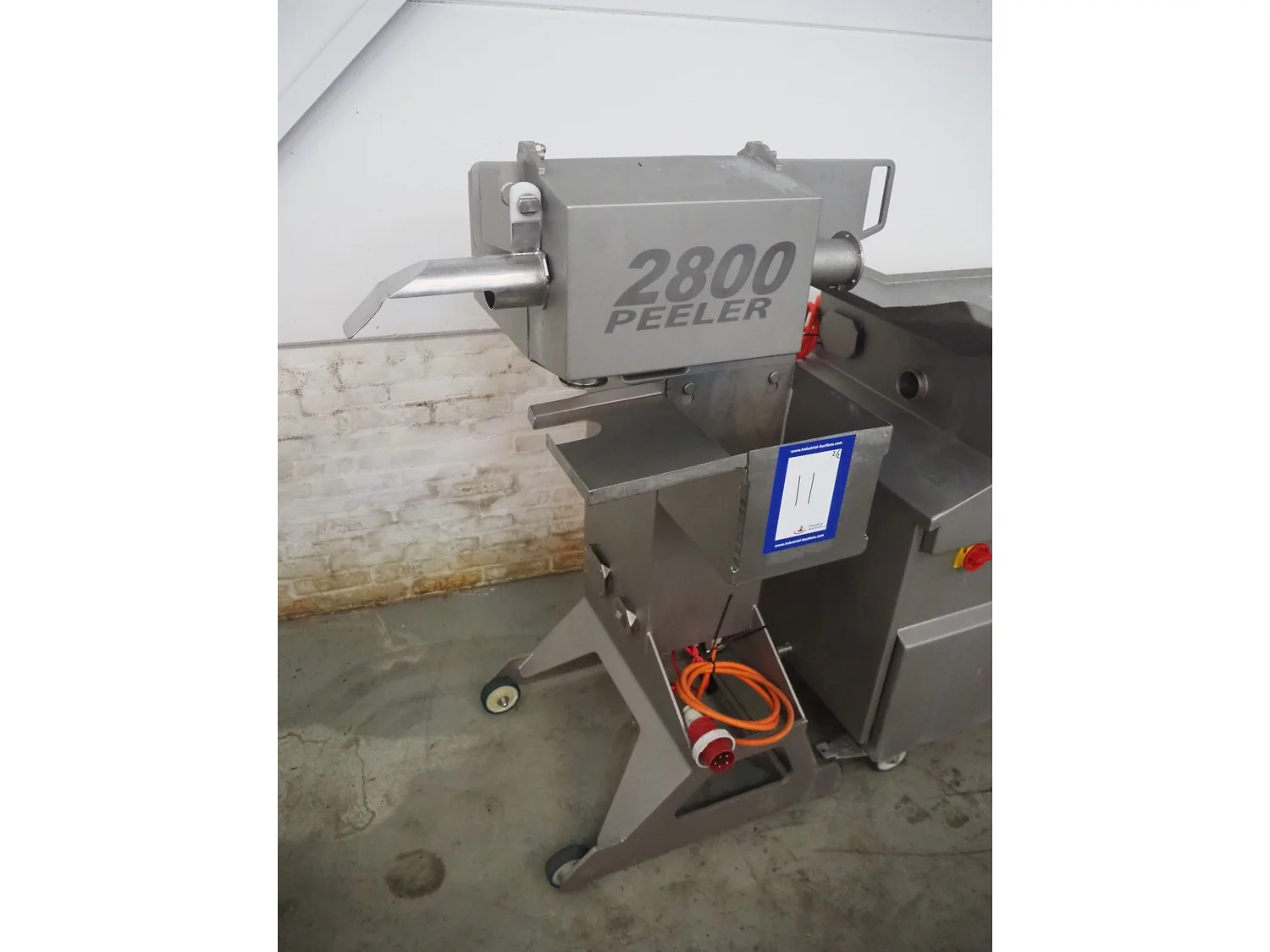 Townsend mobile sausage peeler with infeed table, model: 2800 BL, type: 9833929, serial number: 10401452, year of construction: 2017, 400 V, 3 Ph, 50 Hz, weight: 340 kg, dimensions: 700 mm x 950 mm x 1440 mm and 670 mm x 1350 mm x 1200 mm.