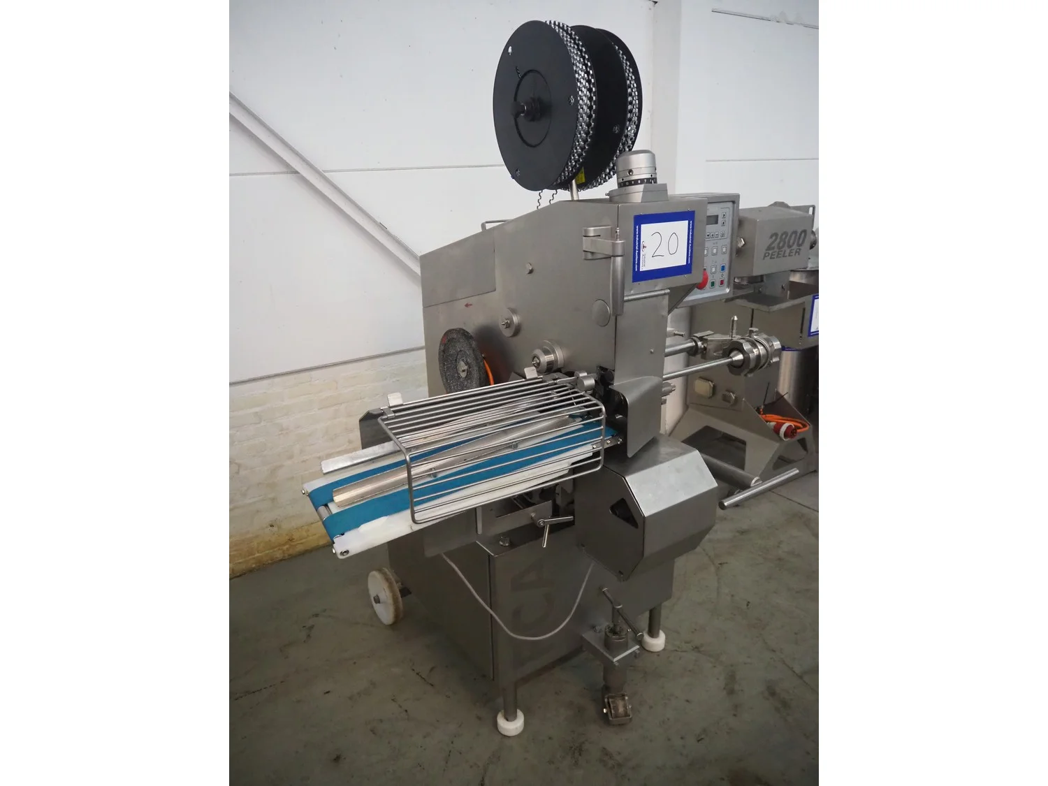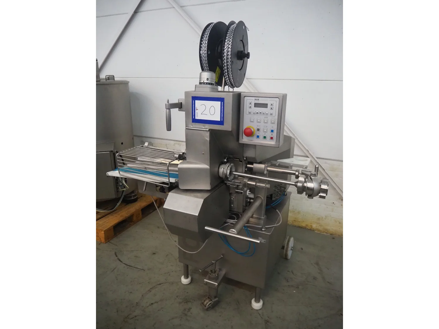 Poly-clip System GmbH & Co.KG mobile double clipper, type: 3430, number: 123, year of construction: 2005, 400 V, 3 Ph, 50 Hz, 5 A, 1 kW, plastic outfeed belt, belt width: (2x) 75 mm, total dimensions: 1550 mm x 1200 mm x 1950 mm.