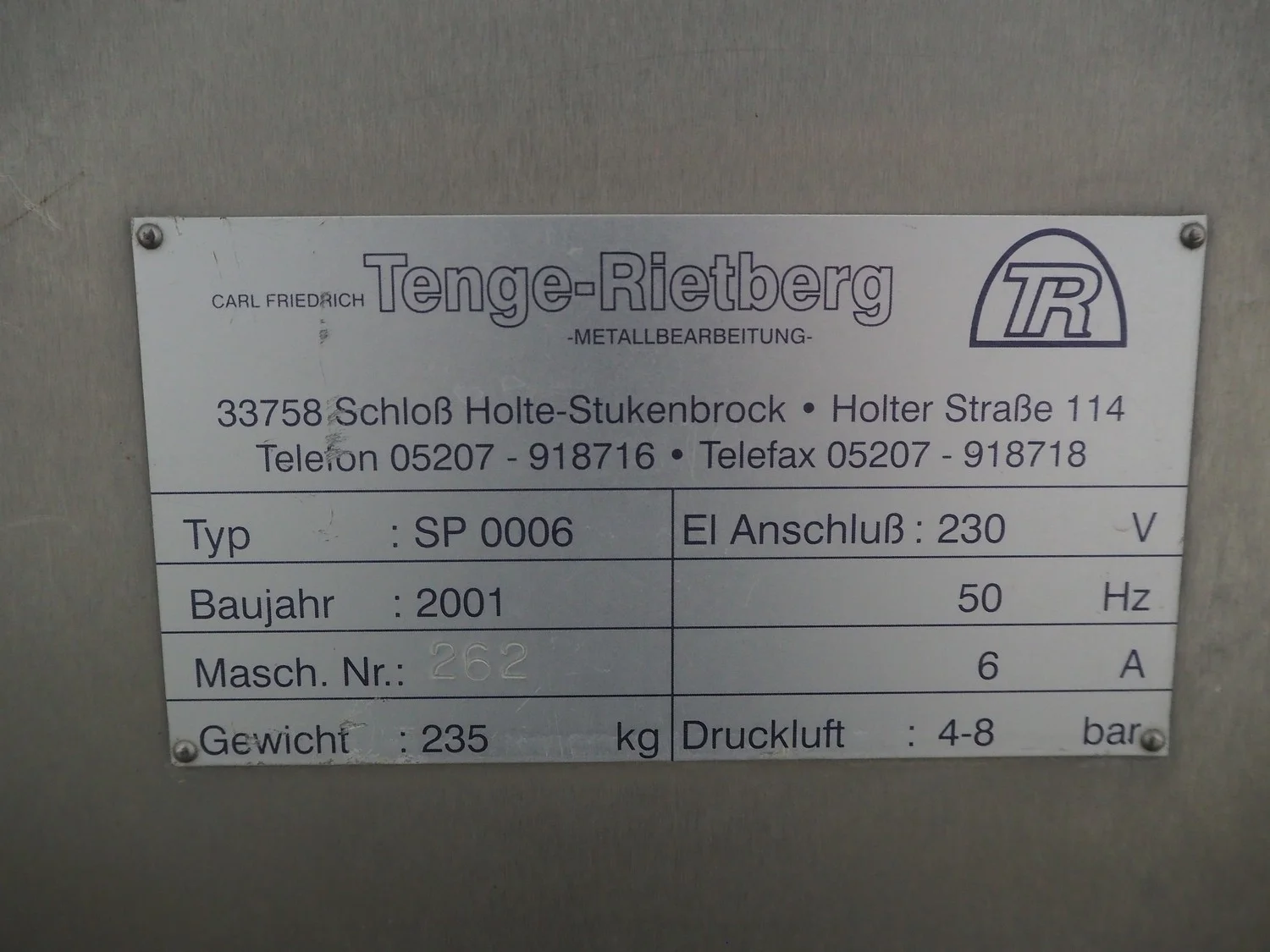 Tenge-Rietberg mobile industrial asparagus peeling machine, type: SP 0006, machine number: 262, year of construction: 2001, 230 V, 50 Hz, 6 A, 235 kg, 4-8 bar, dimensions: 2020 mmx 1000 mm x 1500 mm.