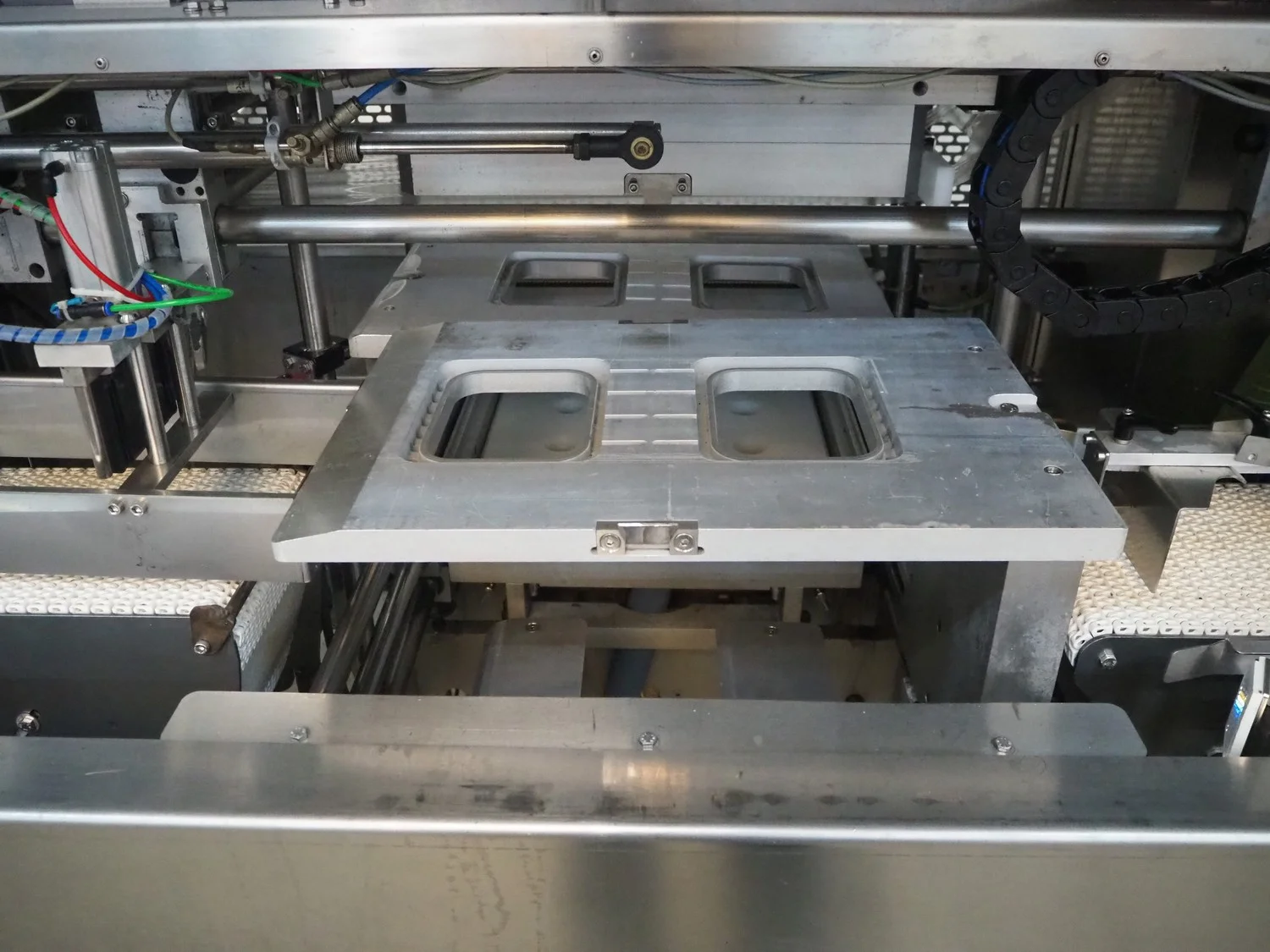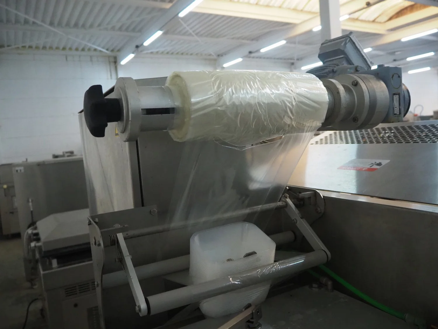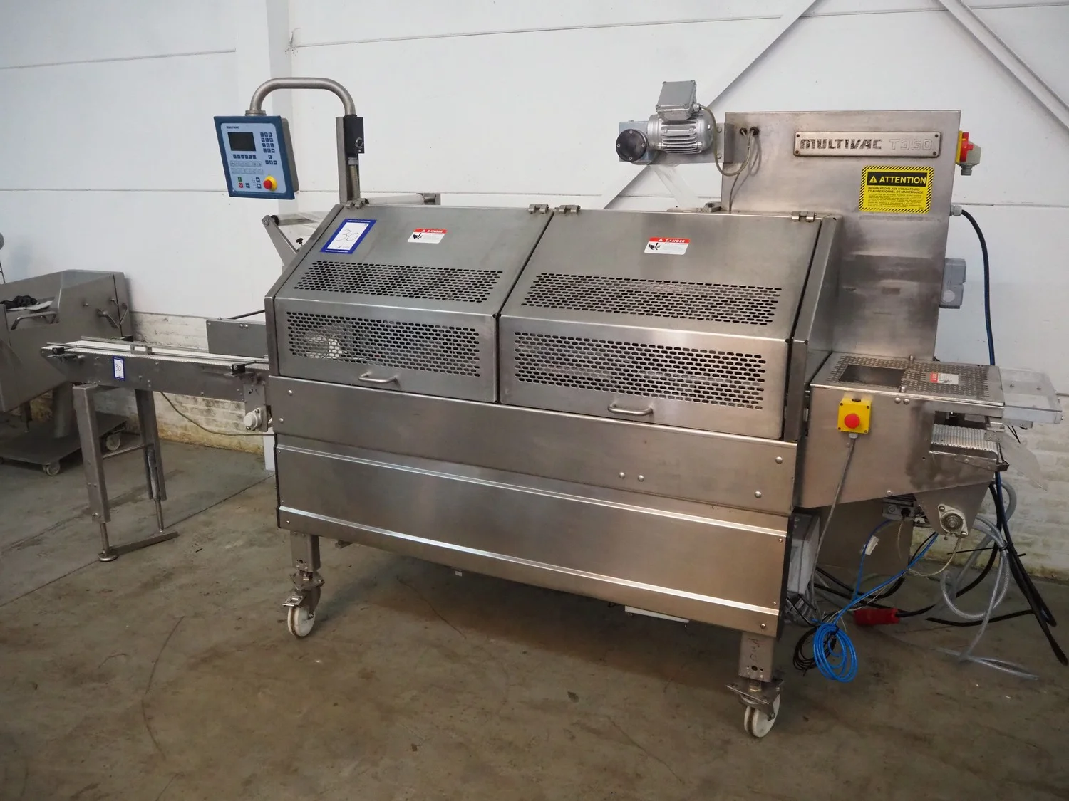 Multivac mobile traysealer, type: T350, serial number: 15, year of construction: 2004, 400 V, 3 Ph, 50 Hz, 30 A, 7.5 kW, film width: 280 mm, plastic mesh belt, belt width: 200 mm, dimensions dye: (2x) 135 mm x 170 mm, total dimensions: 3900 mm x 1200 mm x 2100 mm. Missing vacuum pump.