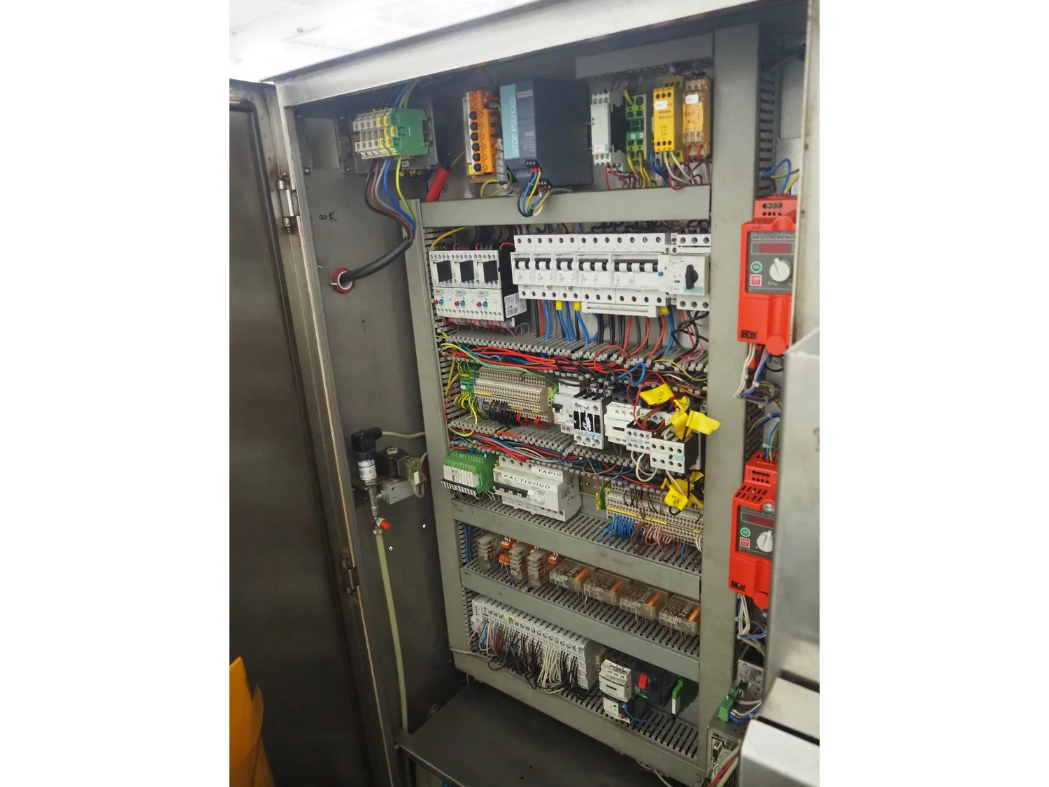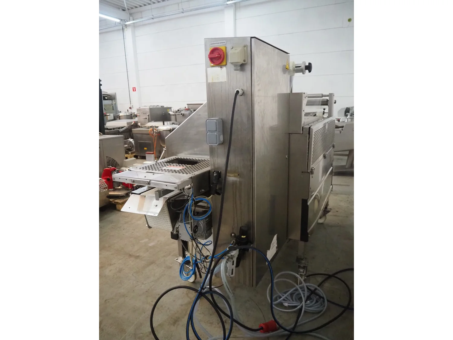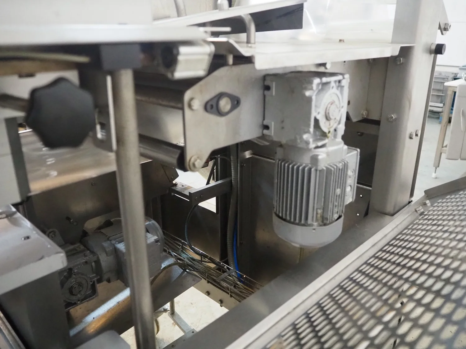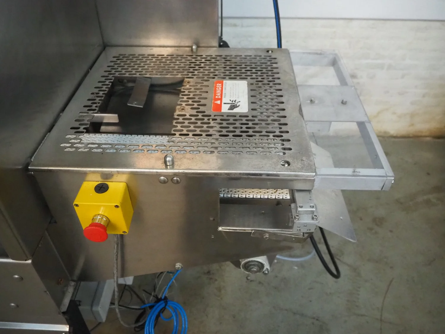 Multivac mobile traysealer, type: T350, serial number: 15, year of construction: 2004, 400 V, 3 Ph, 50 Hz, 30 A, 7.5 kW, film width: 280 mm, plastic mesh belt, belt width: 200 mm, dimensions dye: (2x) 135 mm x 170 mm, total dimensions: 3900 mm x 1200 mm x 2100 mm. Missing vacuum pump.