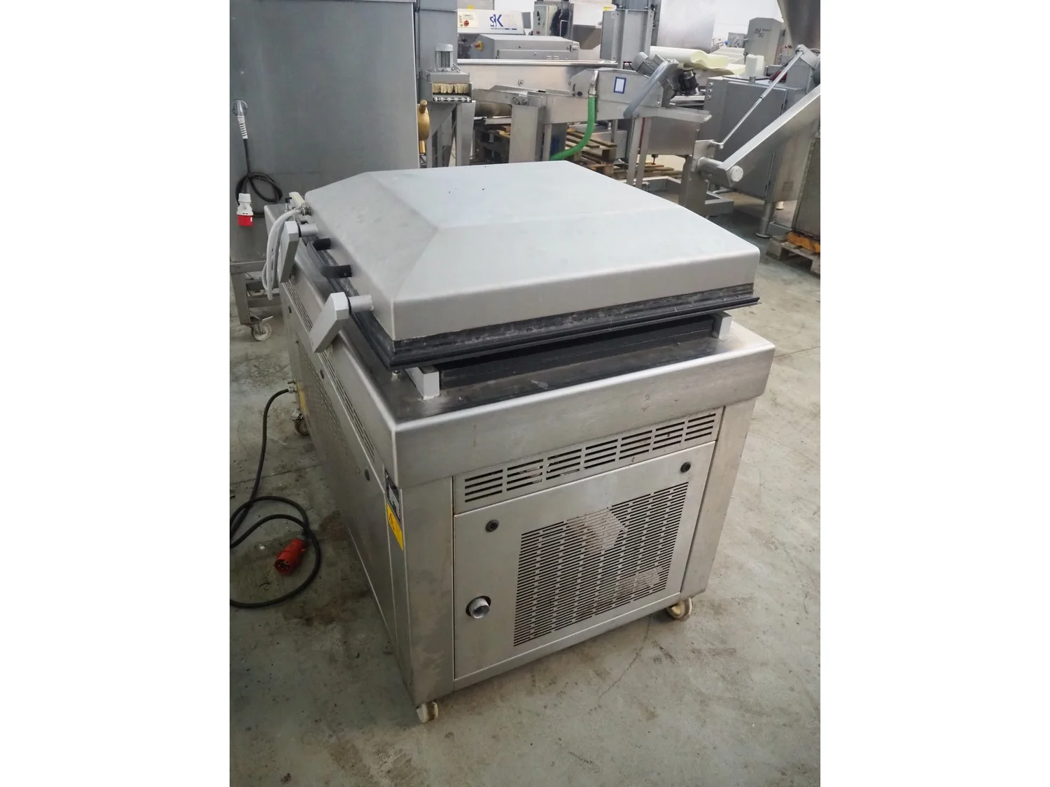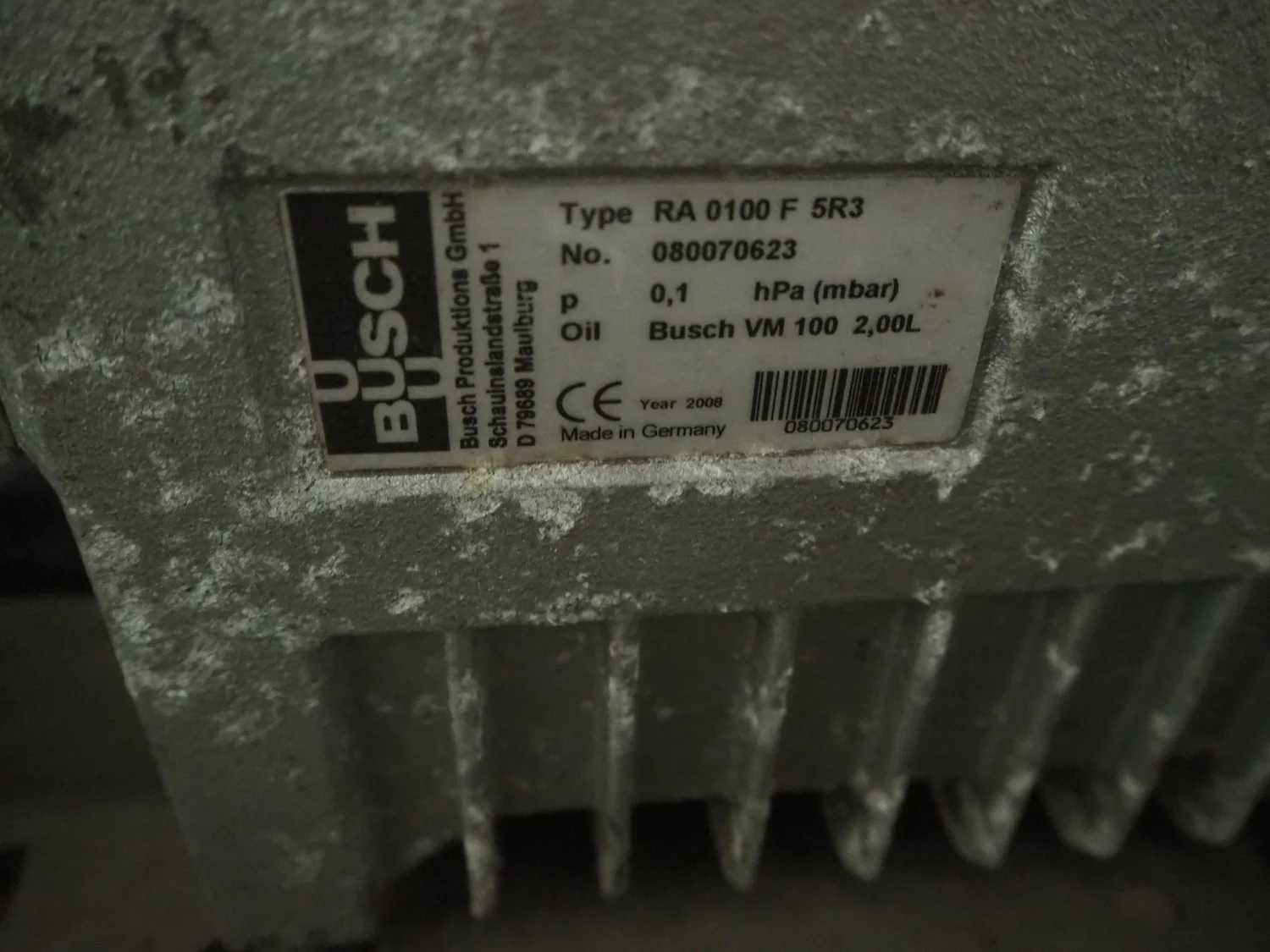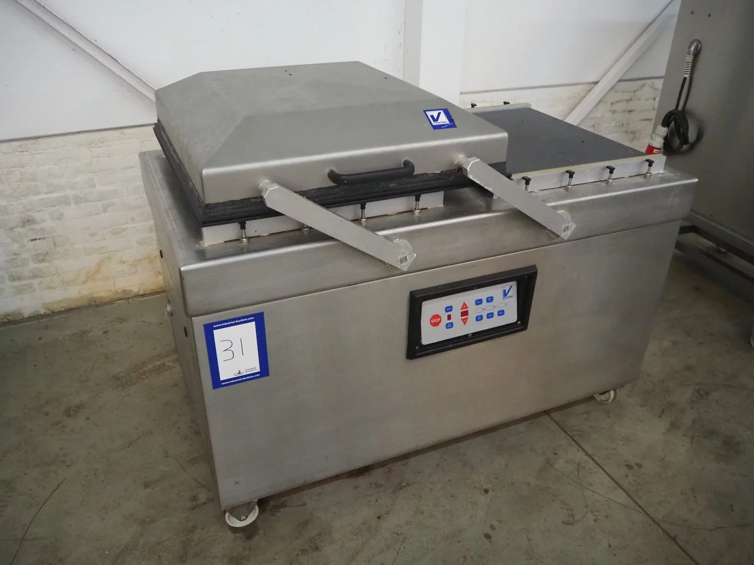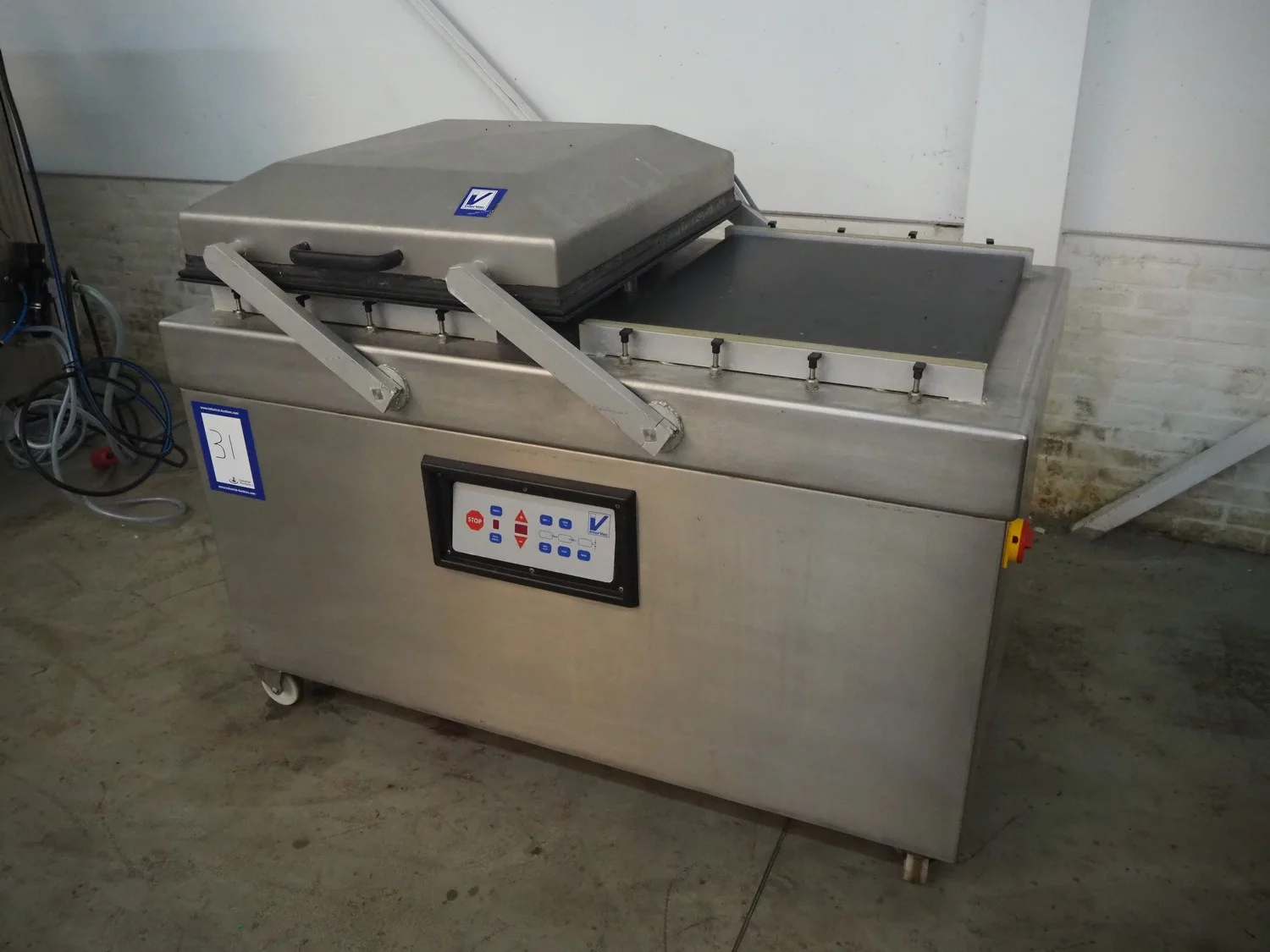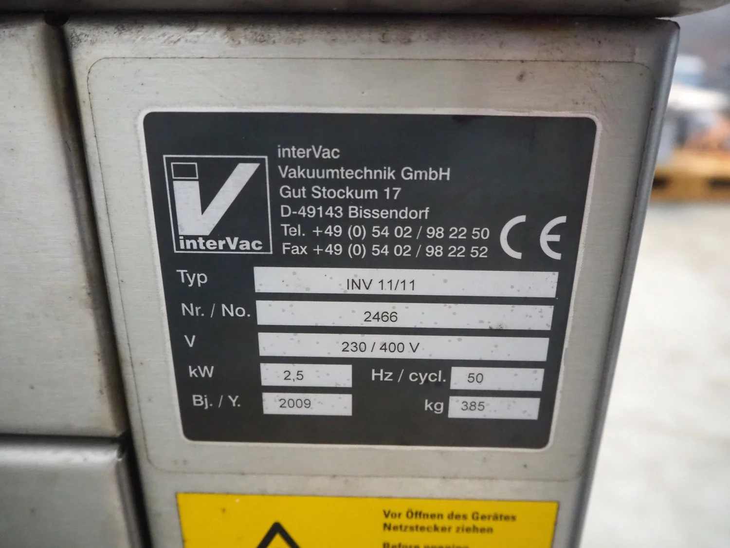 Intervac mobile double chamber vacuum machine, type: INV 11/11, number: 2466, year of construction: 2009, 230/400 V, 50 Hz, 2.5 kW, weight: 385 kg, seal length: (4x) 620 mm, dimensions chamber: (2x) 620 mm x 665 mm, Busch vacuum pump, type: RA 0100 F 5R3, year of construction: 2008, capacity: 100 m³ per hour, total dimensions: 1560 mm x 900 mm x 1250 mm.