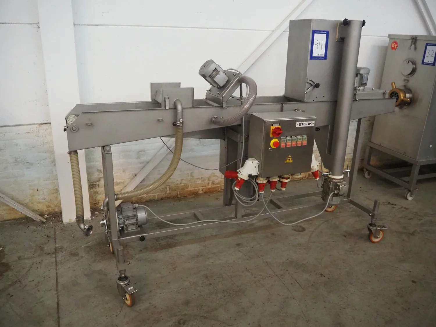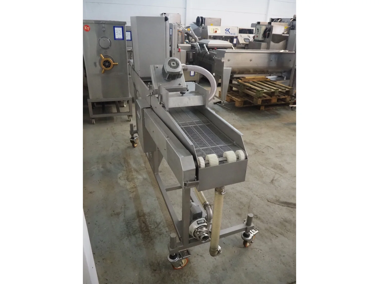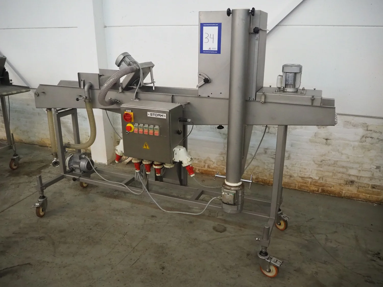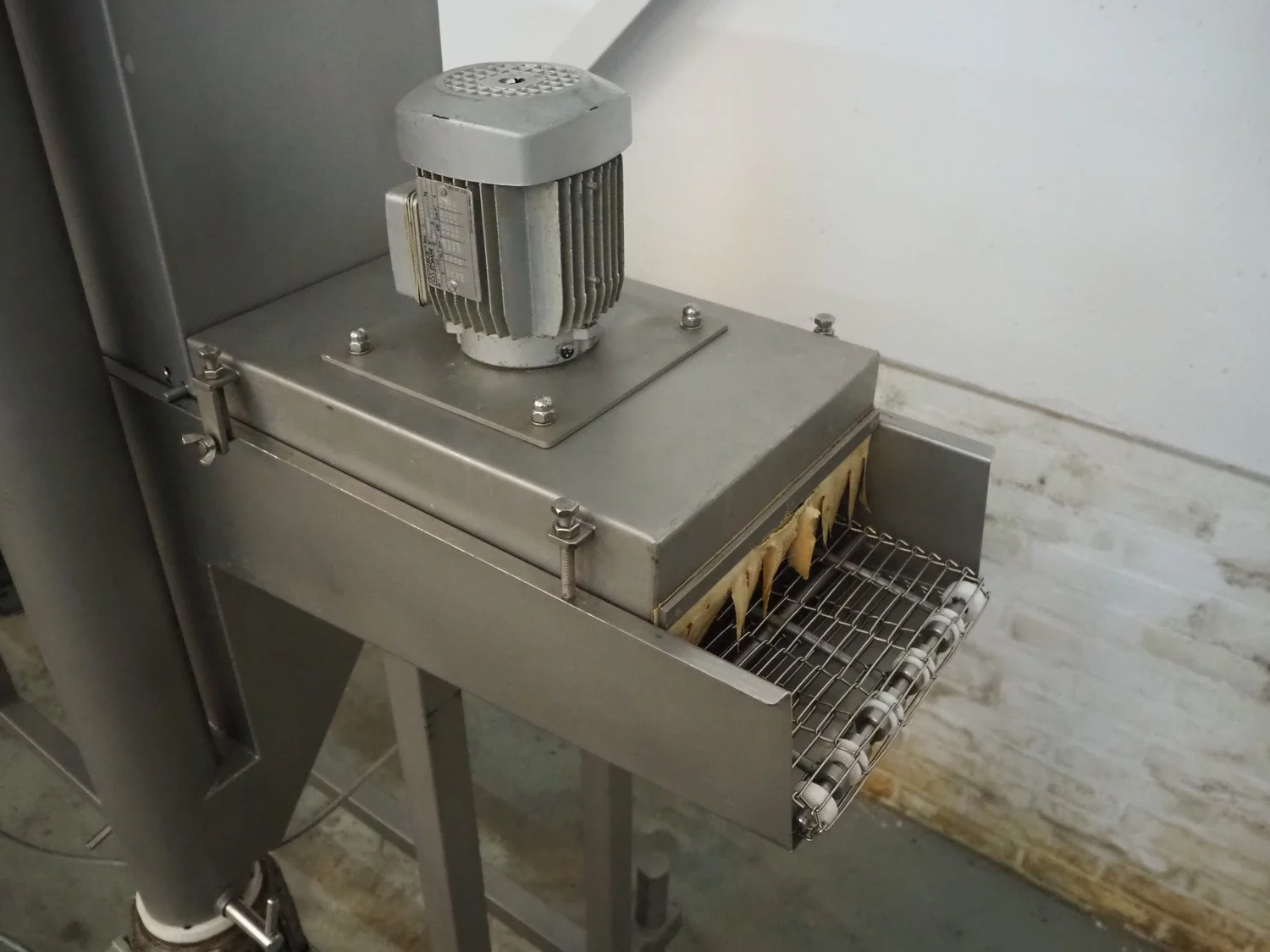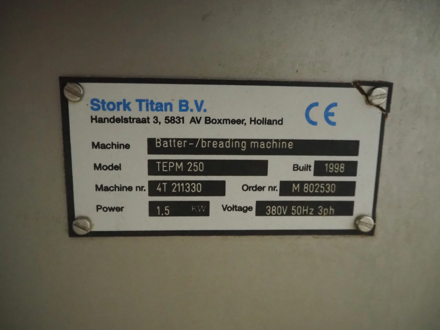 Stork Titan B.V. mobile breading machine, model: TEPM 250, machine number: 4T 211330, year of construction: 1998, 380 V, 3 Ph, 50 Hz, 1.5 kW, s/s mesh belt, belt width: 250 mm, total dimensions: 2500 mm x 700 mm x 1670 mm.