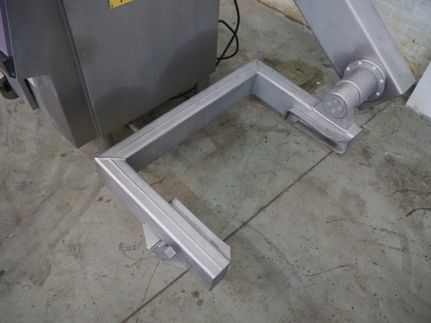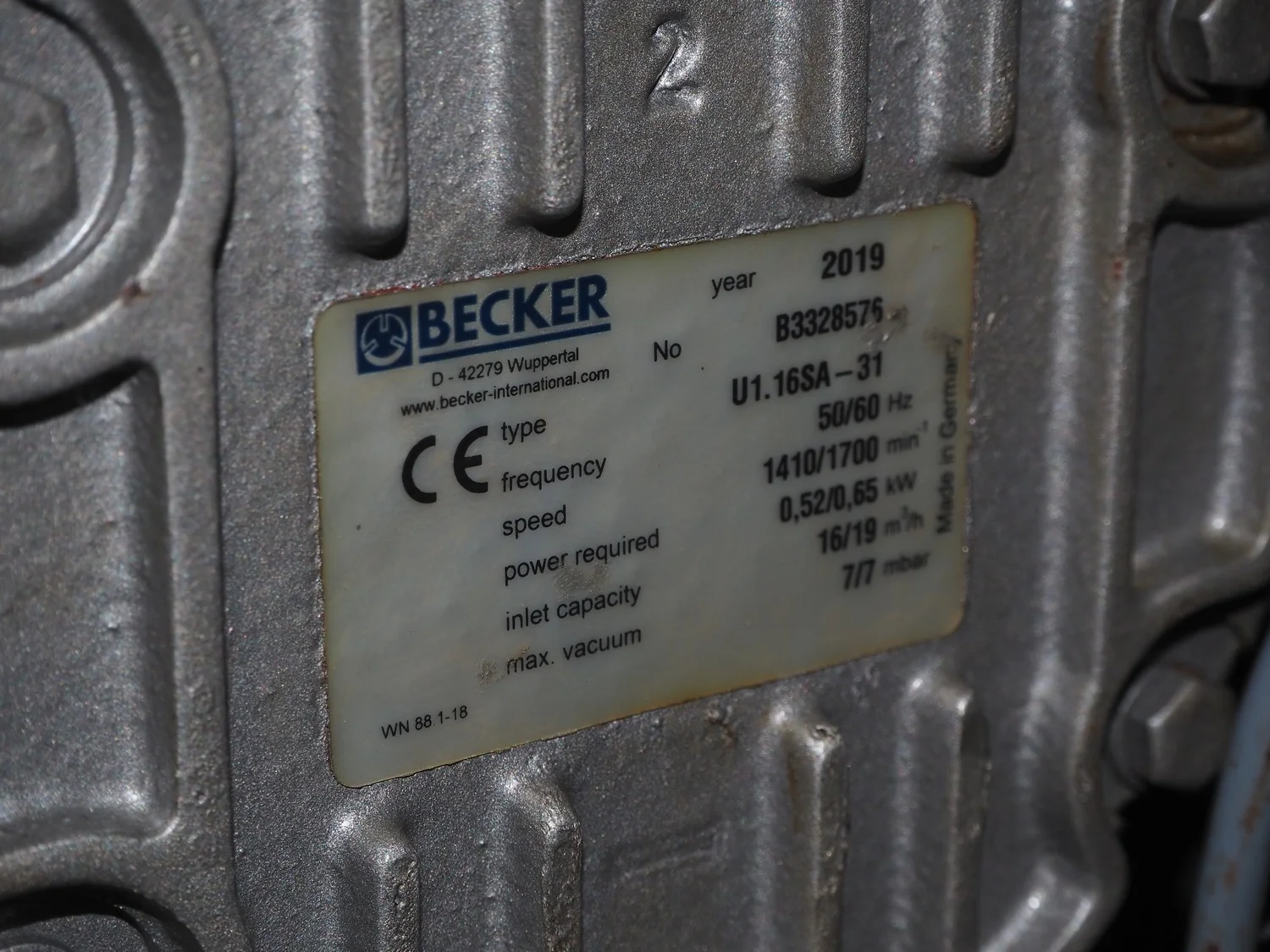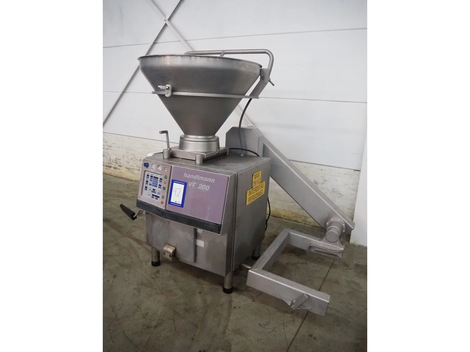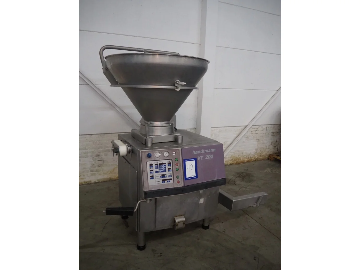 Handtmann vacuum filling machine with lifter for 200 liter meat bins, type: VF200B, year of construction: 1991, Becker vacuum pump, type: U 1.16SA-31, number: B3328576, year of construction: 2019, 50/60 Hz, 0.52/0.65 kW, capacity: 16/19 m³ per hour, with linking attachment, type: 34-4, number: 1665, dimensions: 1600 mm x 1300 mm x 1900 mm.