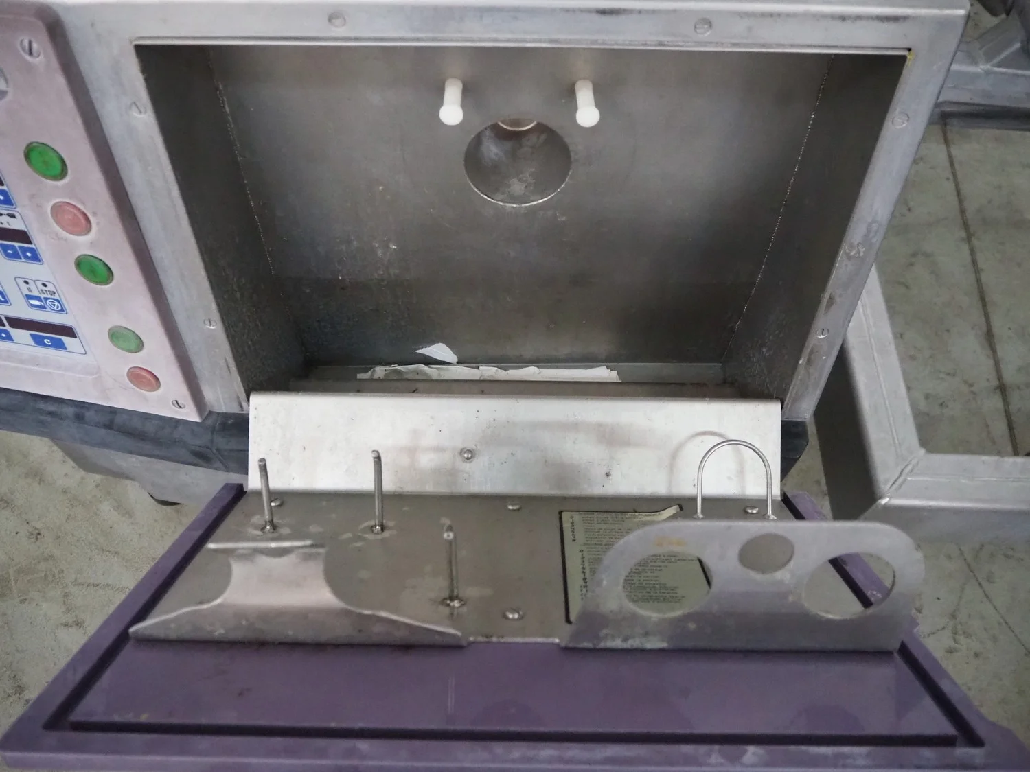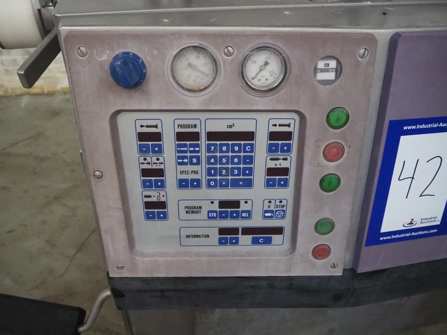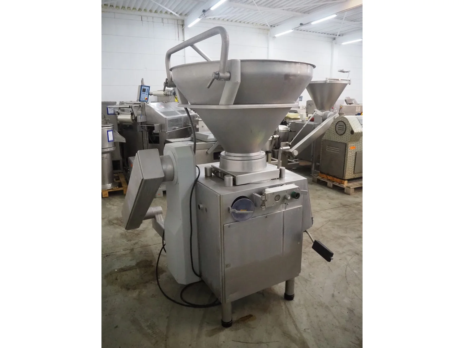 Handtmann vacuum filling machine with lifter for 200 liter meat bins, type: VF200B, year of construction: 1991, Becker vacuum pump, type: U 1.16SA-31, number: B3328576, year of construction: 2019, 50/60 Hz, 0.52/0.65 kW, capacity: 16/19 m³ per hour, with linking attachment, type: 34-4, number: 1665, dimensions: 1600 mm x 1300 mm x 1900 mm.