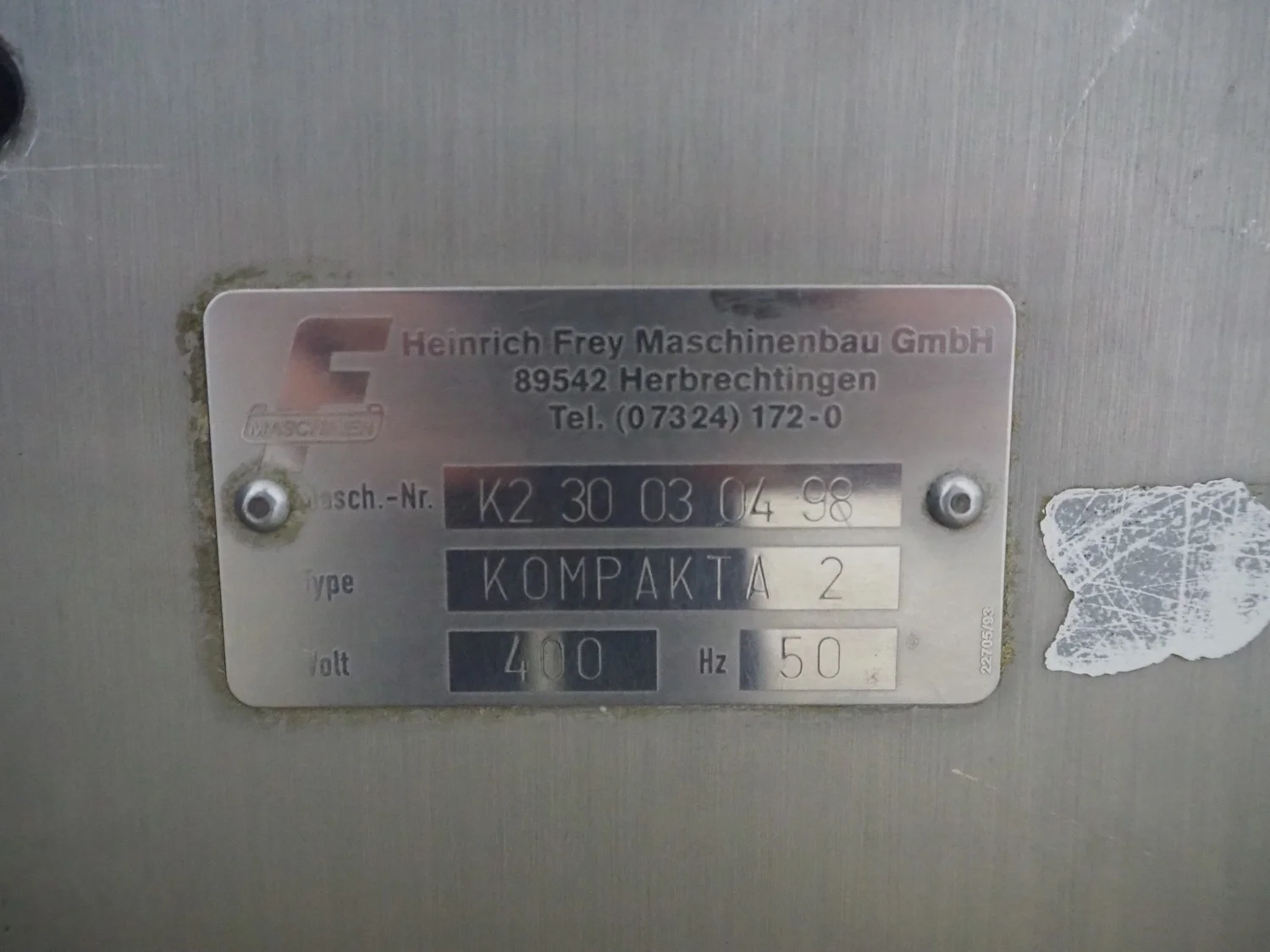 Frey piston filler, type: KOMPAKTA 2, machine number: K2 30 03 04 98, 400 V, 50 Hz, dimensions: 800 mm x 780 mm x 1250 mm.