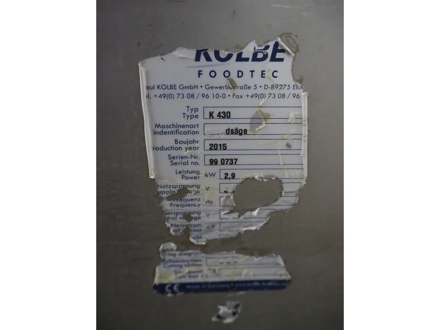 Kolbe mobile bandsaw, type: K 430, serial number: 99 0737, year of construction: 2015, 2.9 kW, weight: 305 kg, dimensions table: 960 mm x 830 mm, working height: 880 mm, total dimensions: 1000 mm x 1000 mm x 1940 mm.
