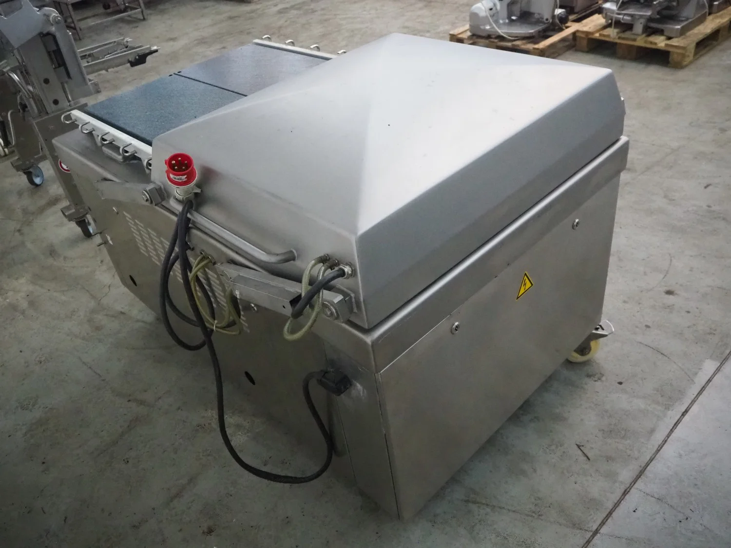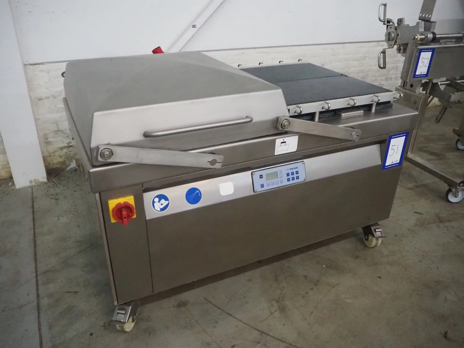 Multivac mobile double chamber vacuum machine, type: C500, serial number: 155219, year of construction: 2011, 400 V, 3 Ph, 50 Hz, 6 kW, 28/32 A, seal length: (4x) 665 mm, dimensions chamber: 850 mm x 700 mm, with Busch vacuum pump, type: RA 0250 D 5Z1 CUZZ, number: C118000044, year of construction: 2011, capacity: 250 m³/h, total dimensions: 1650 mm x 1050 mm x 1350 mm.