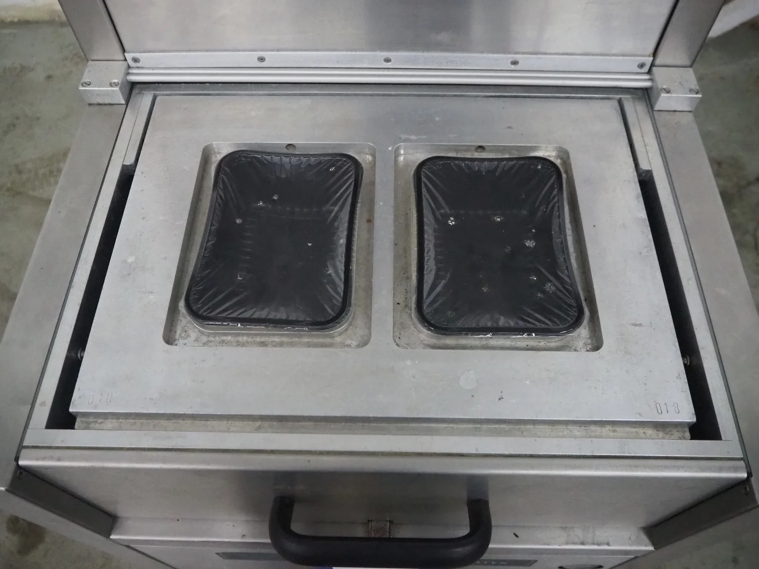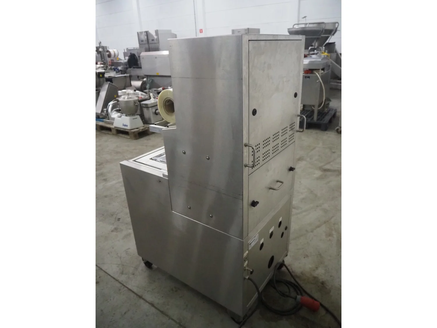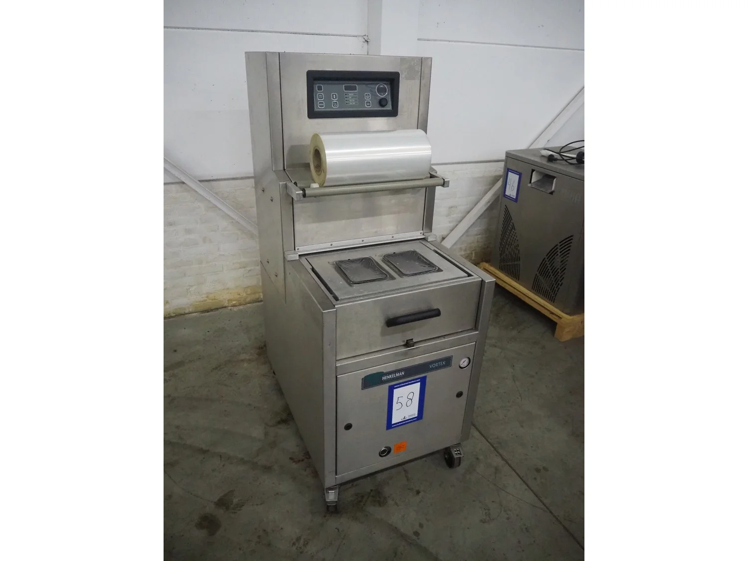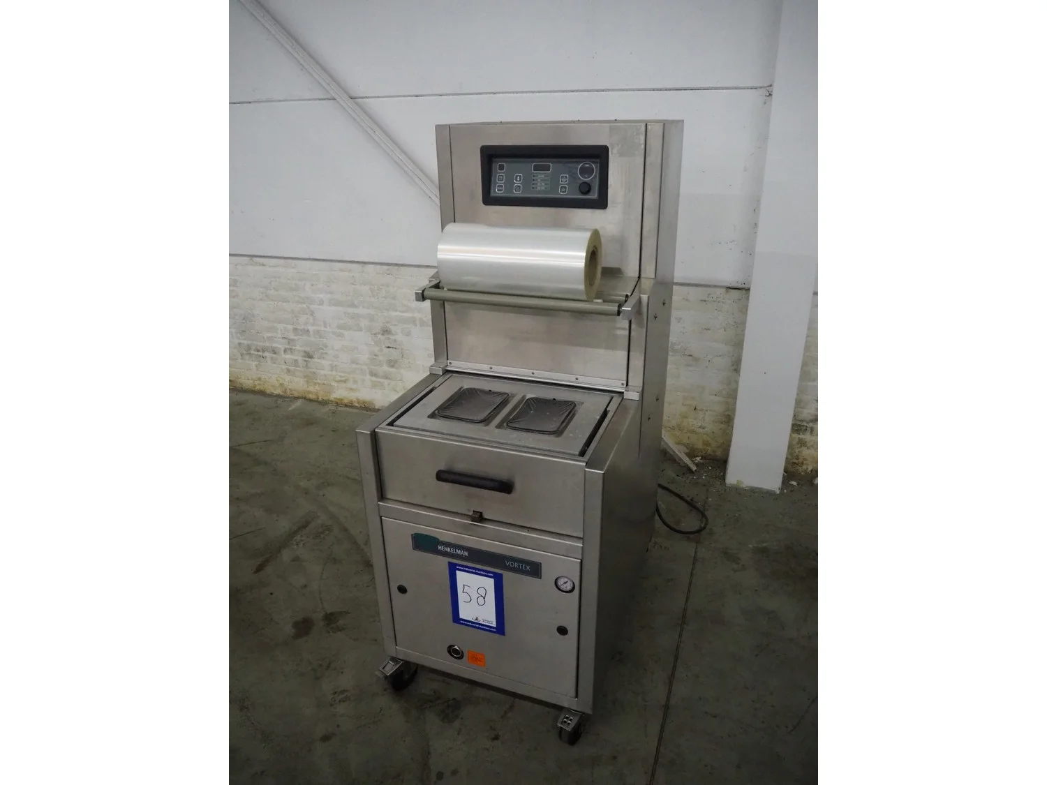 Henkelman mobile traysealer, type: Vortex, machine number: V0812010, year of construction: 2008, mould code: 0721005000, 400 V, 3 Ph, 50 Hz, 4 kW, 6 A, dimensions dye: (2x) 187 mm x 137 mm, Busch vacuum pump, type: RB 0021 B 37.4, year of construction: 2008, capacity: 21 m³ per hour, total dimensions: 930 mm x 600 mm x 1600 mm.