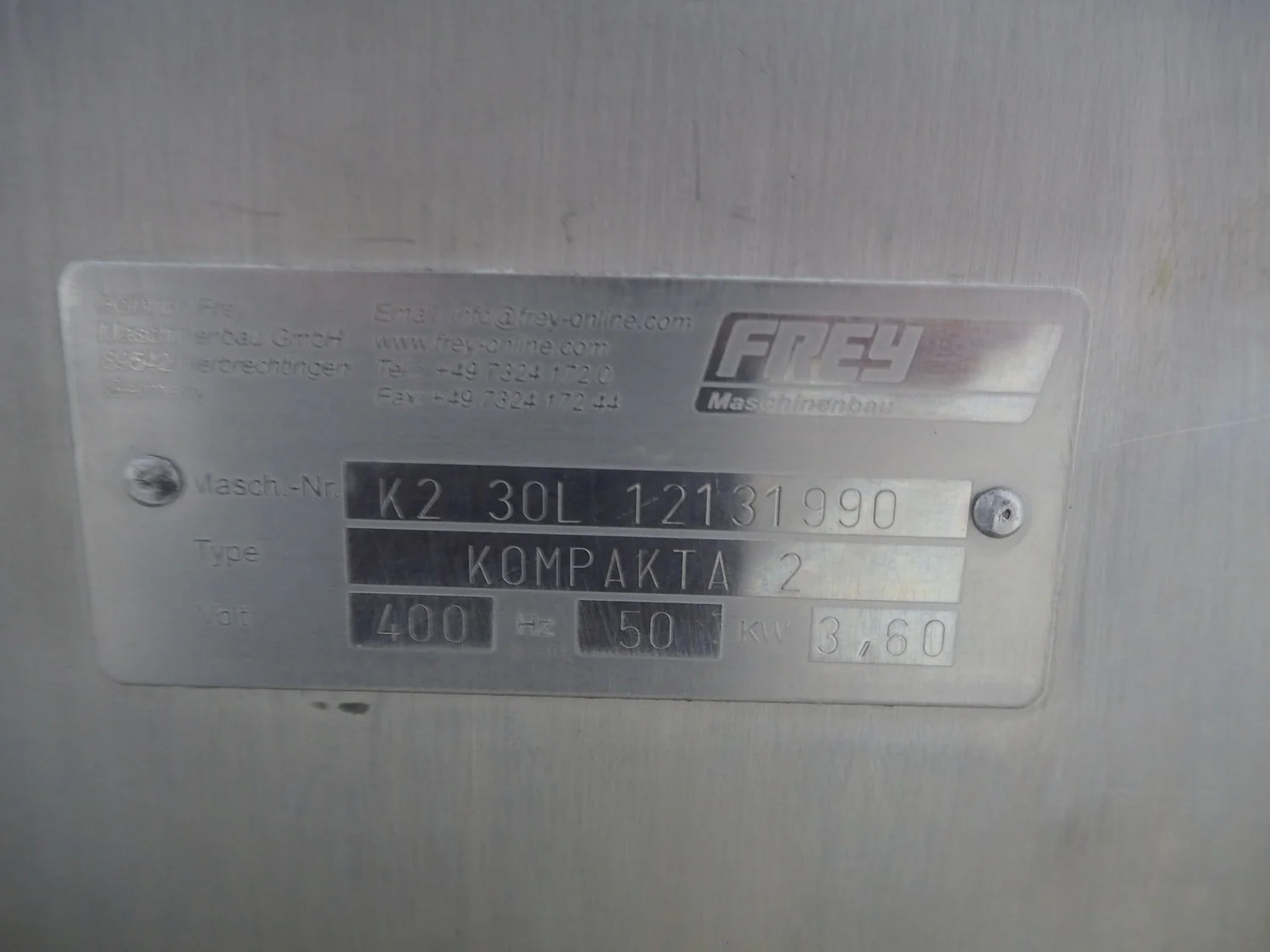 Frey mobile piston filler, type: Kompakta 2, machine number: K2 30L 12131990, 400 V, 50 Hz, 3.60 kW, dimensions: 900 mm x 850 mm x 1250 mm.