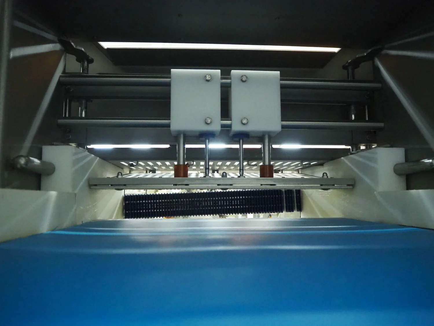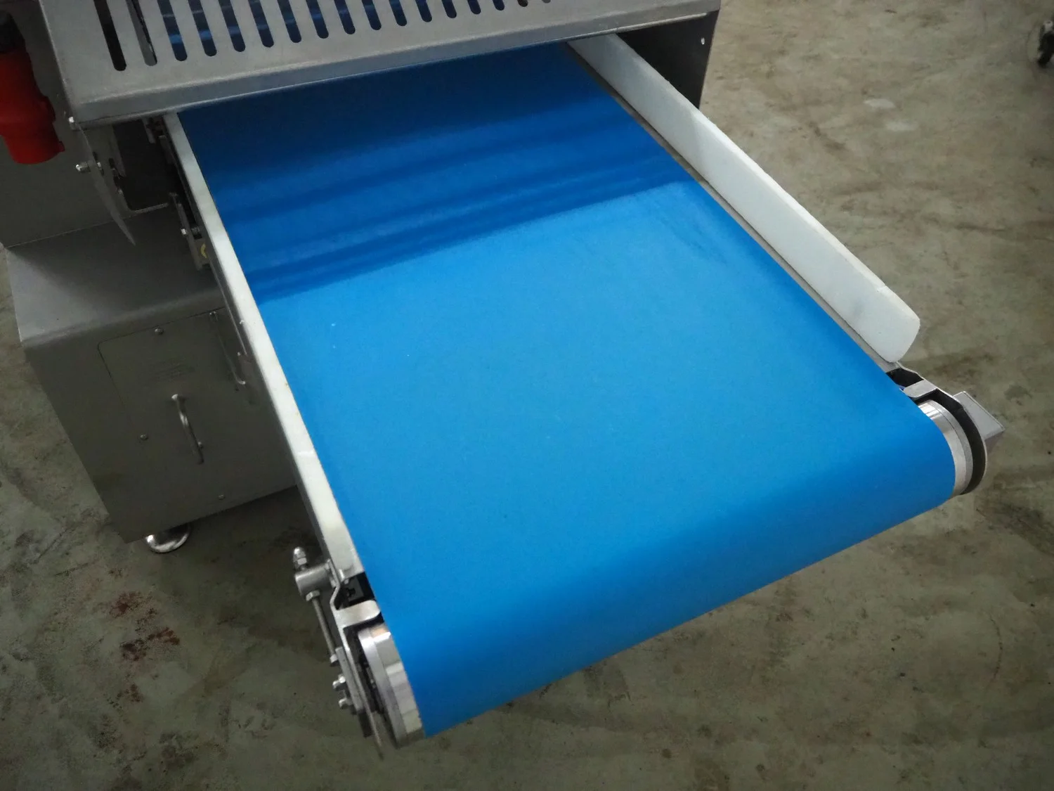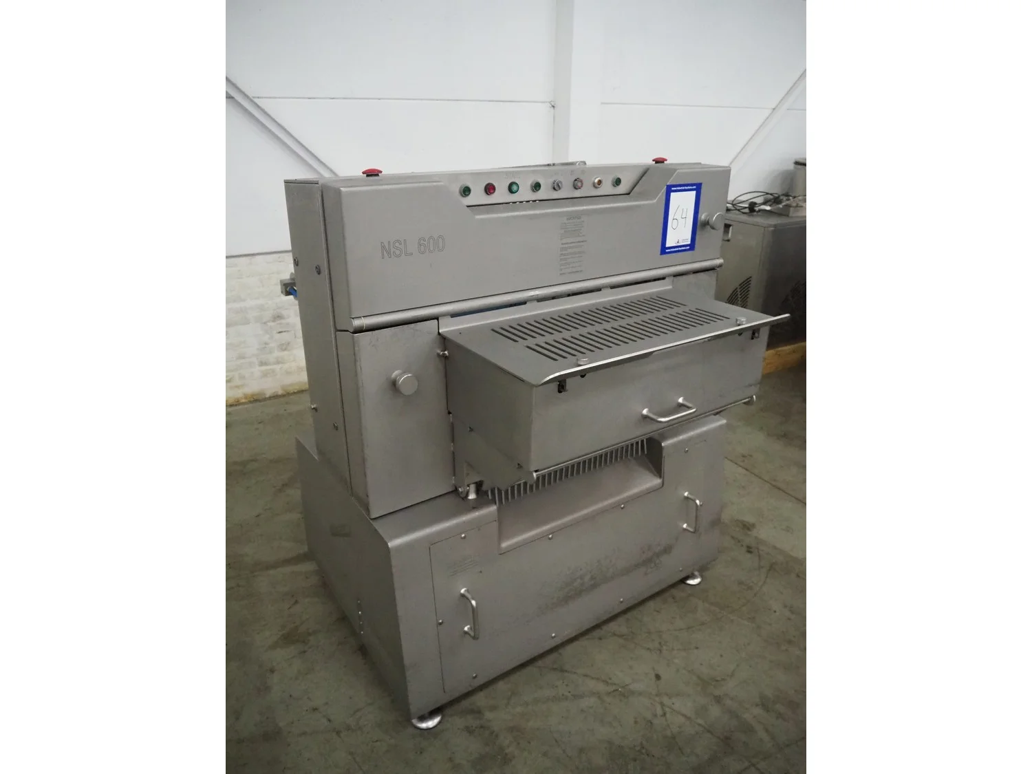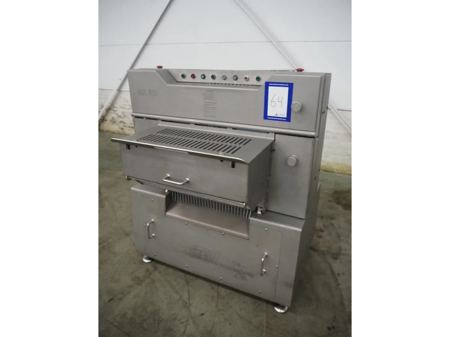 Grasselli slicer, type: NSL 600, number: T10016/457, plastic belt, belt width: 560 mm, distance between knives: 20 mm, total dimensions: 2000 mm x 1200 mm x 1500 mm.