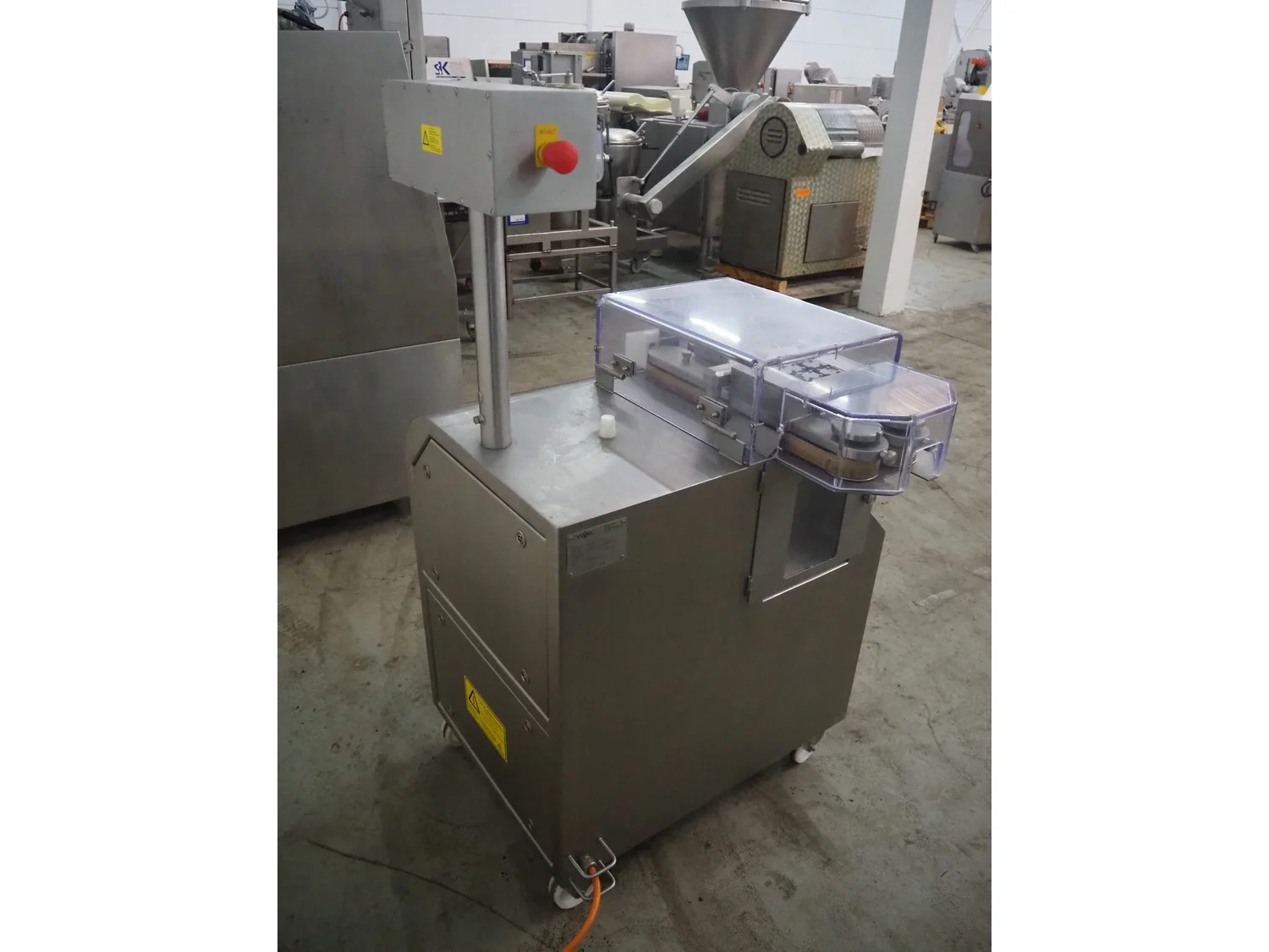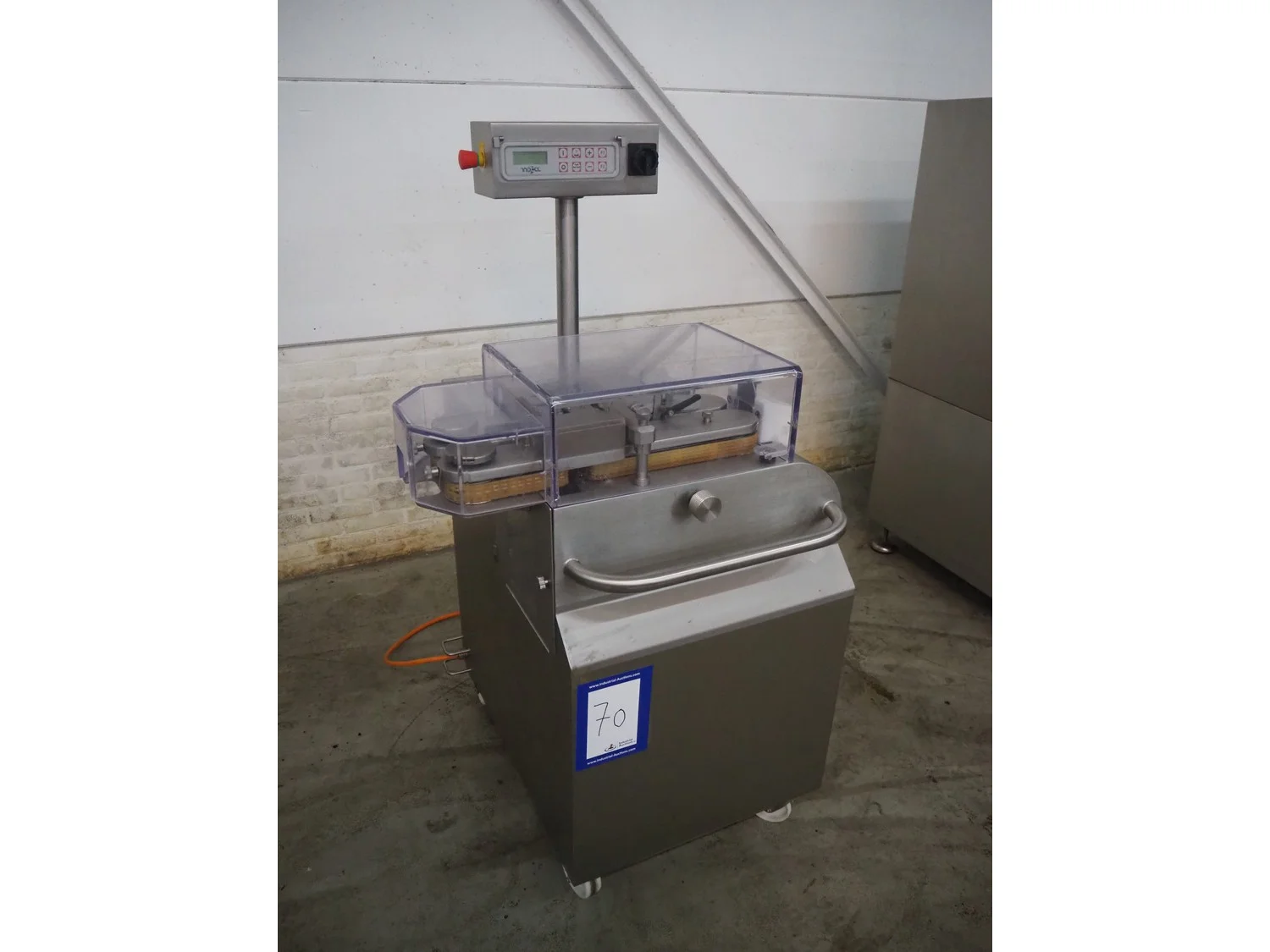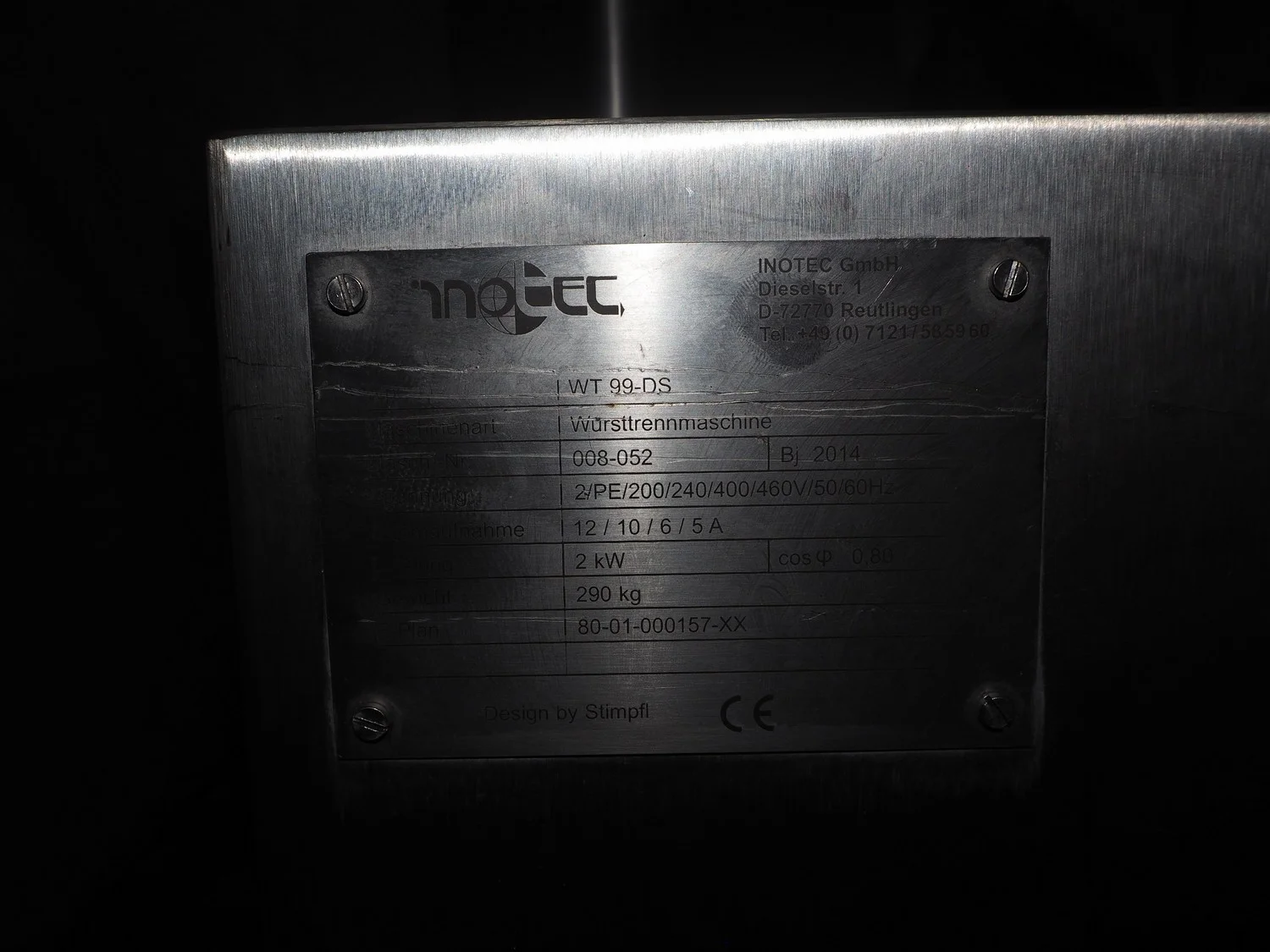 Inotec mobile sausage cutter, type: WT 99-DS, number: 008-052, year of construction: 2014, 200/460 V, 2 Ph, 50/60 Hz, 5/12 A, 2 kW, weight: 290 Kg, dimensions: 880 mm x 850 mm x 1500 mm. Including extra knives.