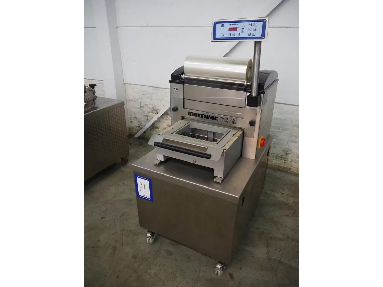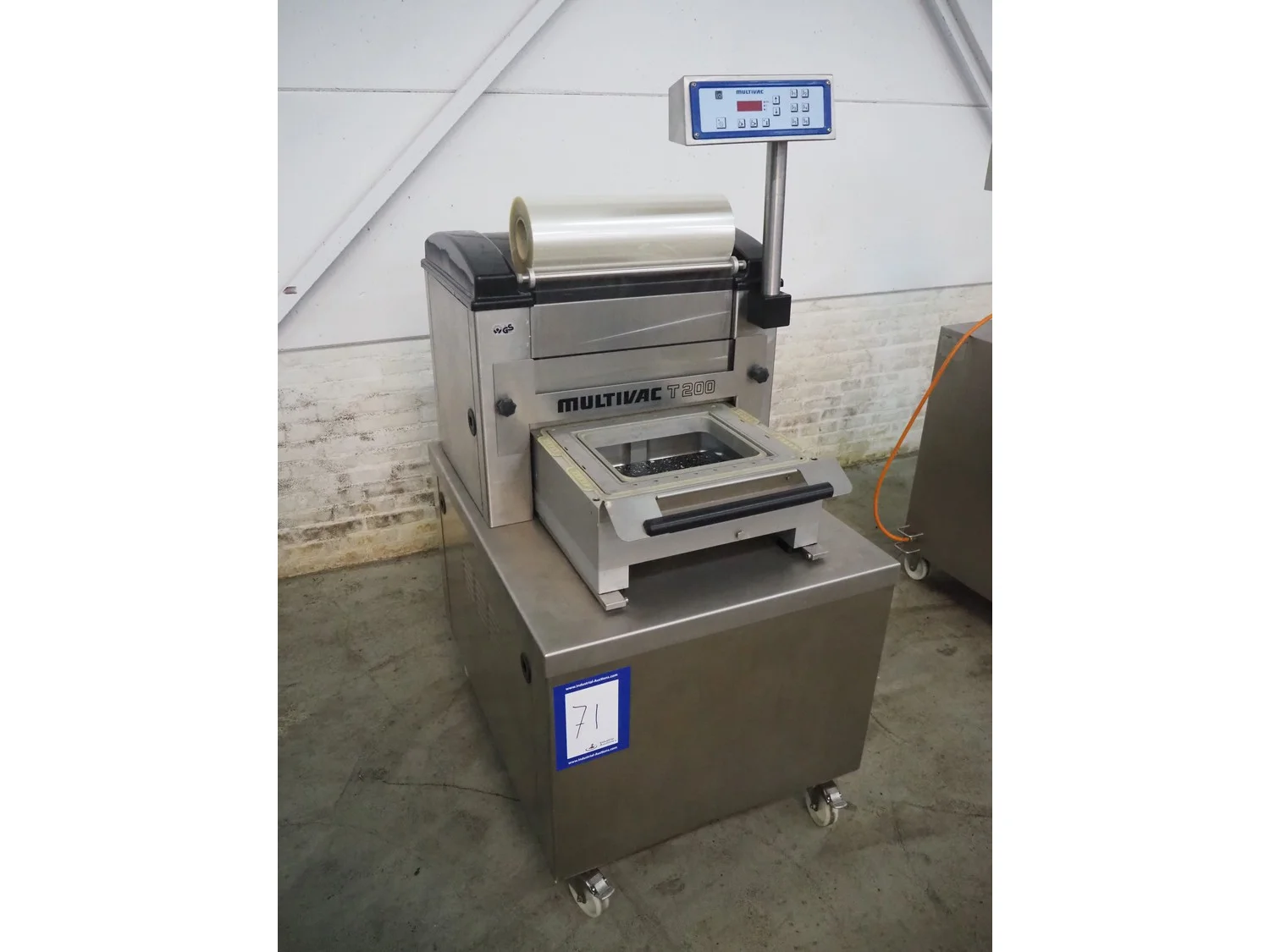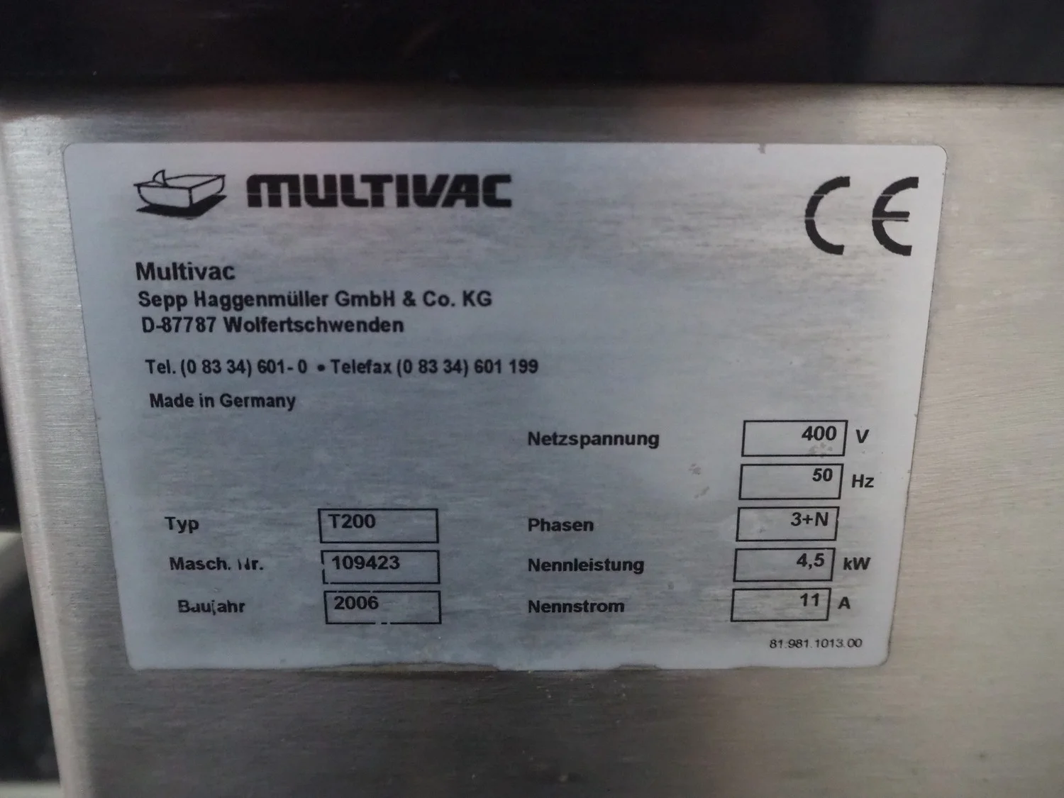 Multivac mobile traysealer, type: T200, number: 109423, year of construction: 2006, 400 V, 3 Ph, 50 Hz, 11 A, 4.5 kW, dye: 320 mm x 260 mm, film width: 445 mm, Busch vacuum pump, RA 0063 E, number: 060086084, year of construction: 2006, capacity: 63 m³ per hour, total dimensions: 1000 mm x 800 mm x 1650 mm.