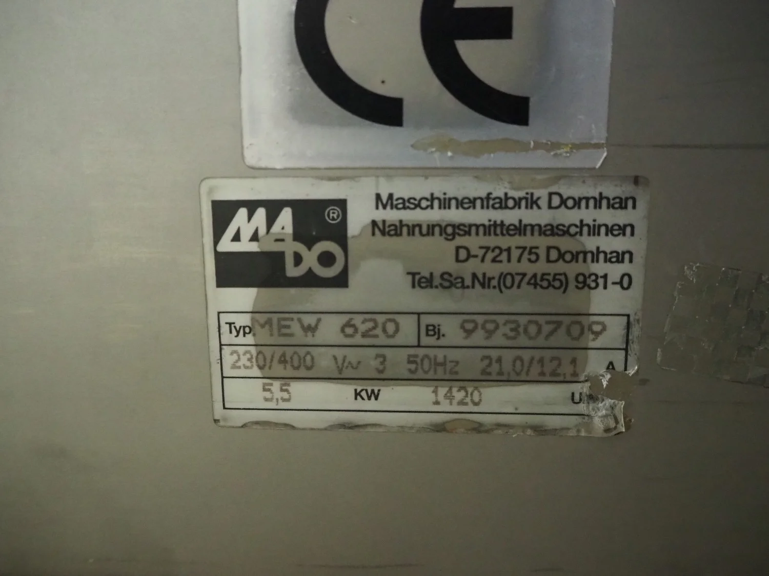 Mado mobile grinder, type: MEW 620, serial number: 9930709, 230/400 V, 3 Ph, 50 Hz, 21.0/12.1 A, 5.5 kW, diameter plate: 98 mm, total dimensions: 900 mm x 1000 mm x 1350 mm.