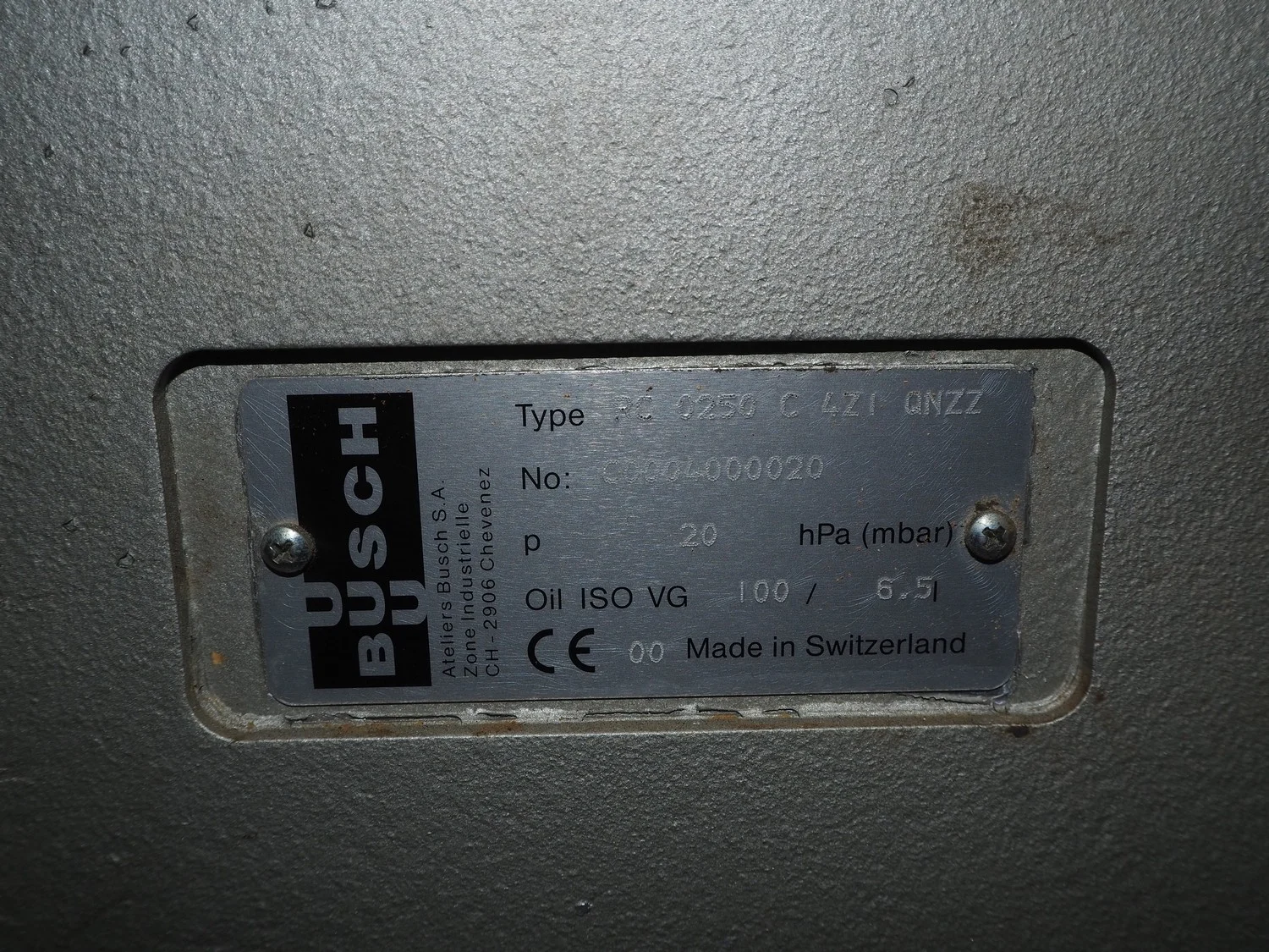 Busch vacuum pump, type: RC 0250 C 4ZI QNZZ, number: C0004000020, capacity: 250 m³ per hour, dimensions: 1000 mm x 500 mm x 420 mm.