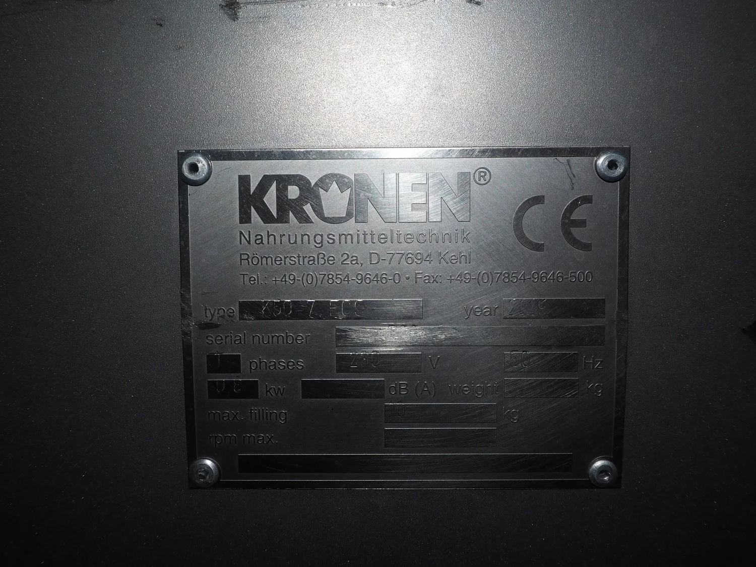 Kronen centrifuge, type: K50-7 ECO, year of construction: 2019, 240 V, 50 Hz, dimensions basket: 400 mm x 350 mm, total dimensions: 860 mm x 600 mm x 930 mm.