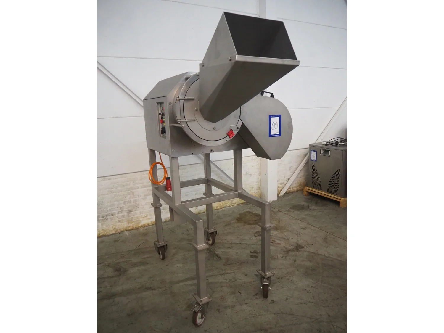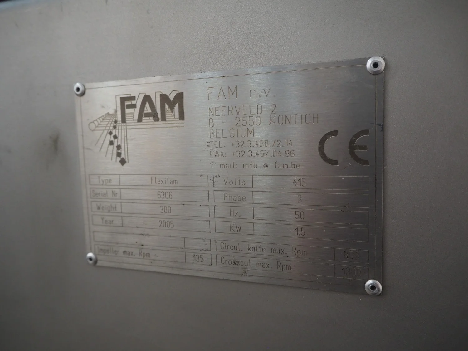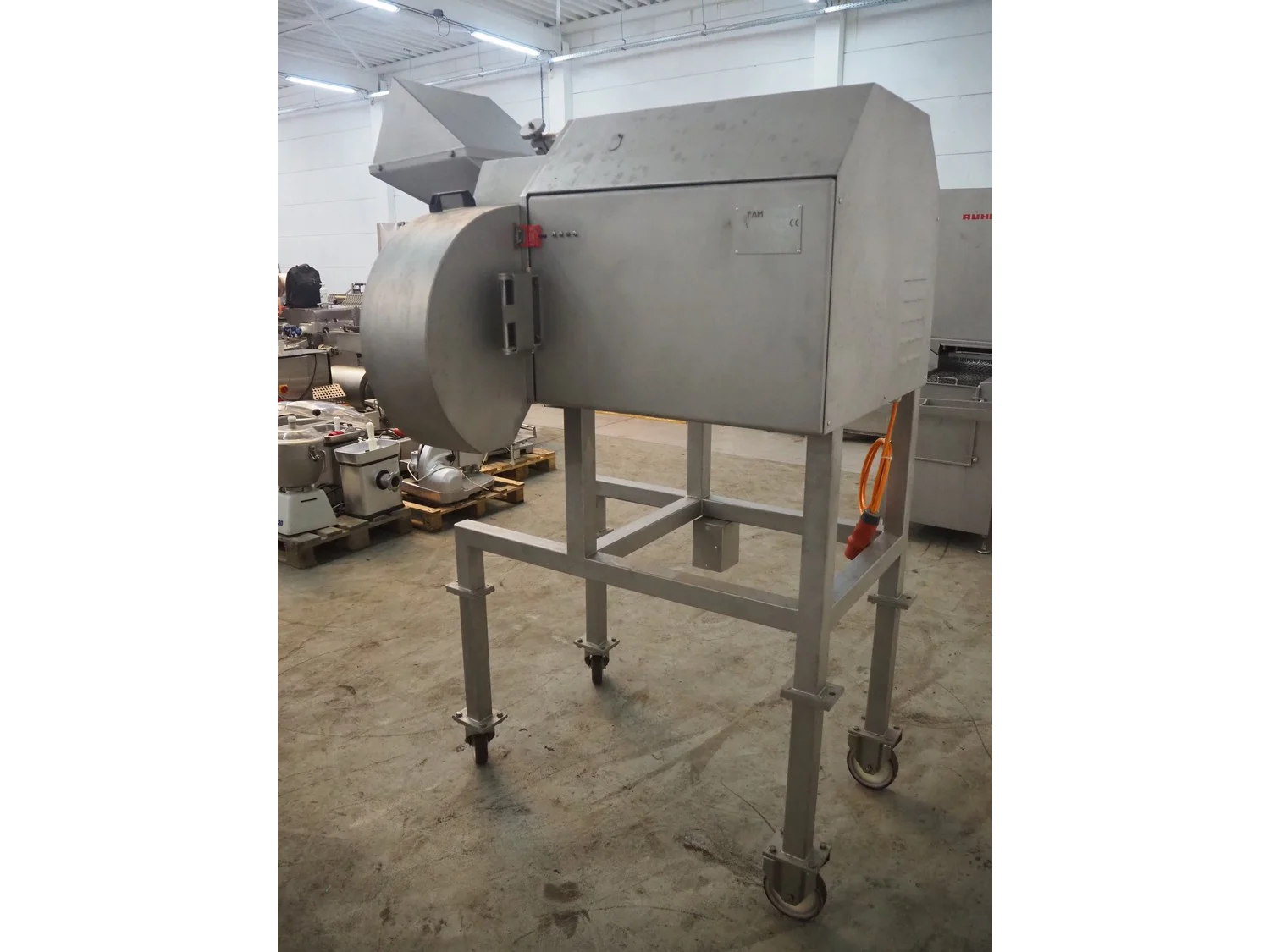 FAM n.v. mobile dicer, type: Flexifam, serial number: 6306, year of construction: 2005, 415 V, 3 Ph, 50 Hz, 1.5 kW, weight: 300 kg, distance between knives: 10 mm, dimensions infeed: 420 mm x 275 mm, total dimensions: 1700 mm x 1150 mm x 2180 mm.