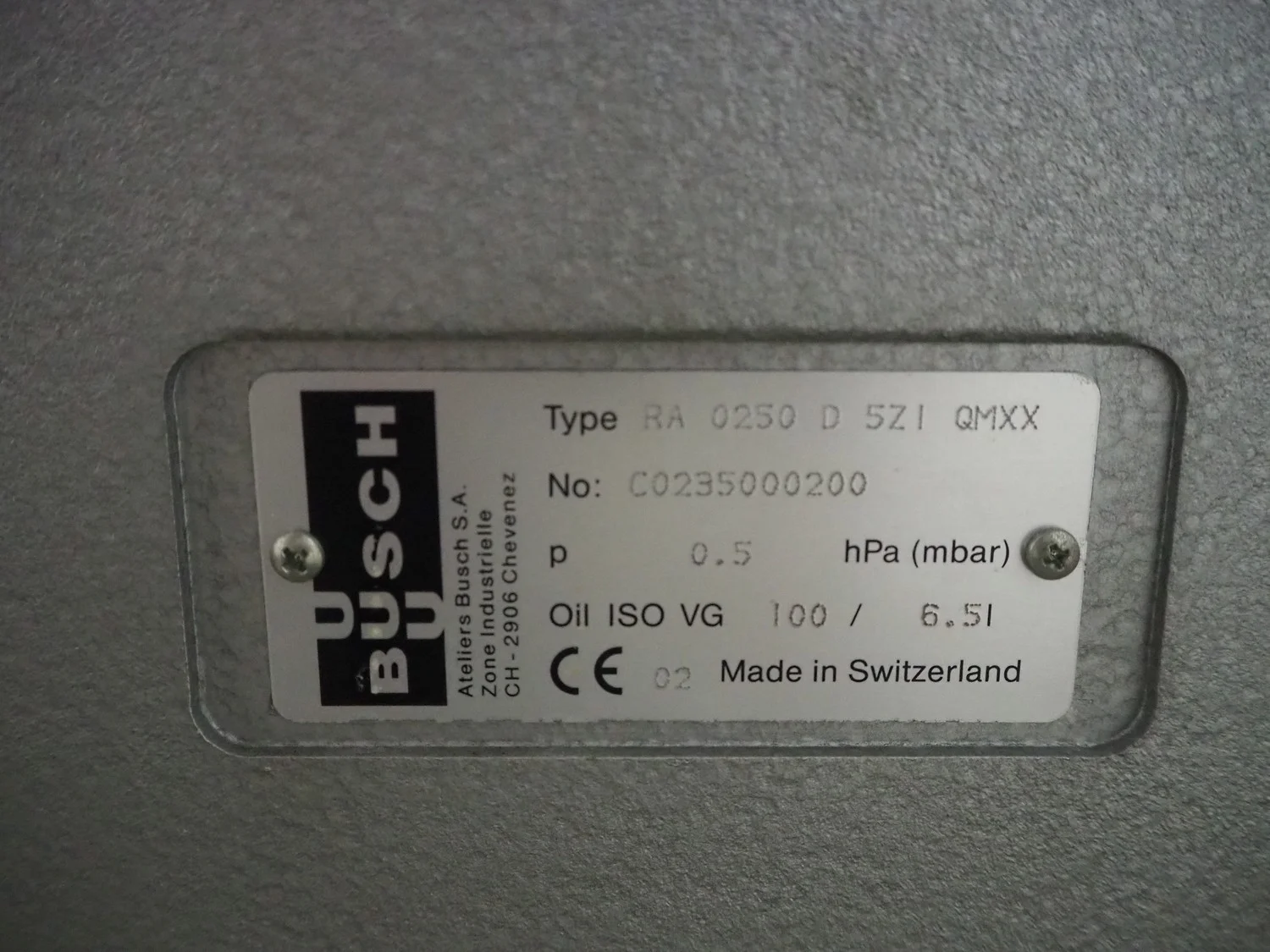 Busch vacuum pump, type: RA 0250 D 5ZI QMXX, number: C0235000200, year of construction: 2002, capacity: 250 m³ per hour, dimensions: 1050 mm x 600 mm x 520 mm.