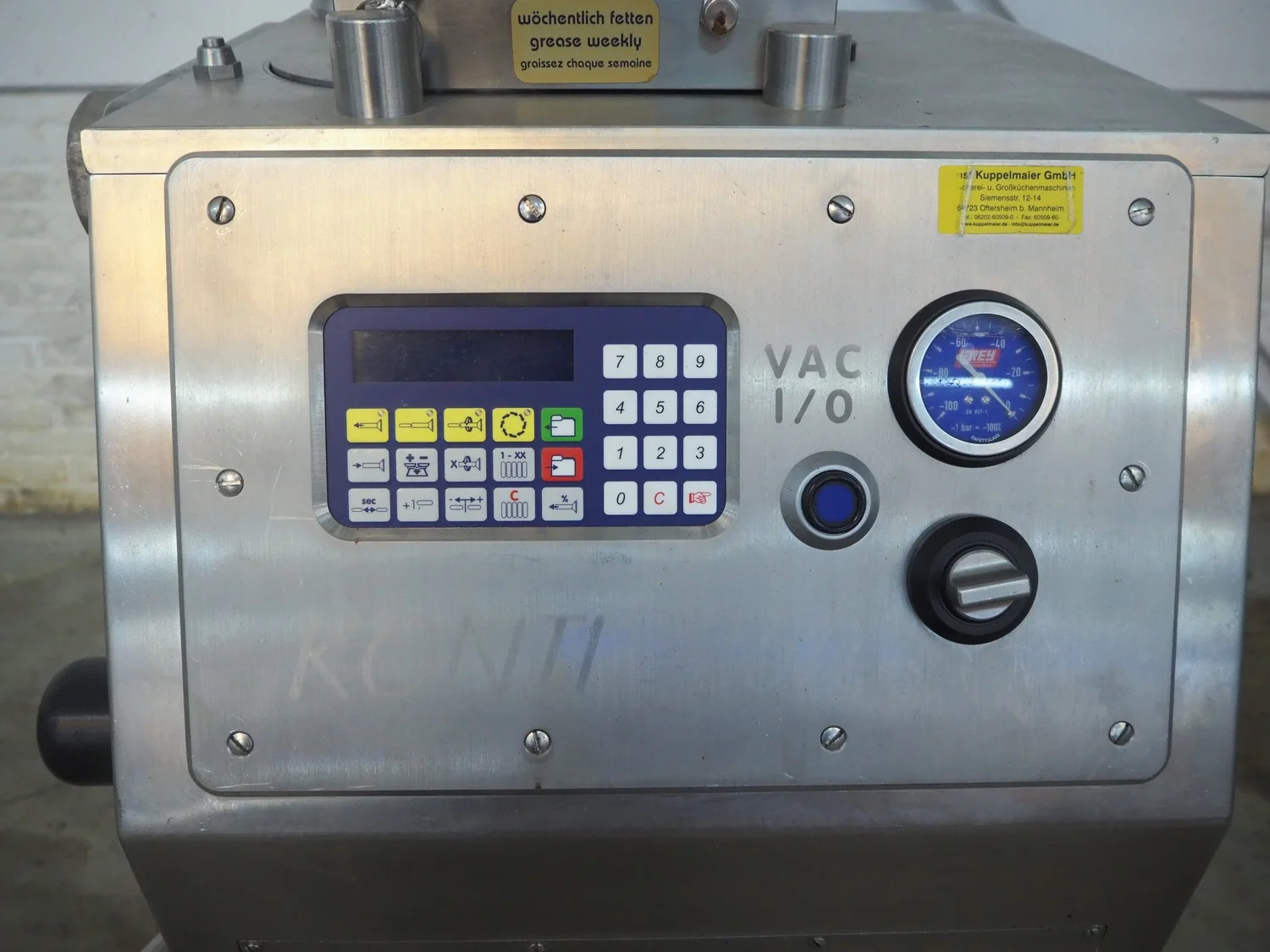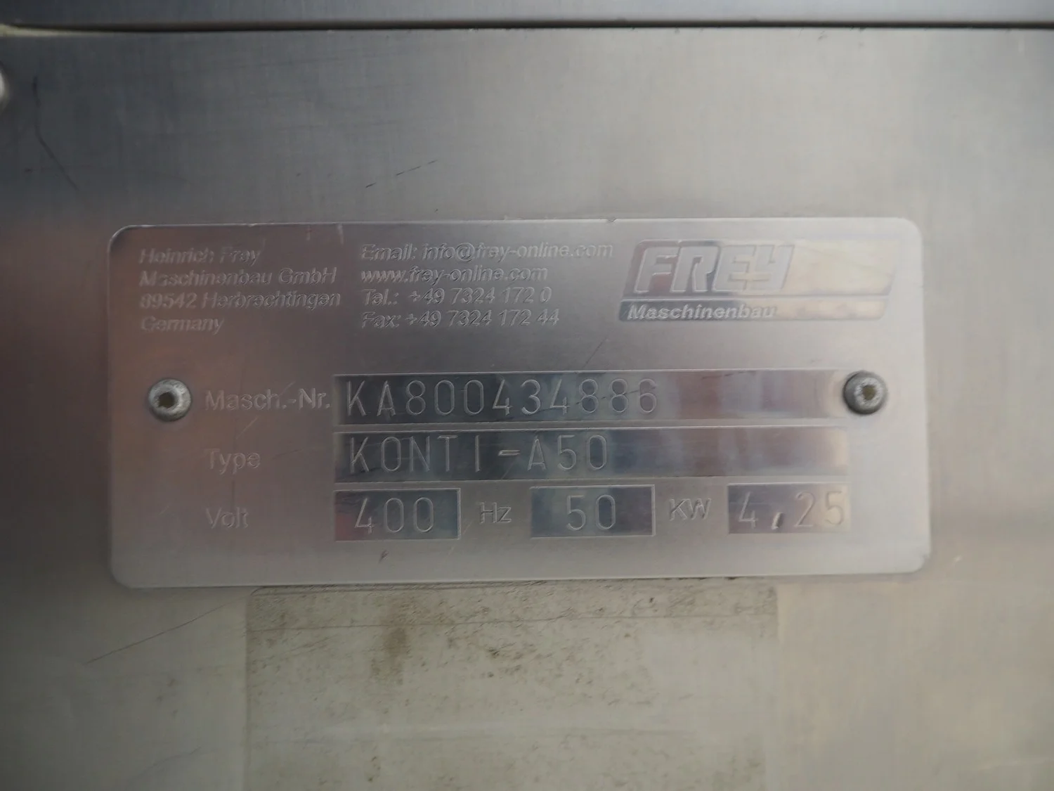 Frey vacuum filling machine, type: Konti-A50, machine number: KA800434886, 400 V, 50 Hz, 4,25 kW, dimensions: 900 mm x 800 mm x 1800 mm.