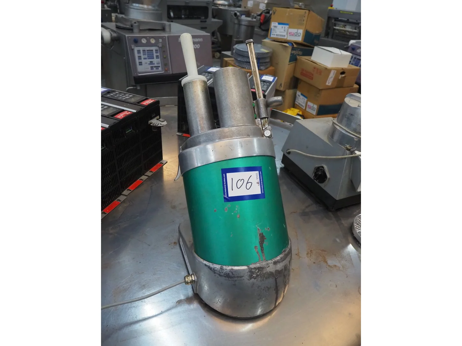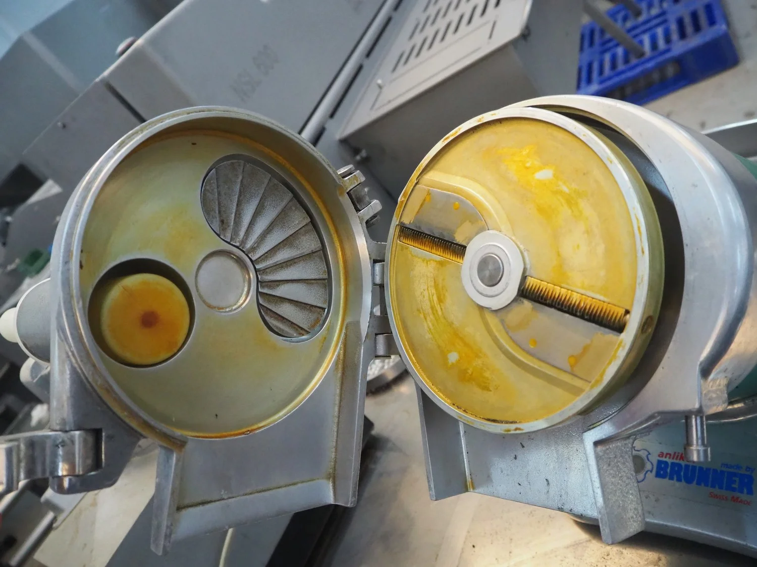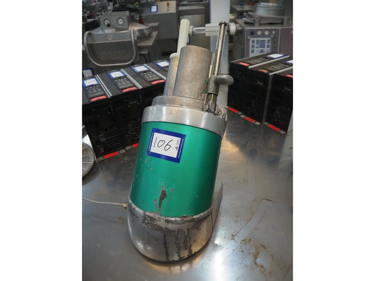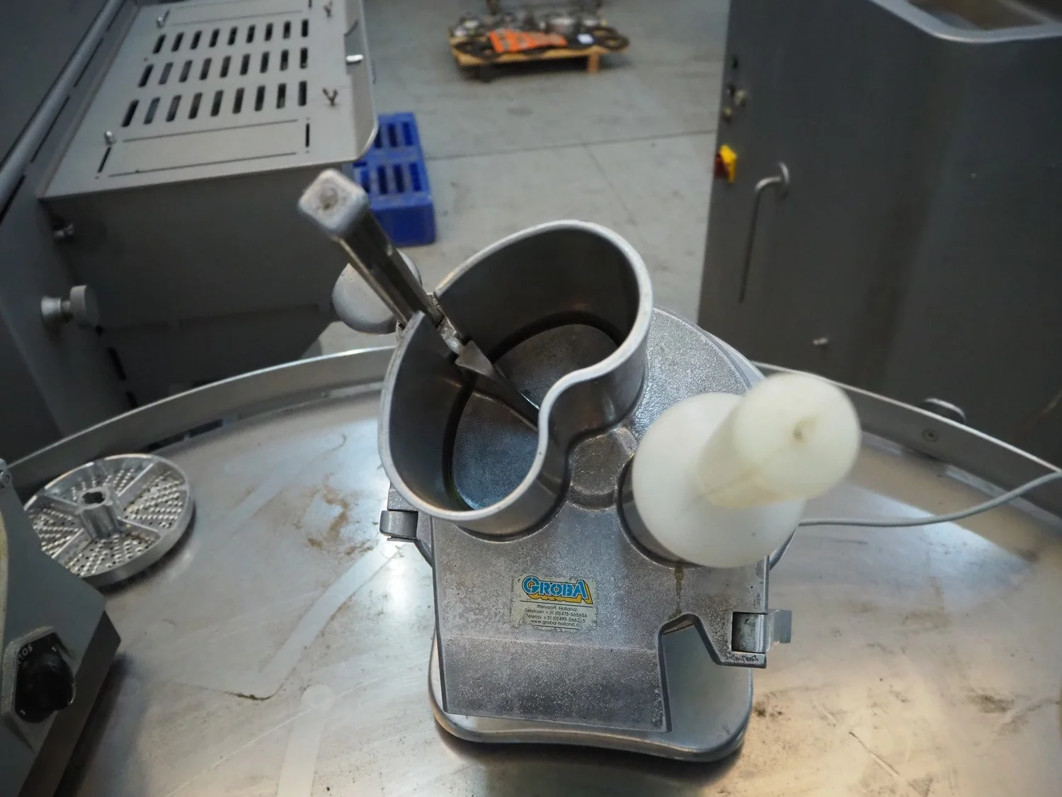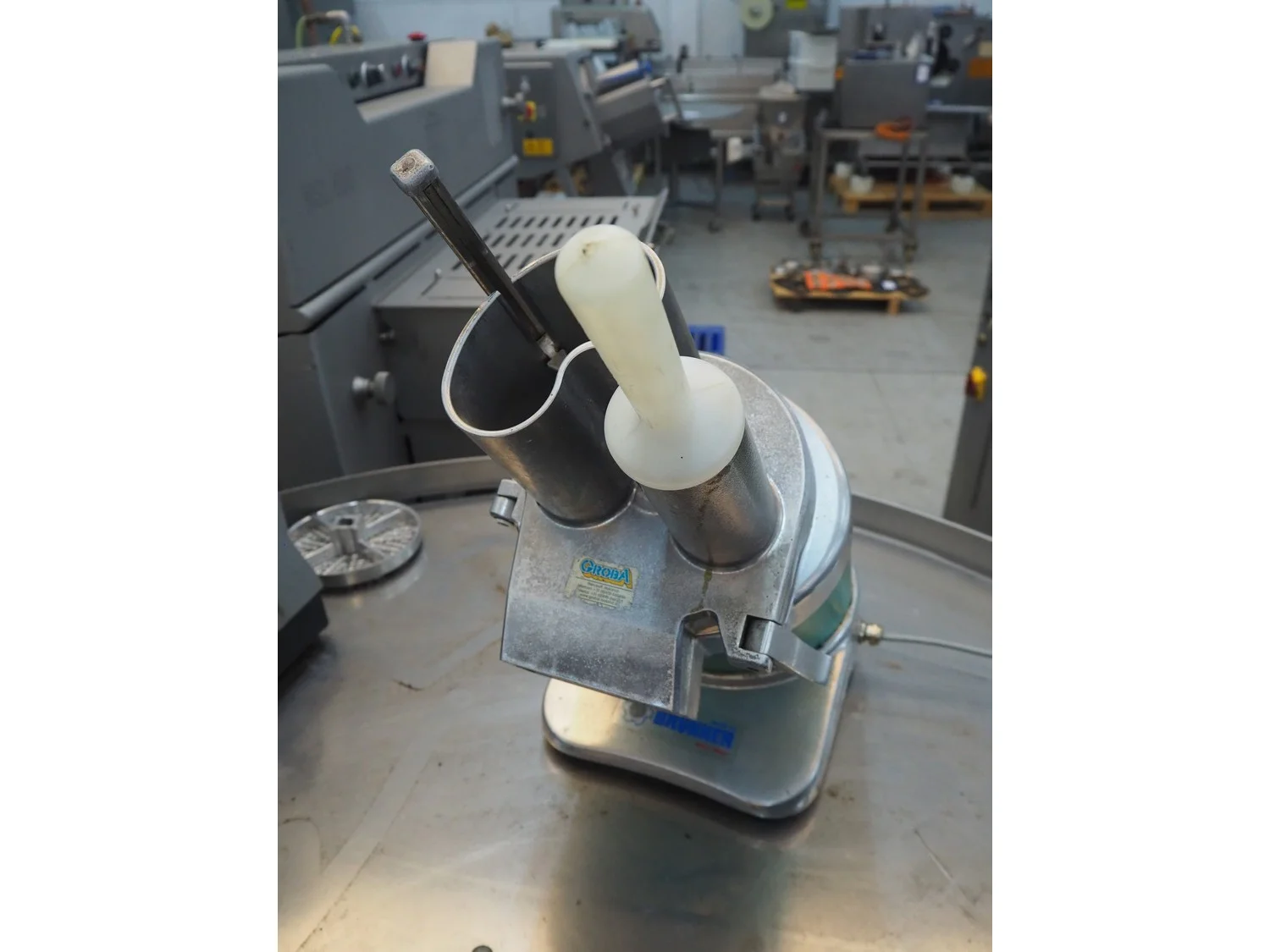 Brunner vegetable slicer, type: GSM 4-SA, number: 82222, 230 V, 1 Ph, 50 Hz, 1.8 A, 0.22 kW, dimensions: 400 mm x 250 mm x 500 mm.