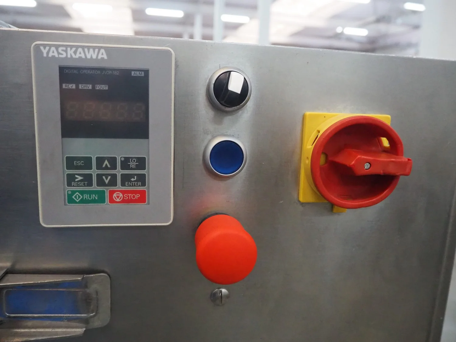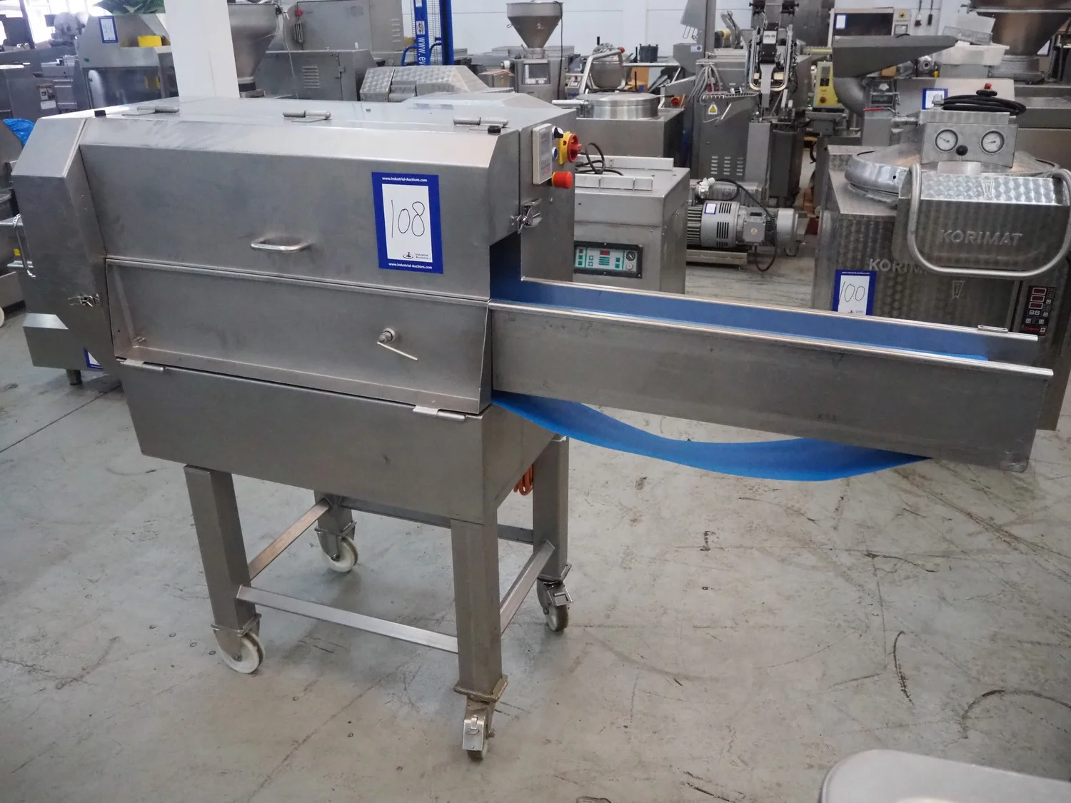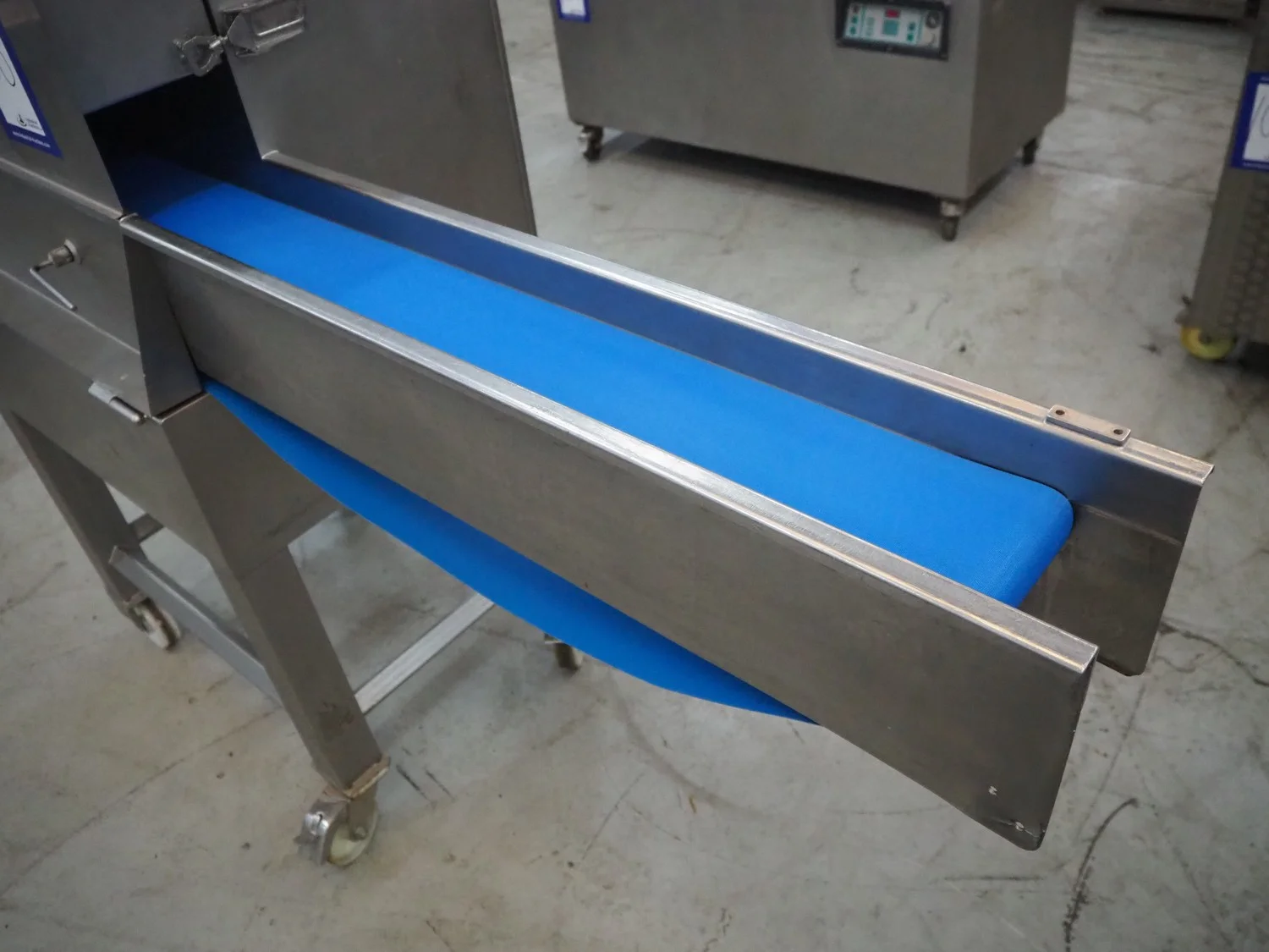 Mobile slicer, plastic belt, belt width: 150 mm, total dimensions: 2150 mm x 650 mm x 1450 mm.
