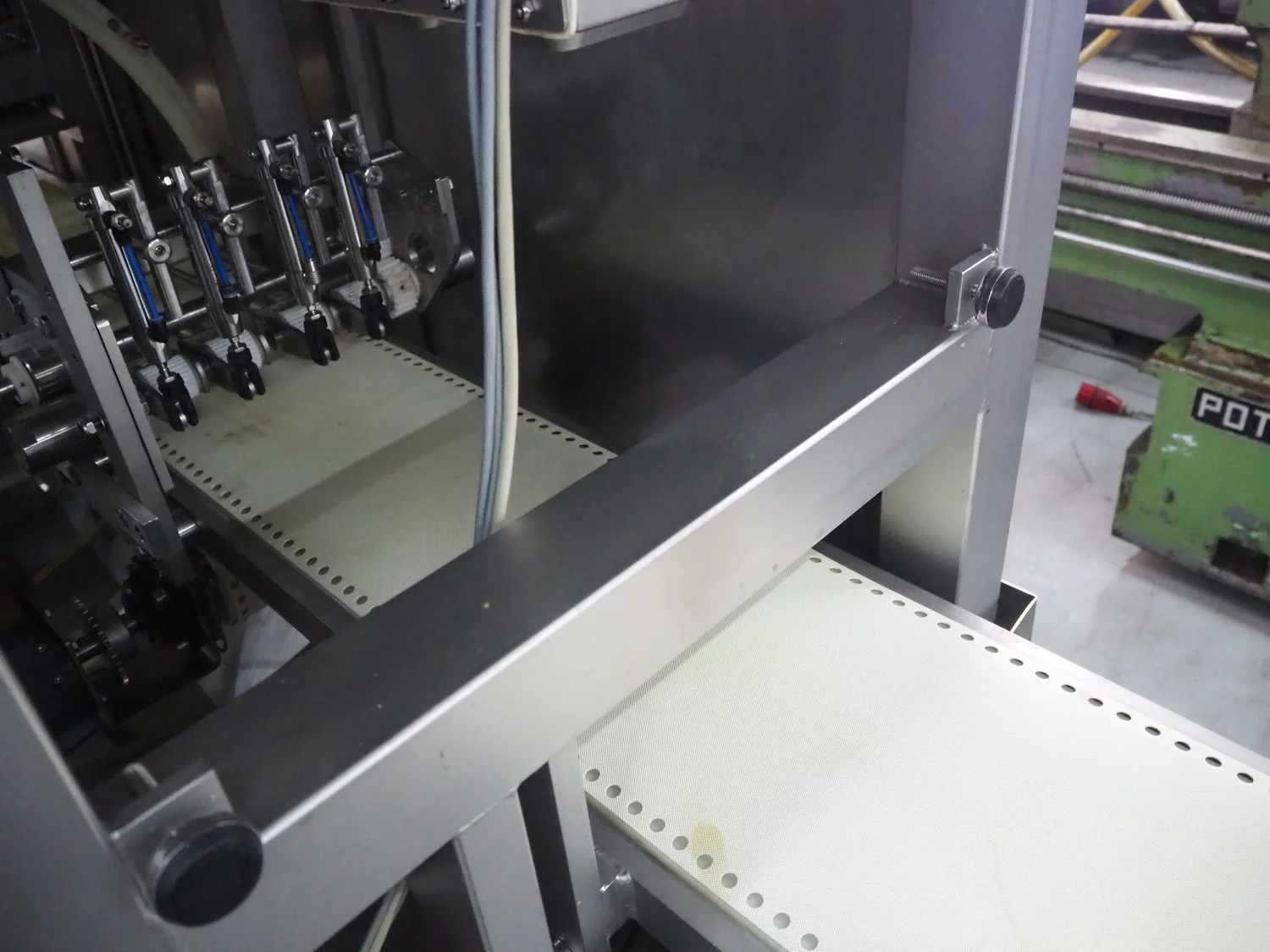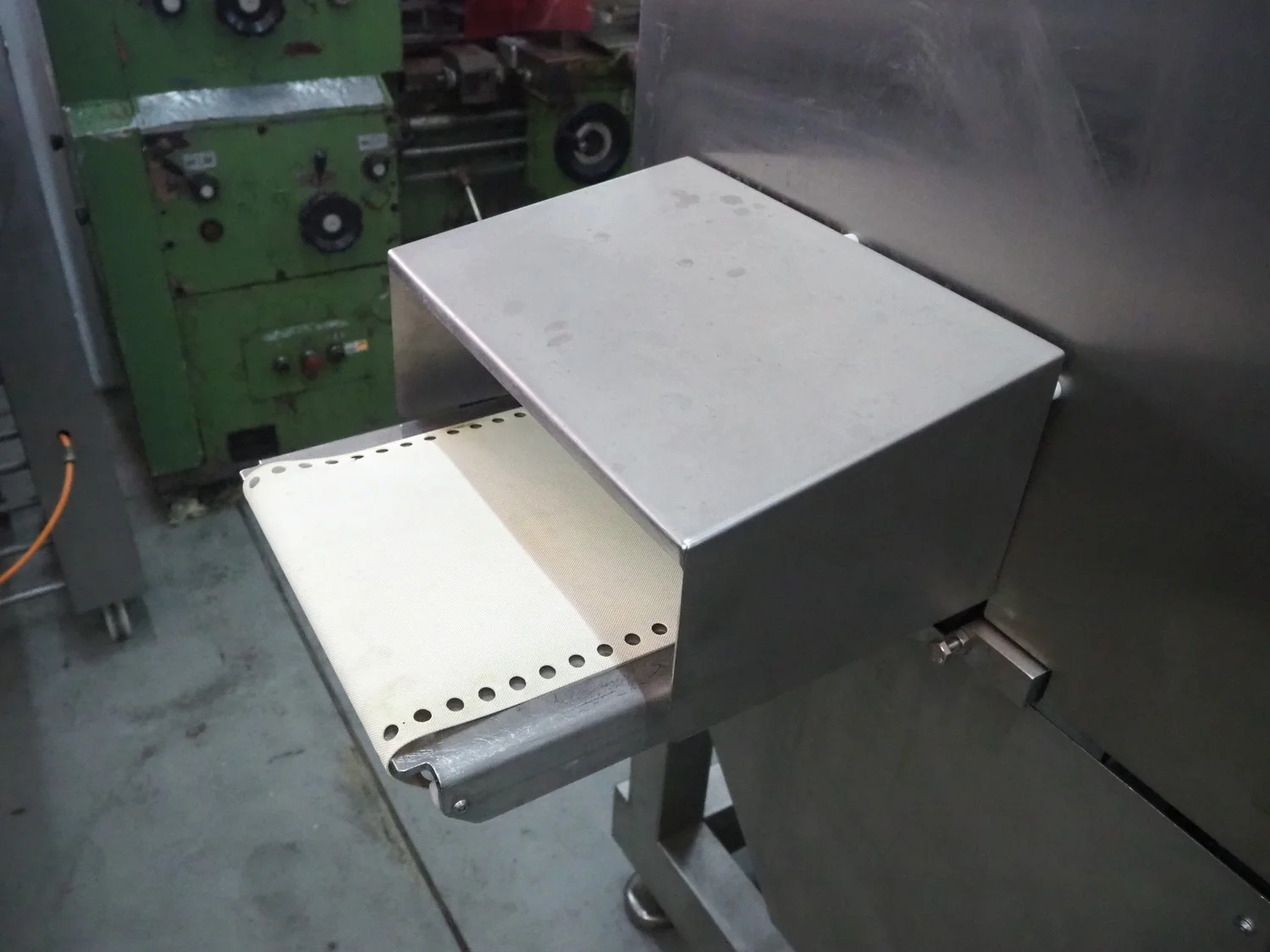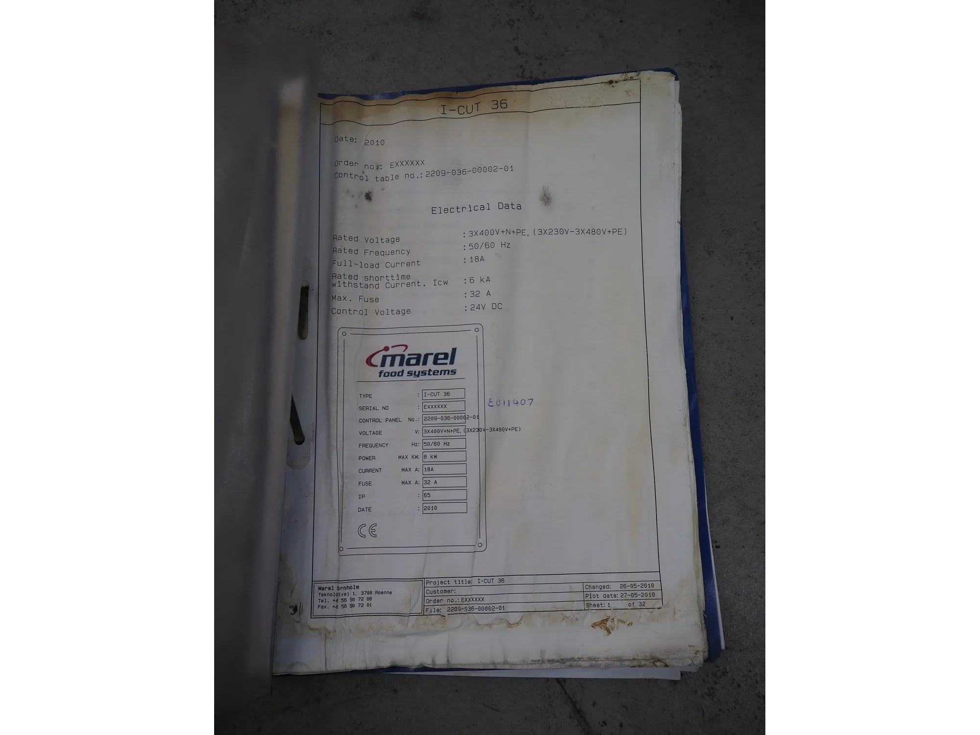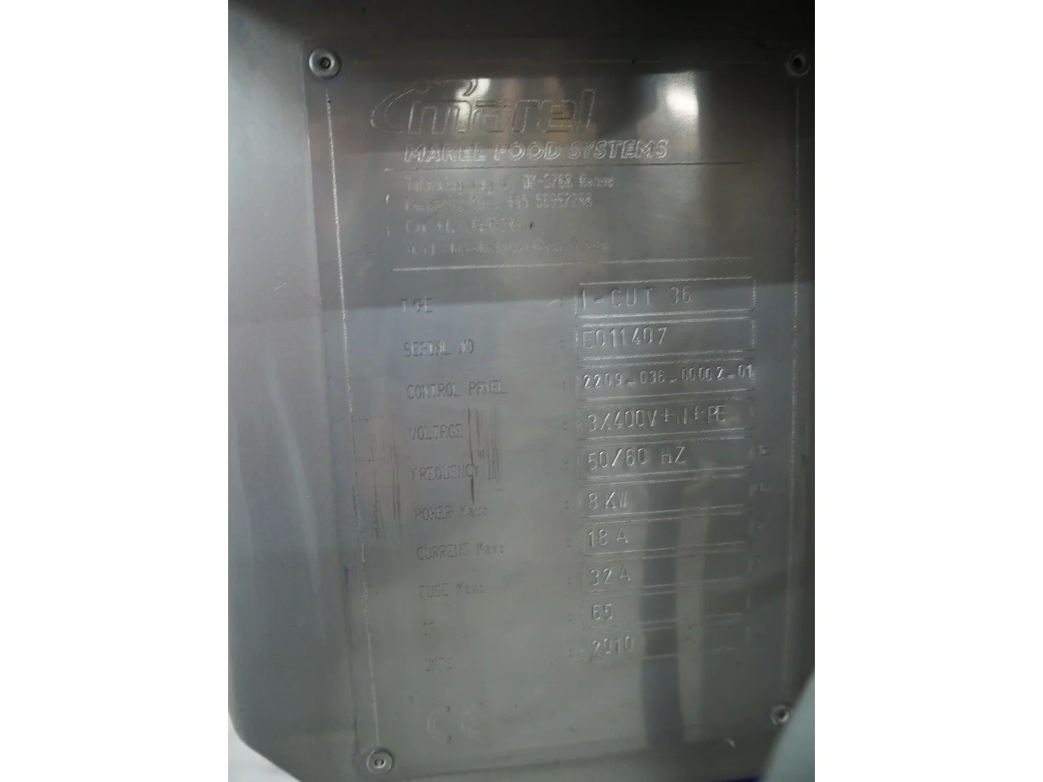 Marel portion cutter, type: I-CUT 36, serial number: E011407, year of construction: 2010, 400 V, 3 Ph, 50/60 Hz, 18 A, 8 kW, plastic belt, belt width: 300 mm, total dimensions: 3100 mm x 1300 mm x 1830 mm.