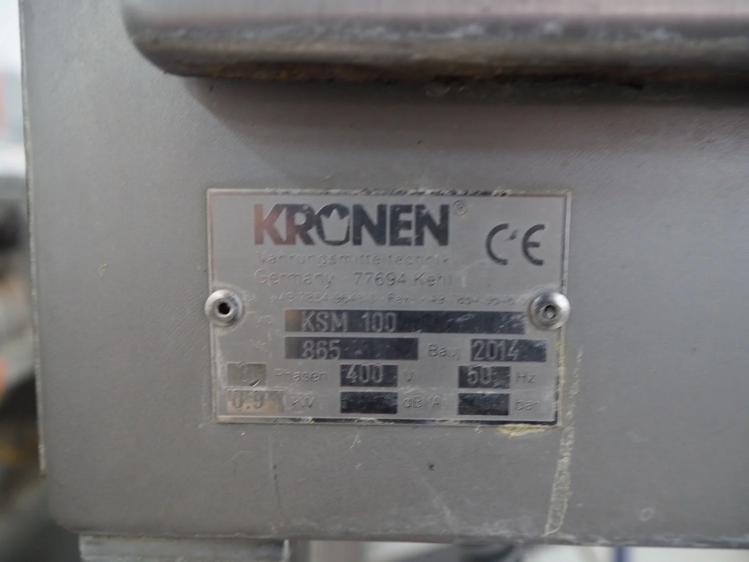Kronen slicer, type: KSM 100, number: 865, year of construction: 2014, 400 V, 3 Ph, 50 Hz, 0.9 kW, total dimensions: 600 mm x 800 mm x 1200 mm.