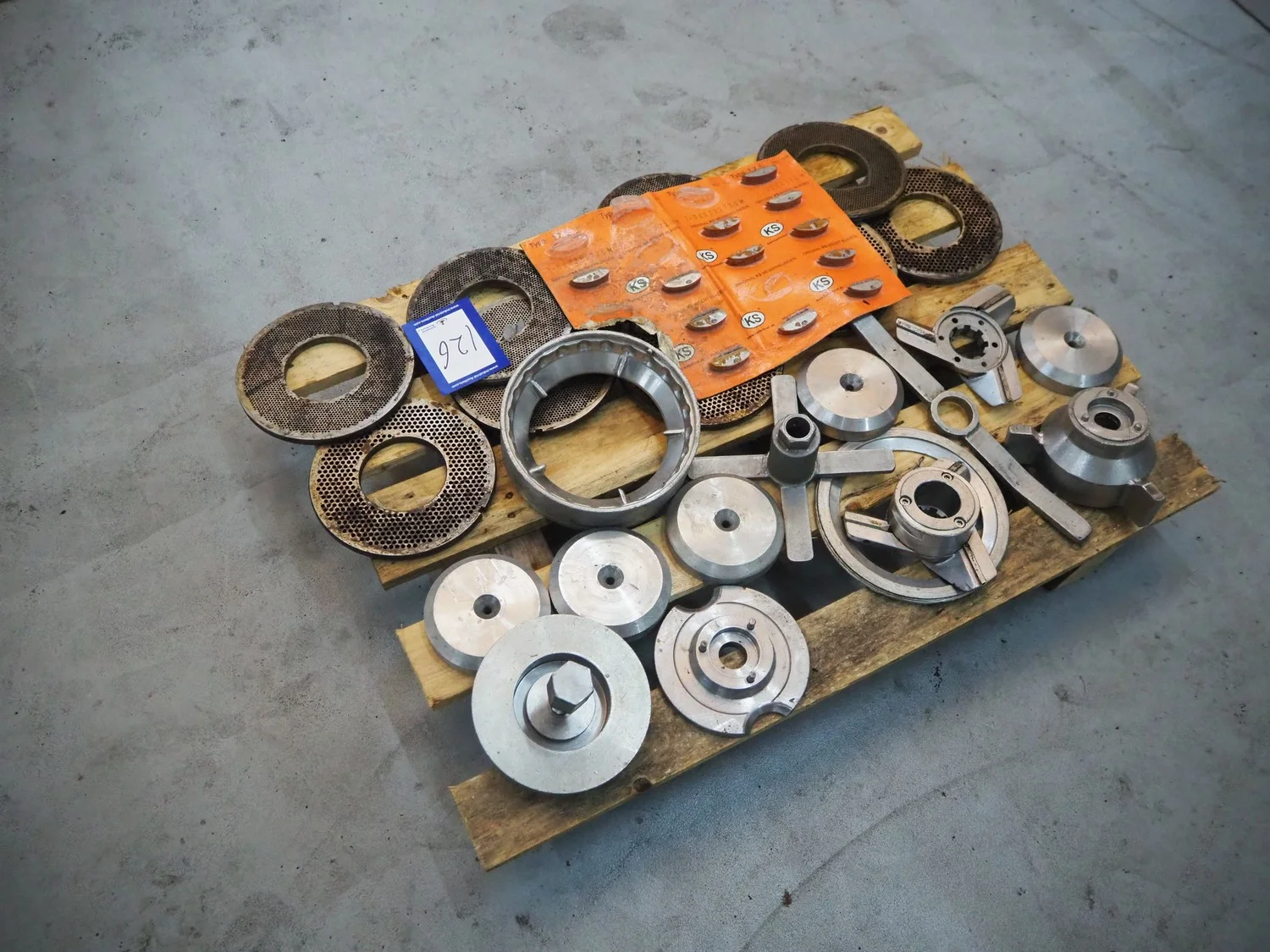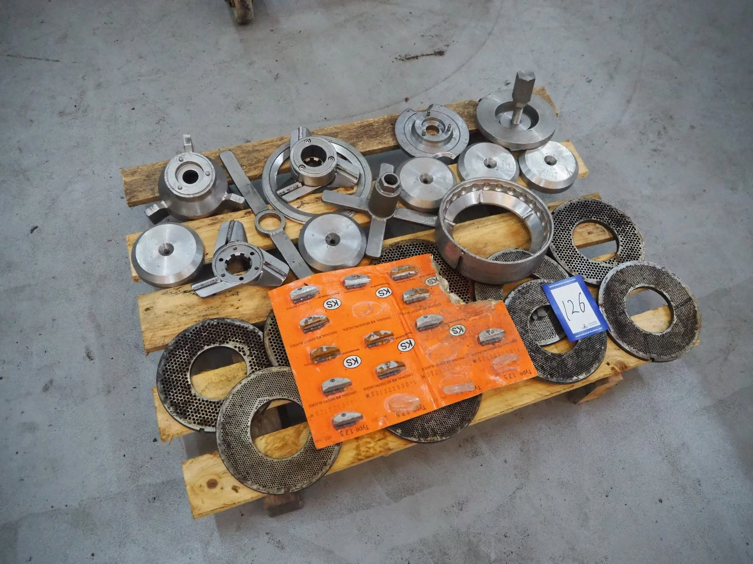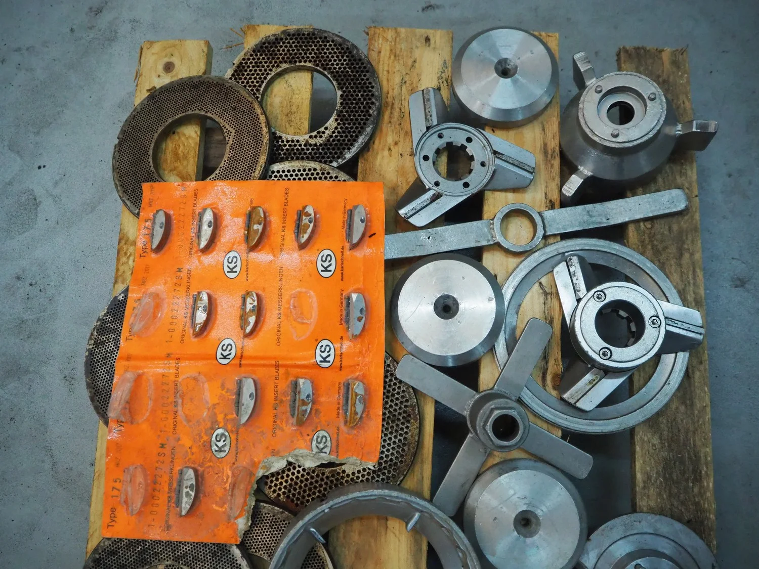 Pallet with parts for Karl Schnell micro cutter, diameter plate: 175 mm, total dimensions: 800 mm x 600 mm x 200 mm.
