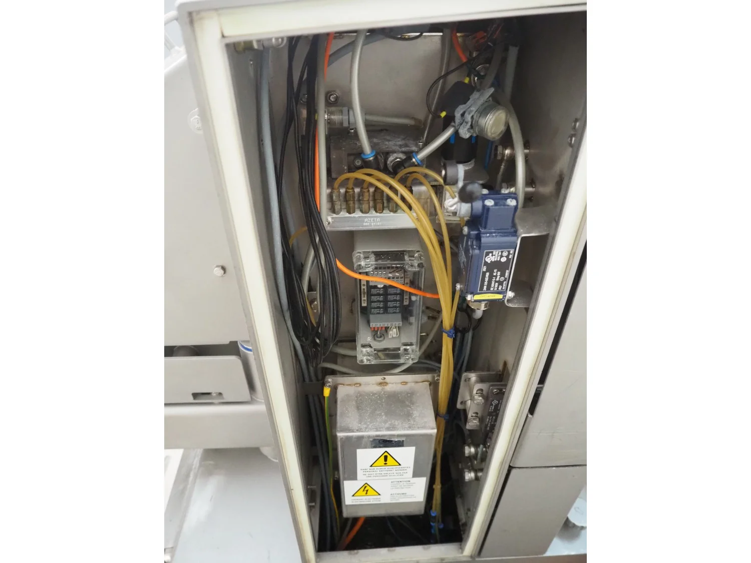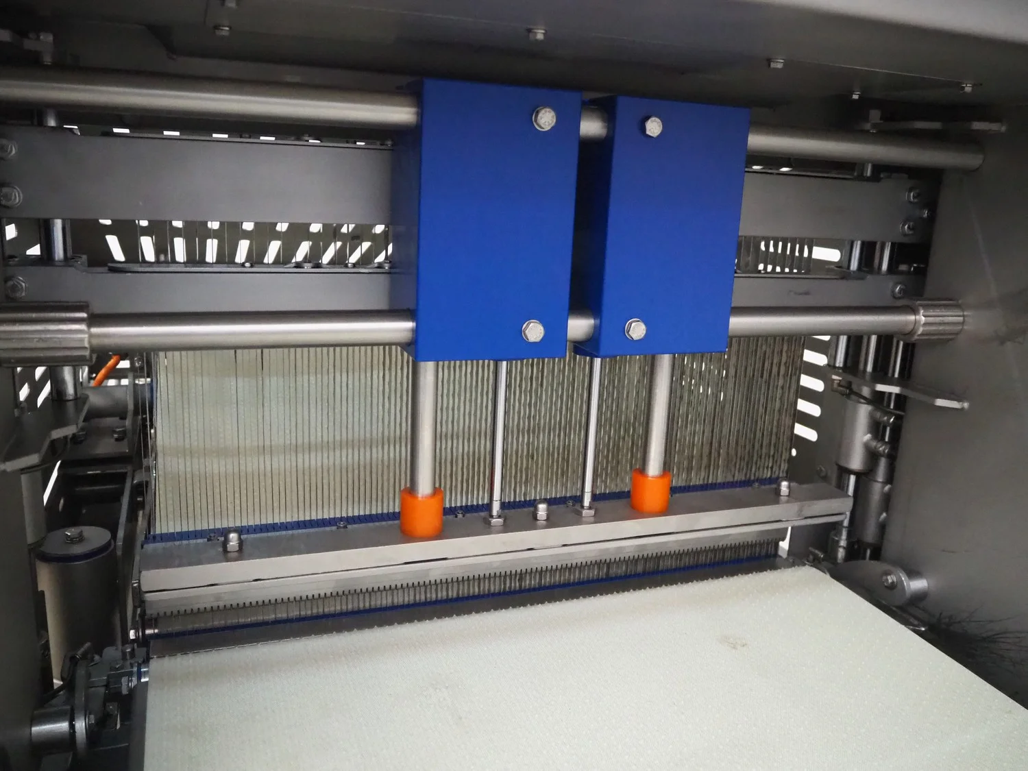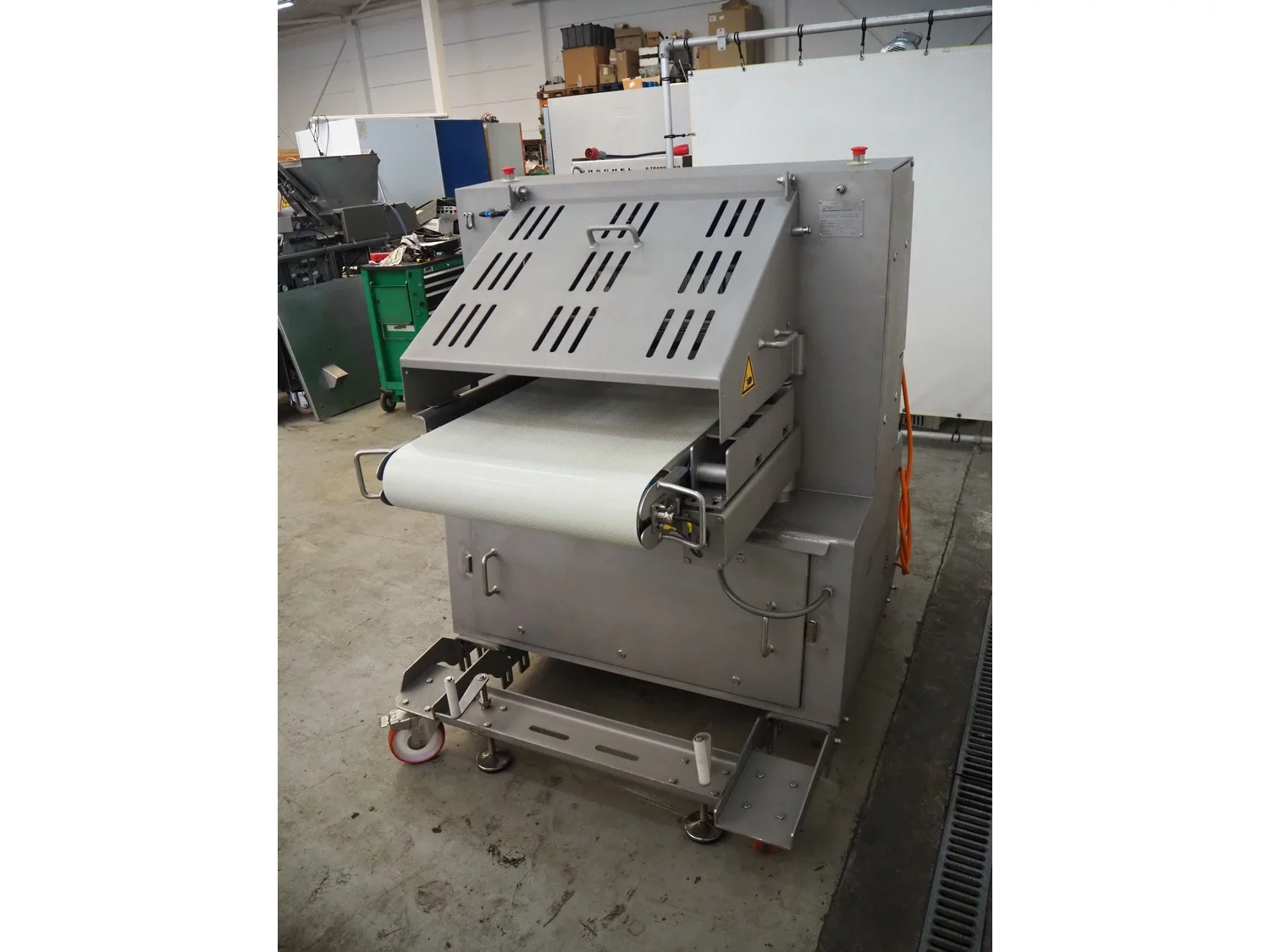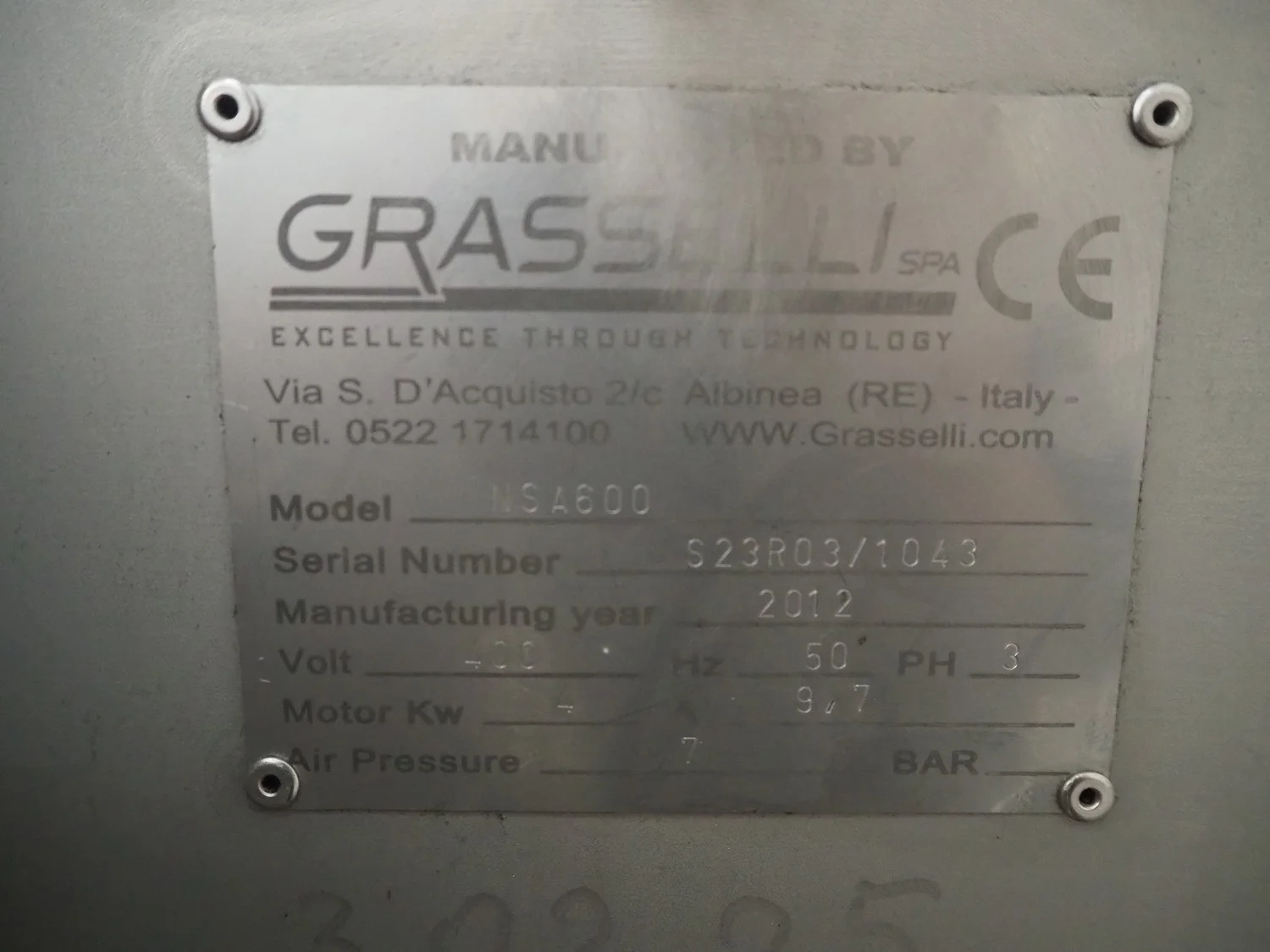 Grasselli S.p.A. mobile slicer, model: NSA600, serial number: S23R03/1043, year of construction: 2012, 400 V, 3 Ph, 50 Hz, 9.4 A, 4 kW, plastic belt, belt width: 600 mm, distance between knives: 5 mm, total dimensions: 2200 mm x 1300 mm x 1600 mm.