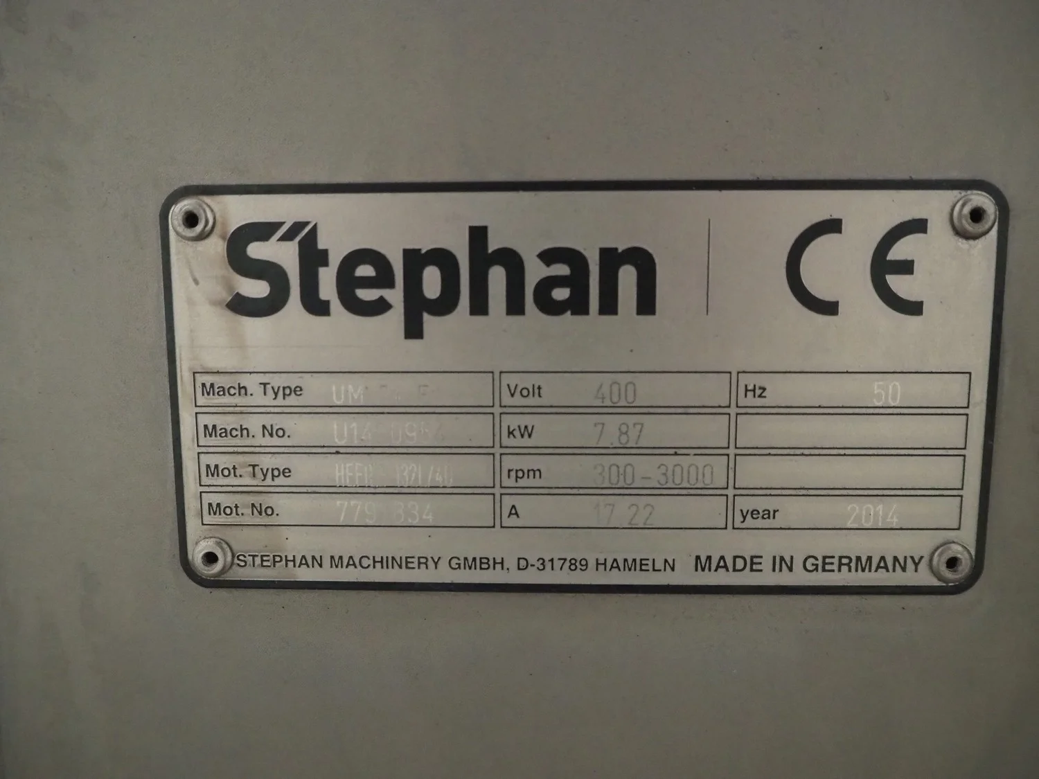Stephan universal machine, type: UM 74 E, machine number: U1400954, year of construction: 2014, 400 V, 50 Hz, 17.22 A, 7.87 kW, volume: 70 liter, capacity: 55 liter, weight: 300 kg, dimensions: 900 mm x 900 mm x 1600 mm.