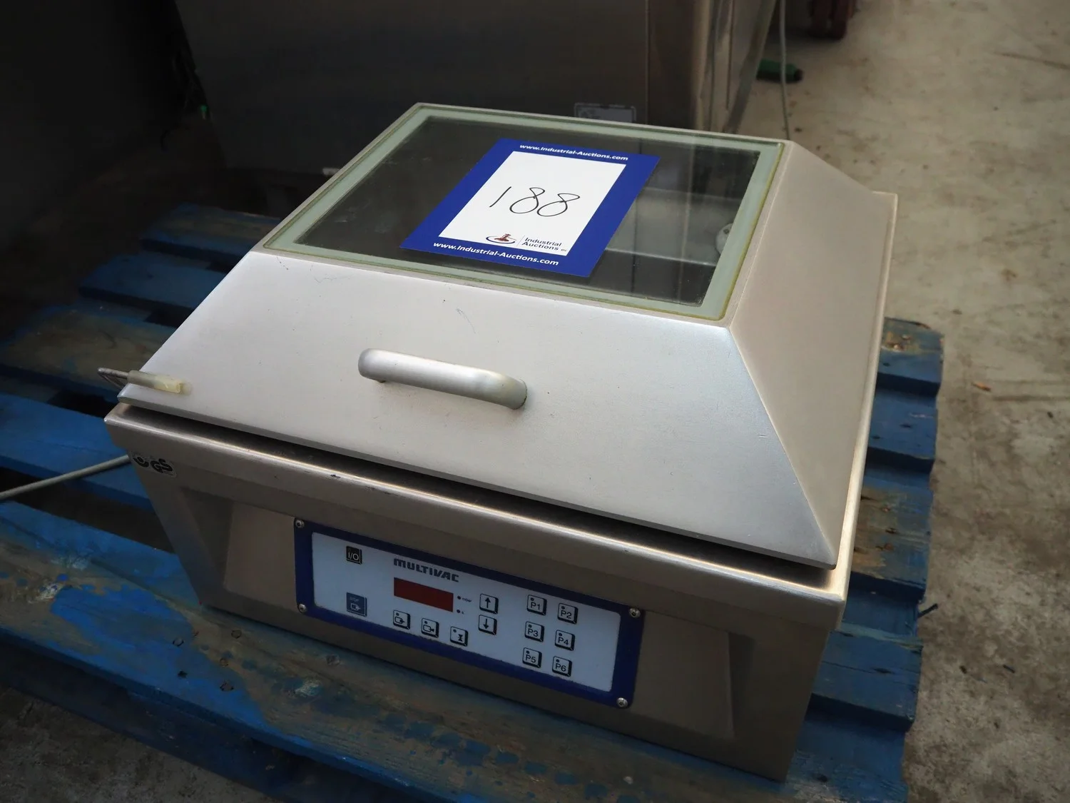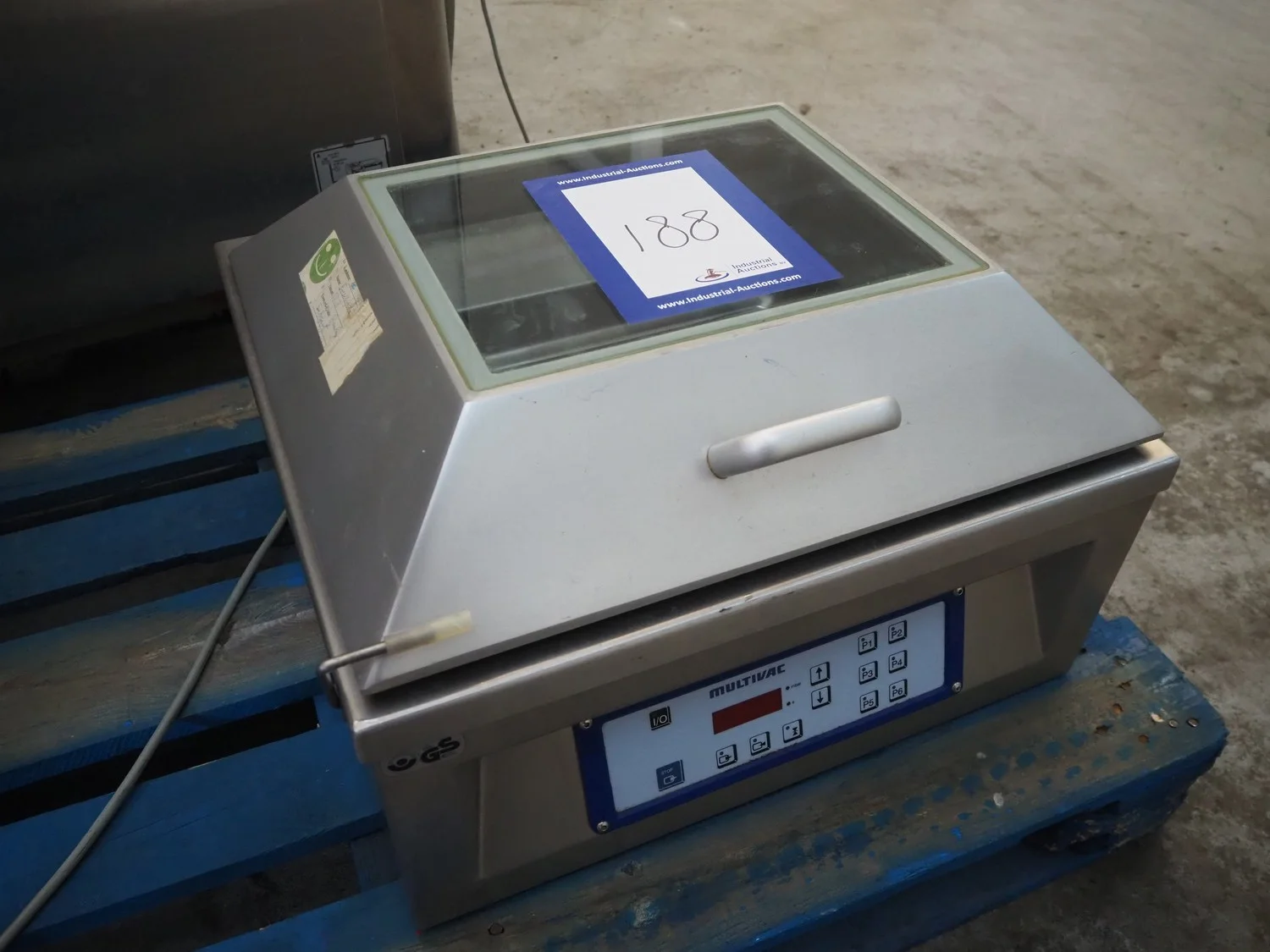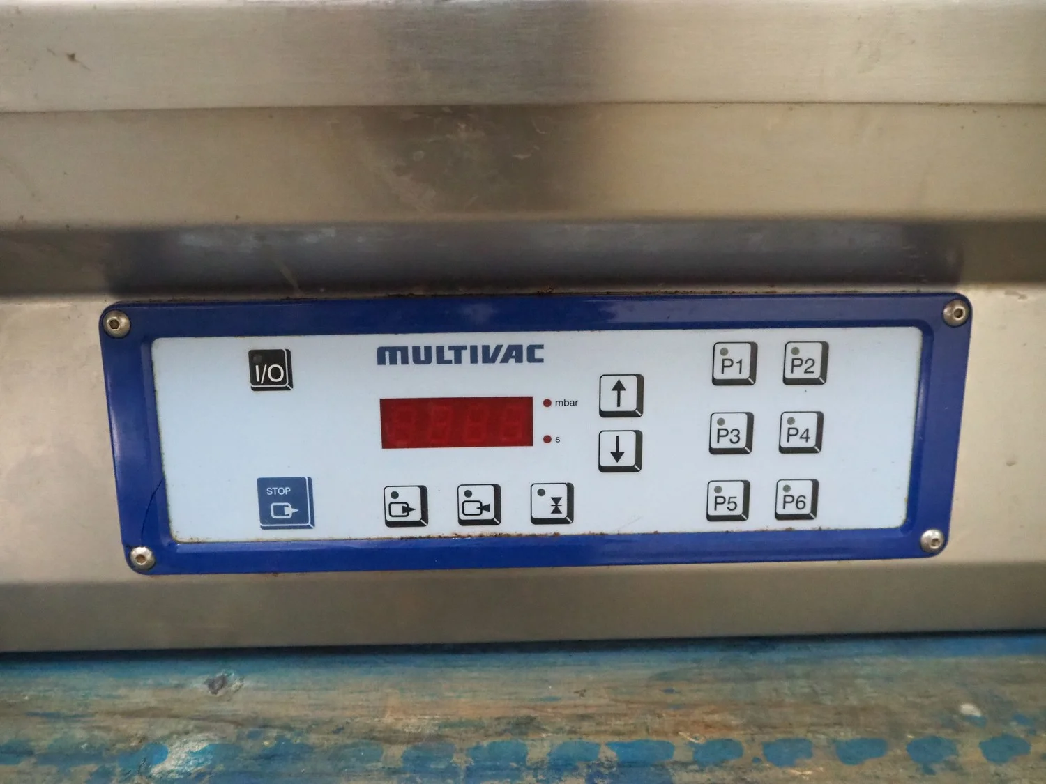 Multivac vacuum machine, seal length: 470 mm, chamber: 430 mm x 500 mm, total dimensions: 550 mm x 520 mm x 500 mm.