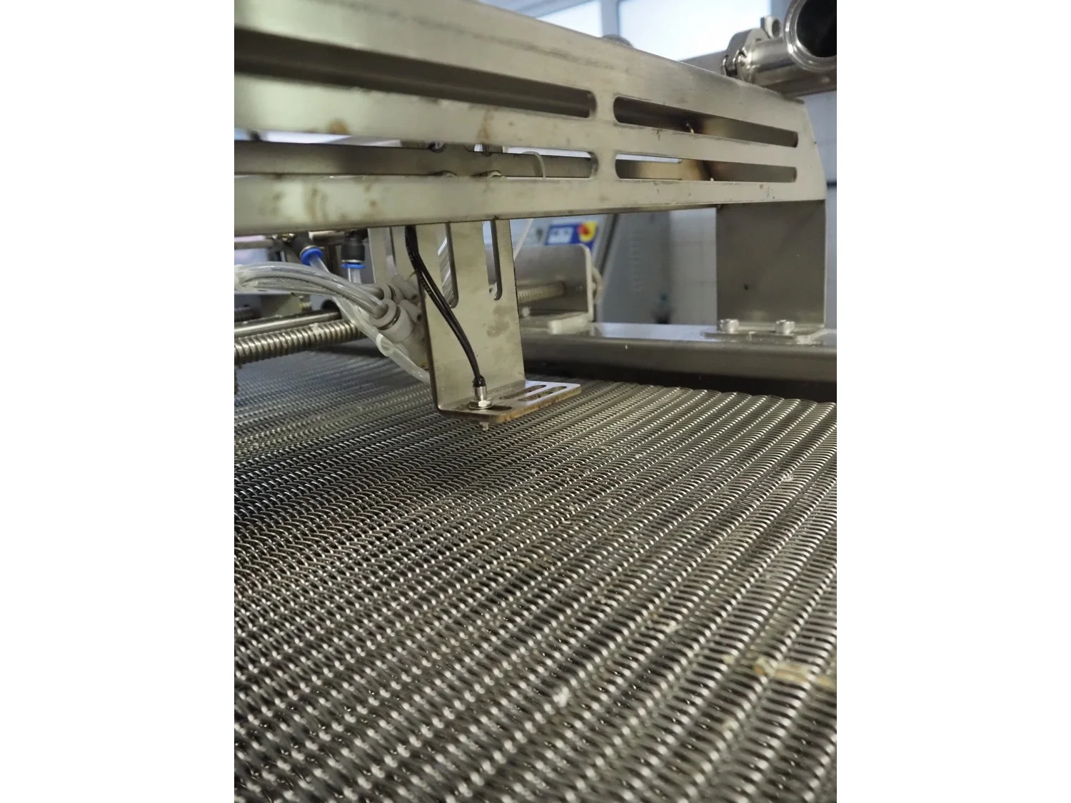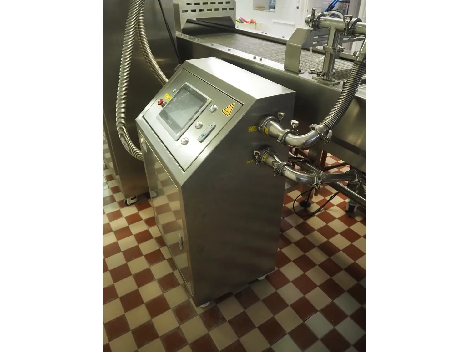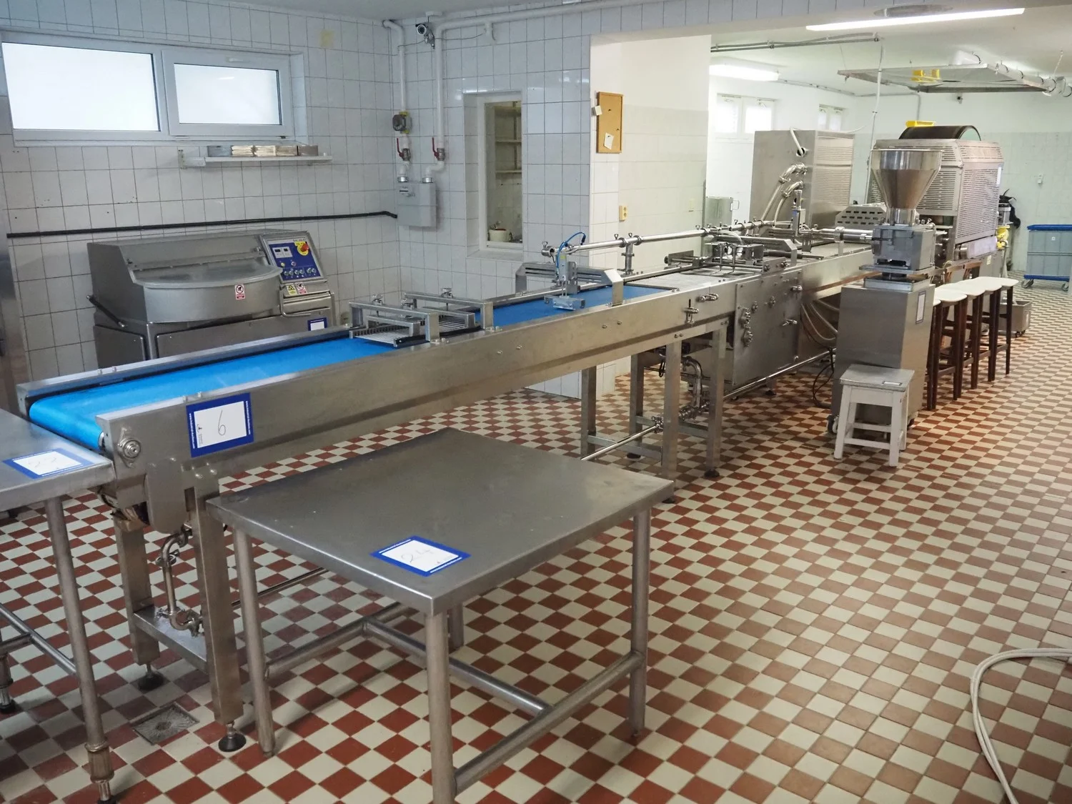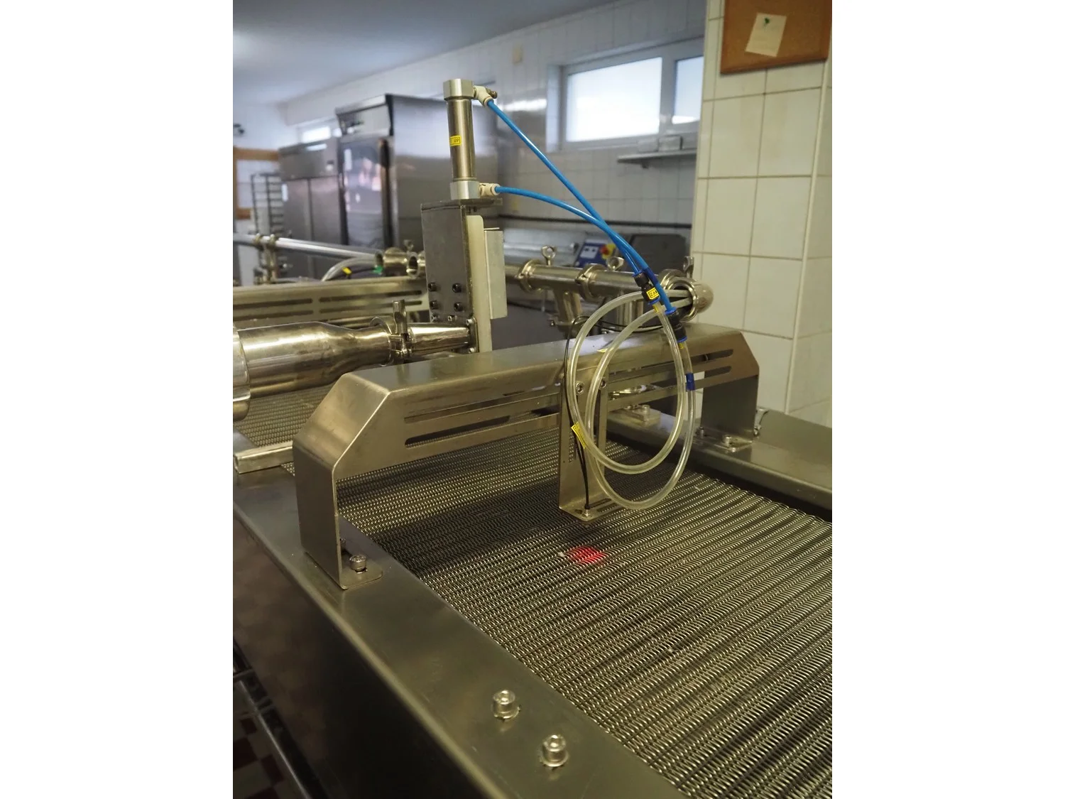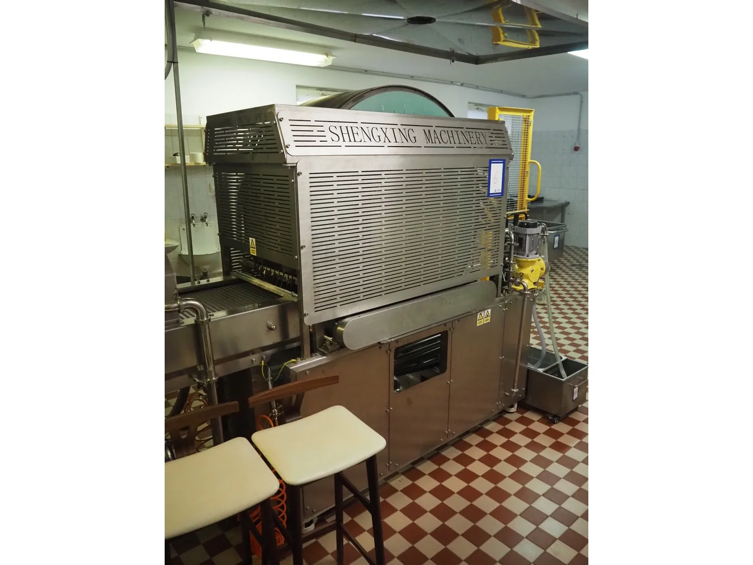 Shengxing Machinery production line for spring rolls, tub with 2 pumps, heated press, press width: 500 mm, s/s mesh belt, belt width: 430 mm, blower, 1 head depositor, plastic belt, belt width: 430 mm, total dimensions: 9000 mm x 1200 mm x 2000 mm. Used only 8 times.
