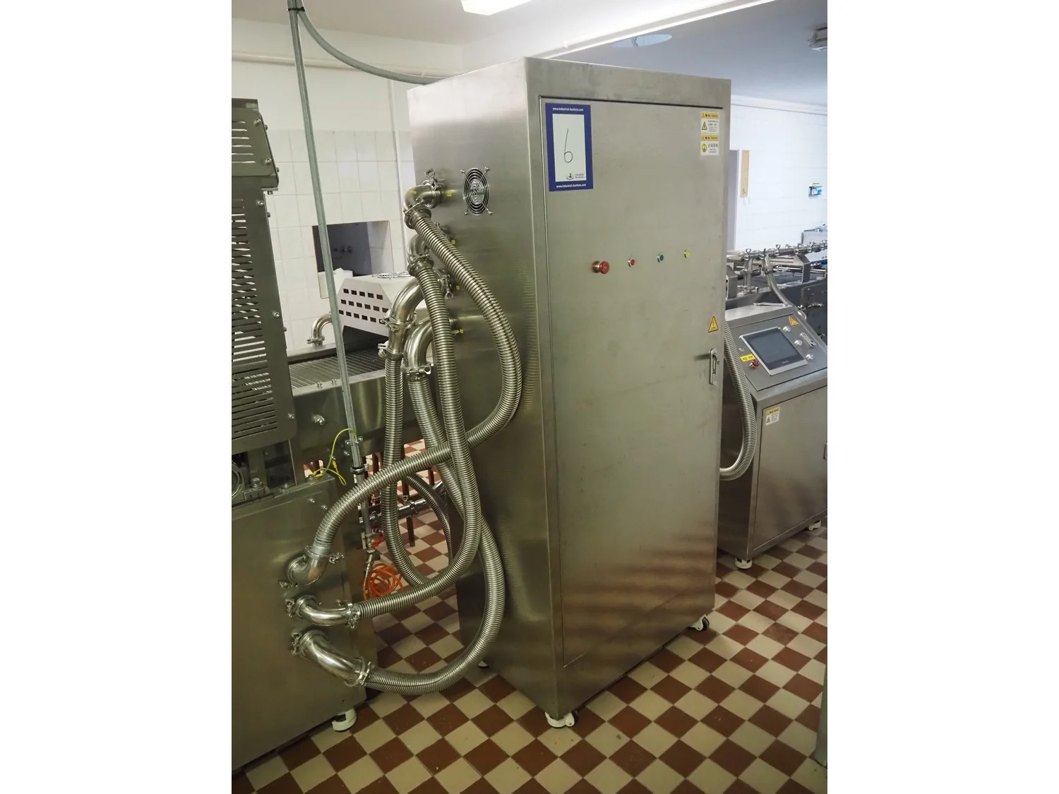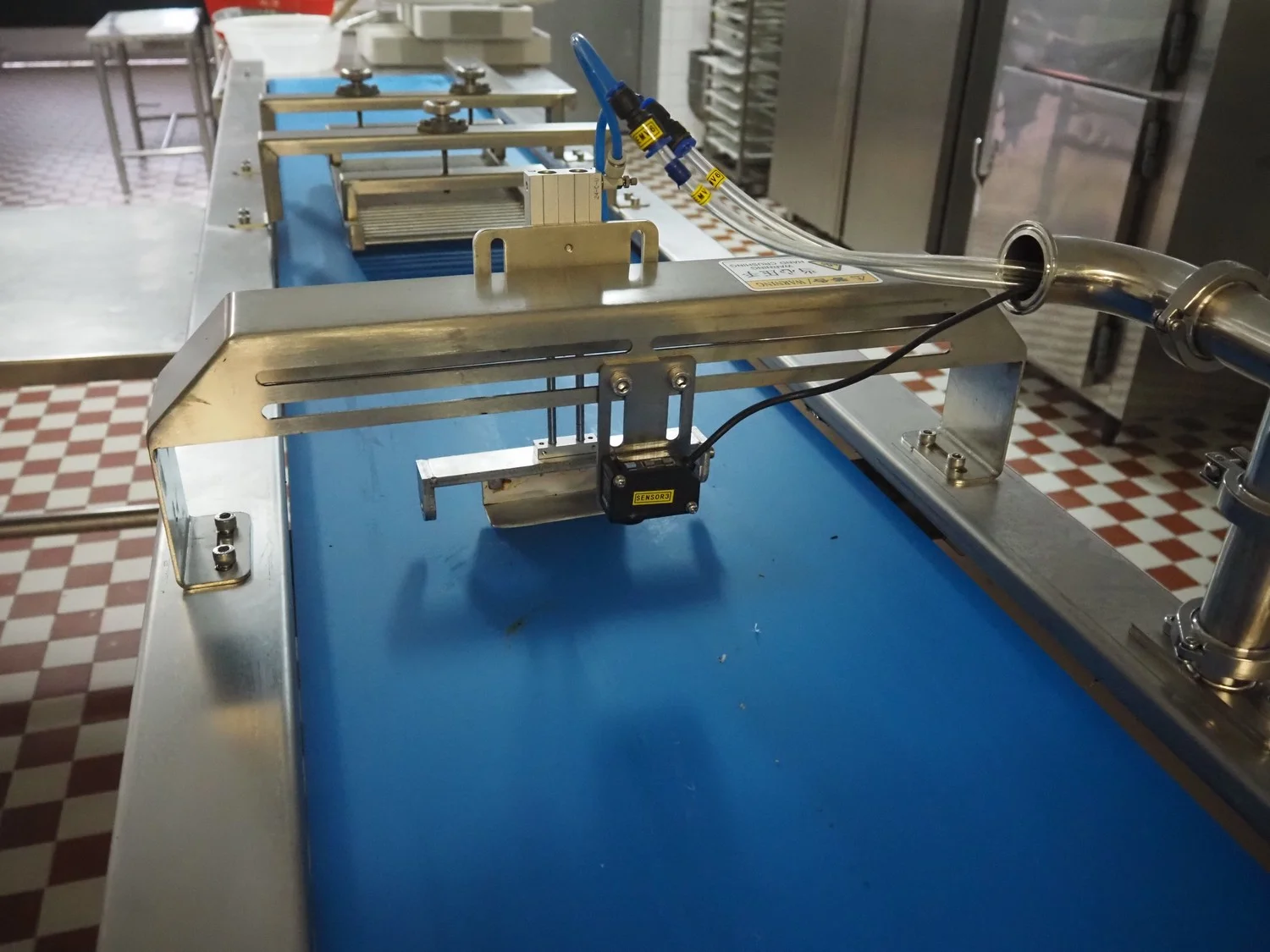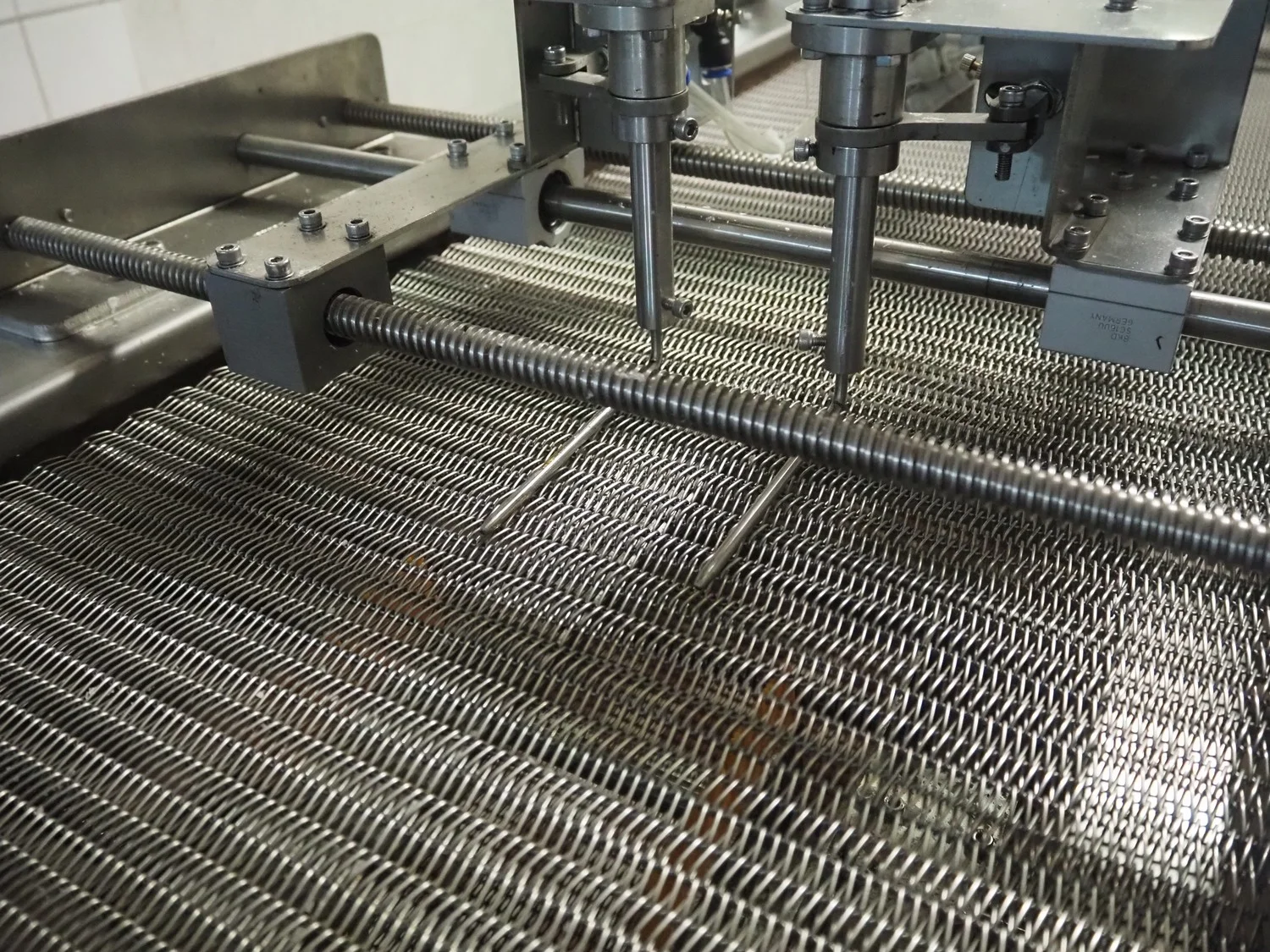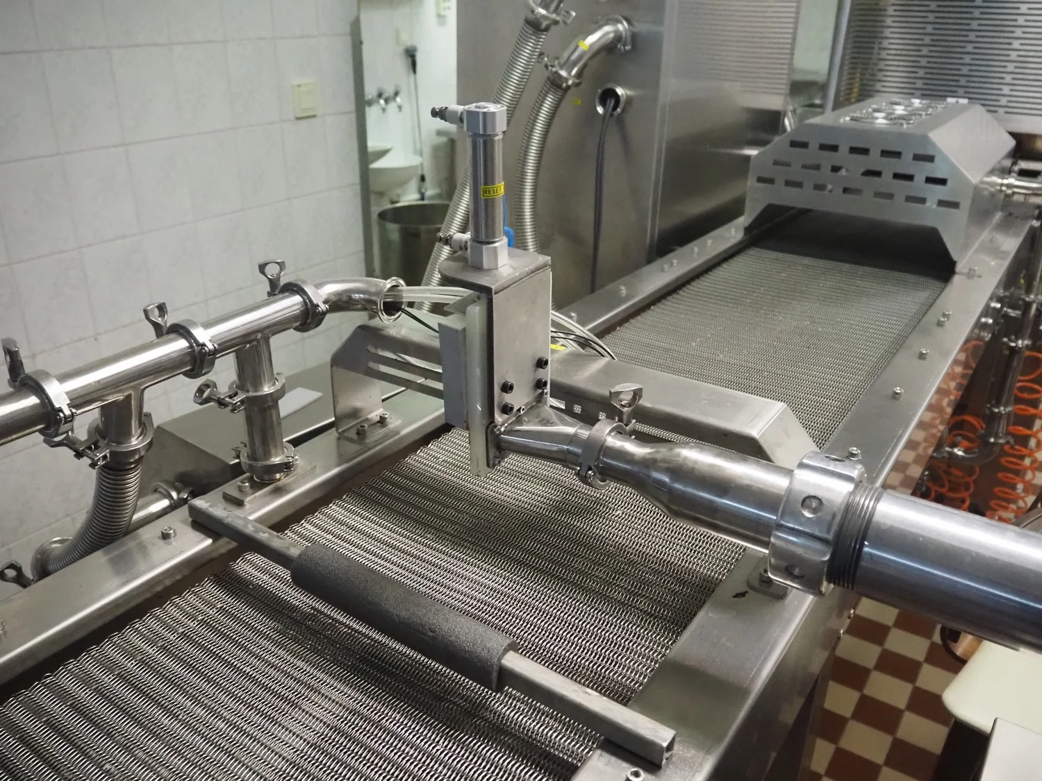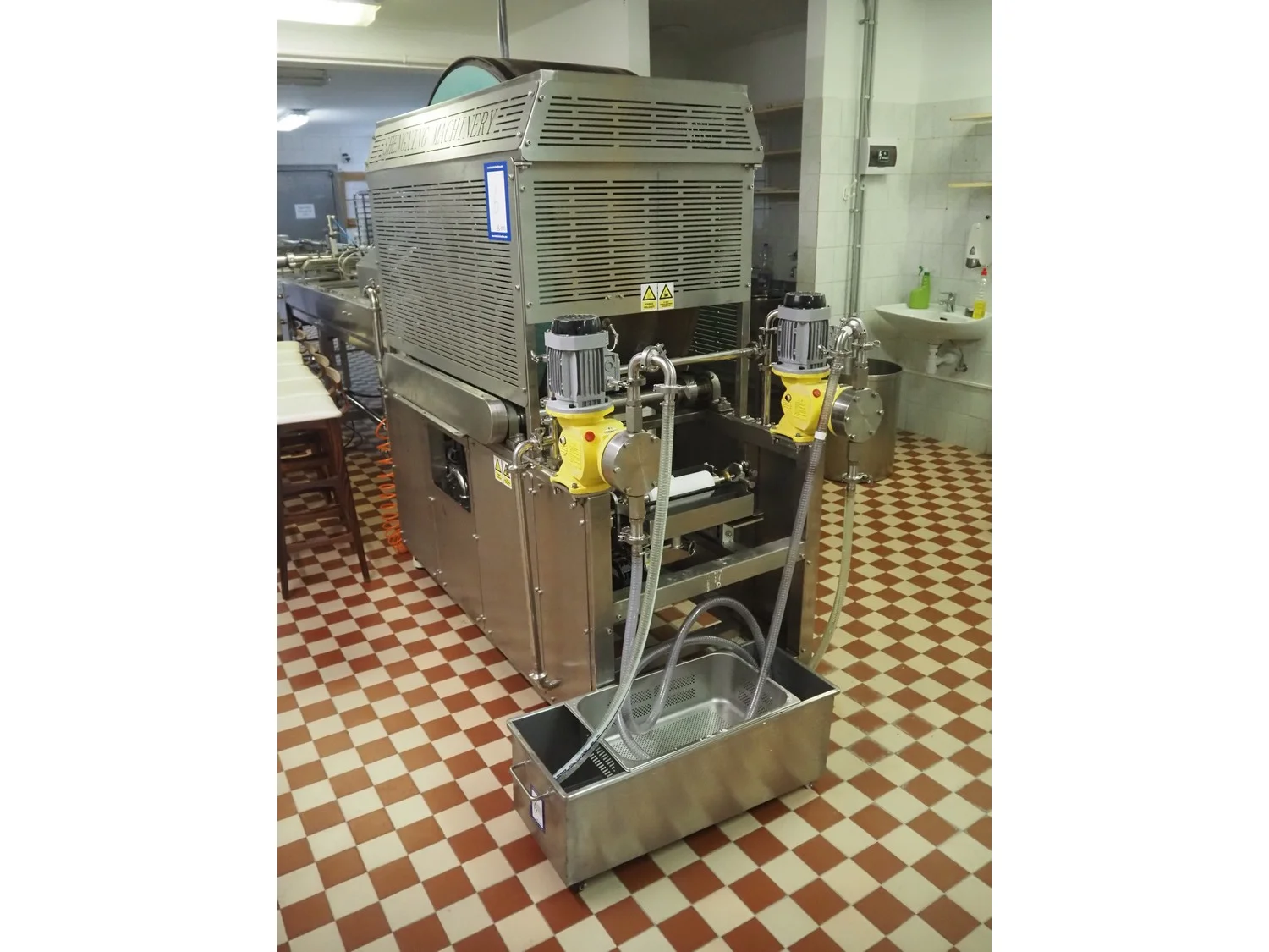 Shengxing Machinery production line for spring rolls, tub with 2 pumps, heated press, press width: 500 mm, s/s mesh belt, belt width: 430 mm, blower, 1 head depositor, plastic belt, belt width: 430 mm, total dimensions: 9000 mm x 1200 mm x 2000 mm. Used only 8 times.