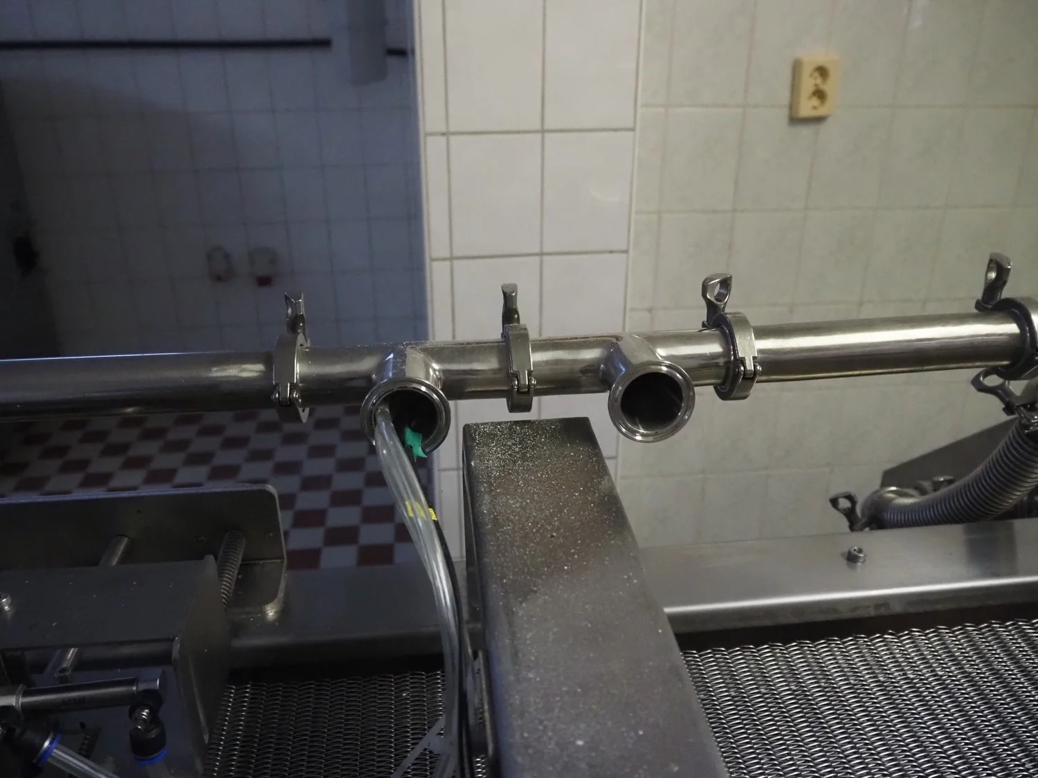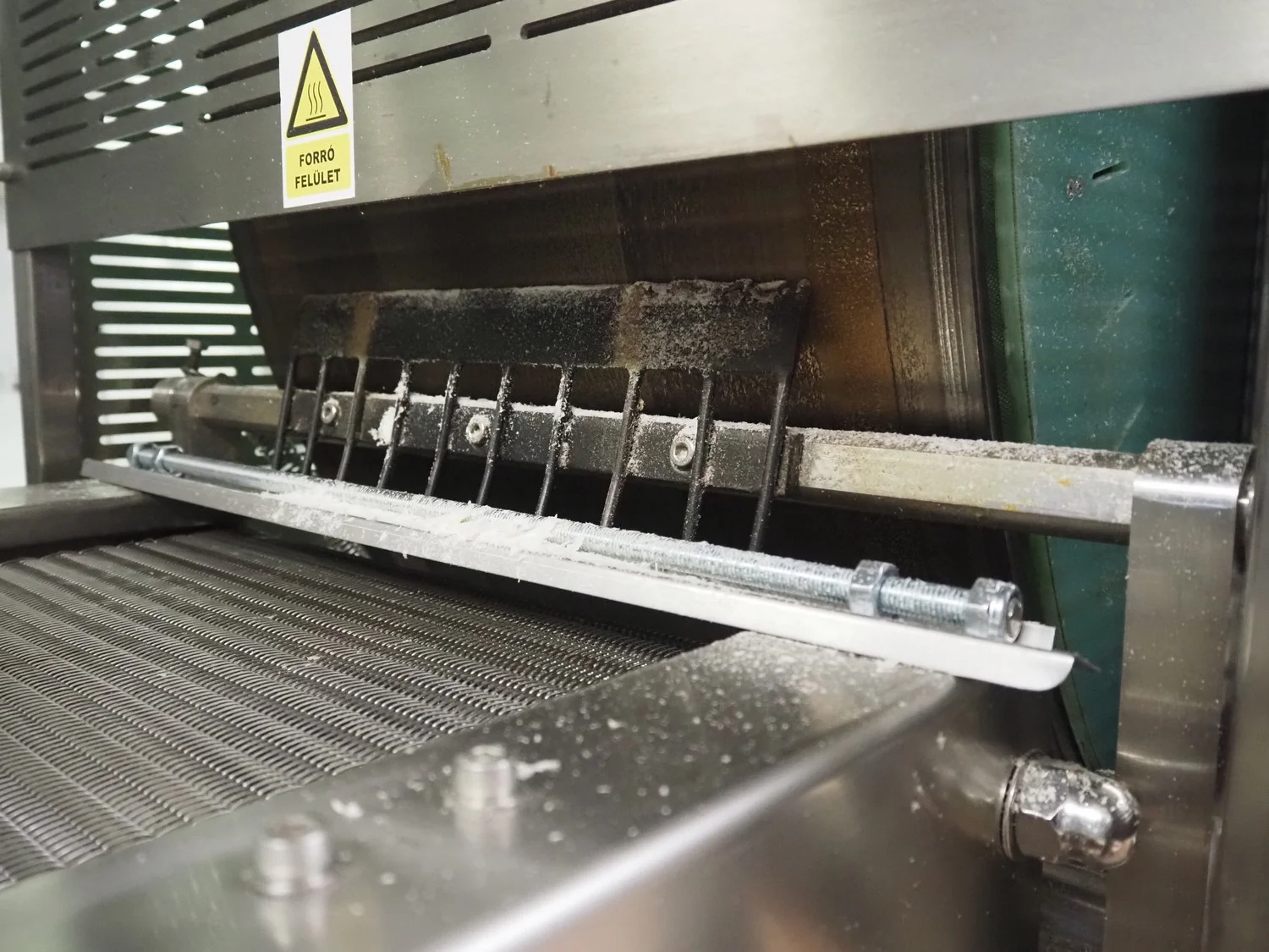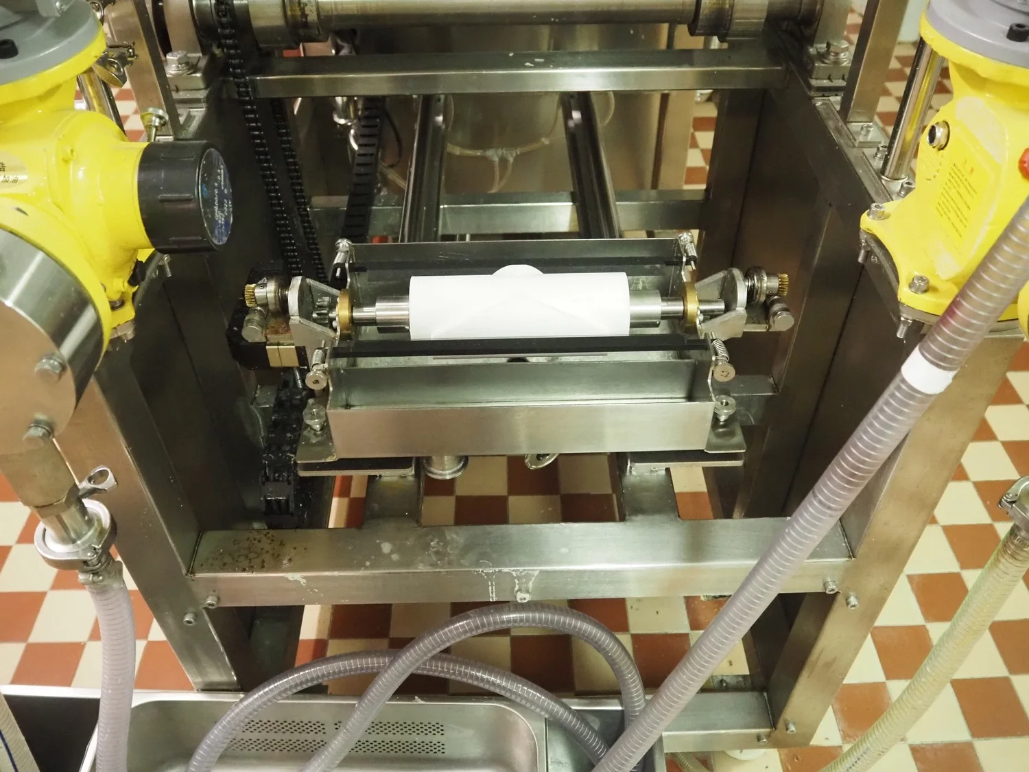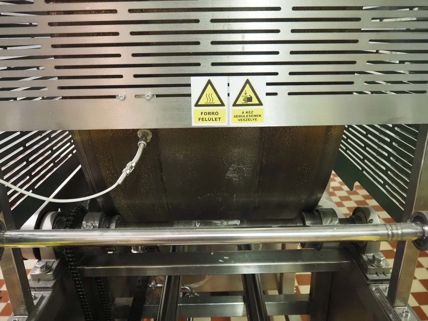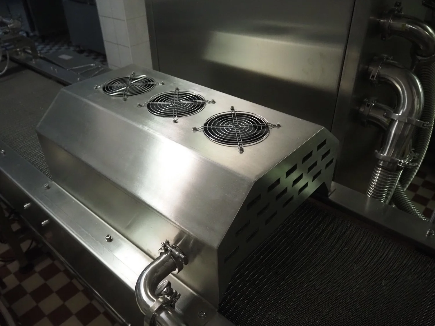 Shengxing Machinery production line for spring rolls, tub with 2 pumps, heated press, press width: 500 mm, s/s mesh belt, belt width: 430 mm, blower, 1 head depositor, plastic belt, belt width: 430 mm, total dimensions: 9000 mm x 1200 mm x 2000 mm. Used only 8 times.