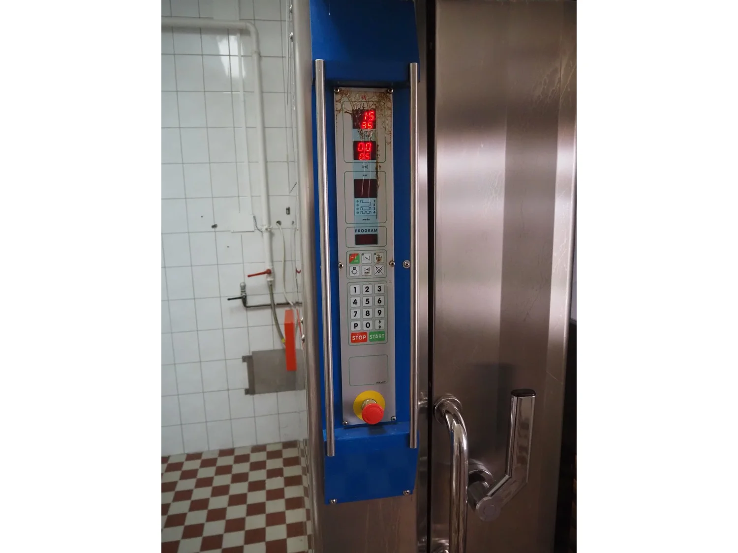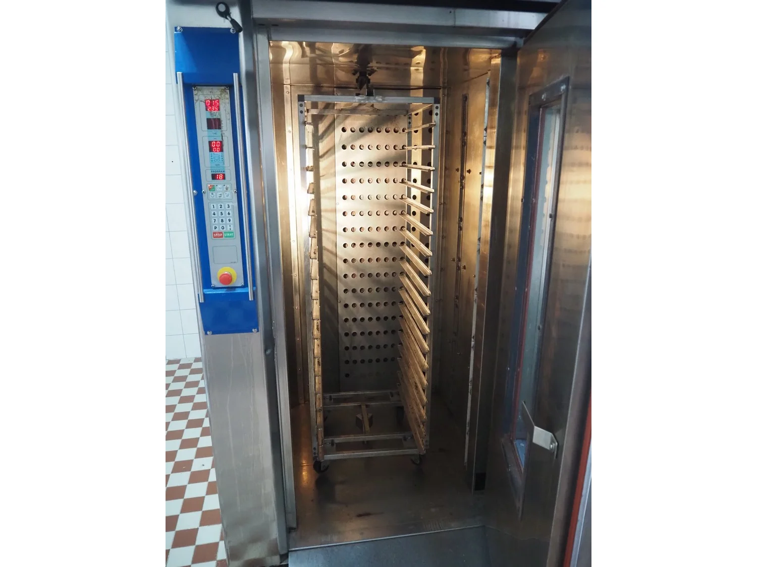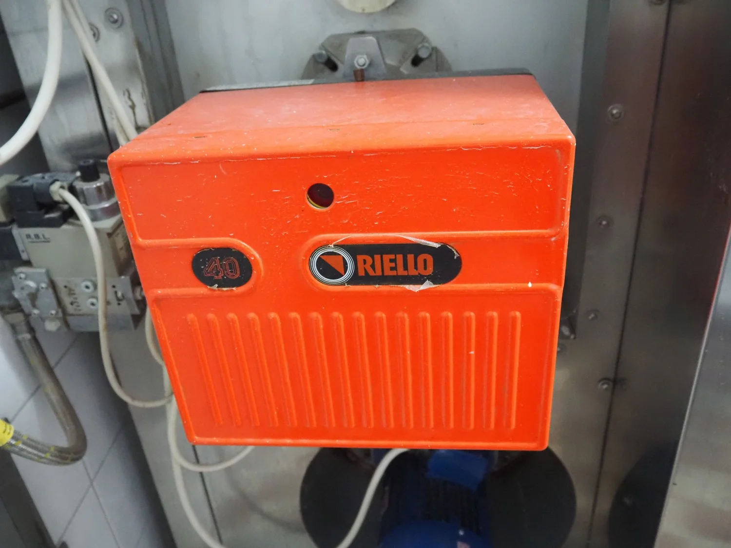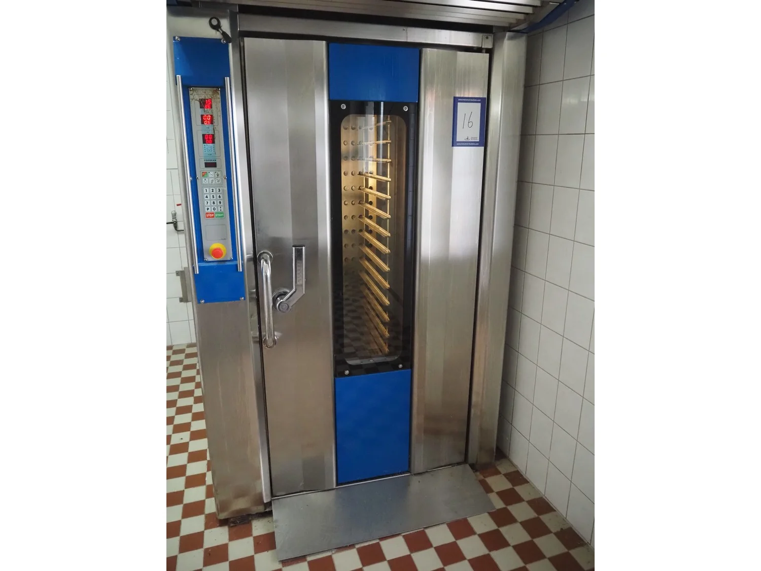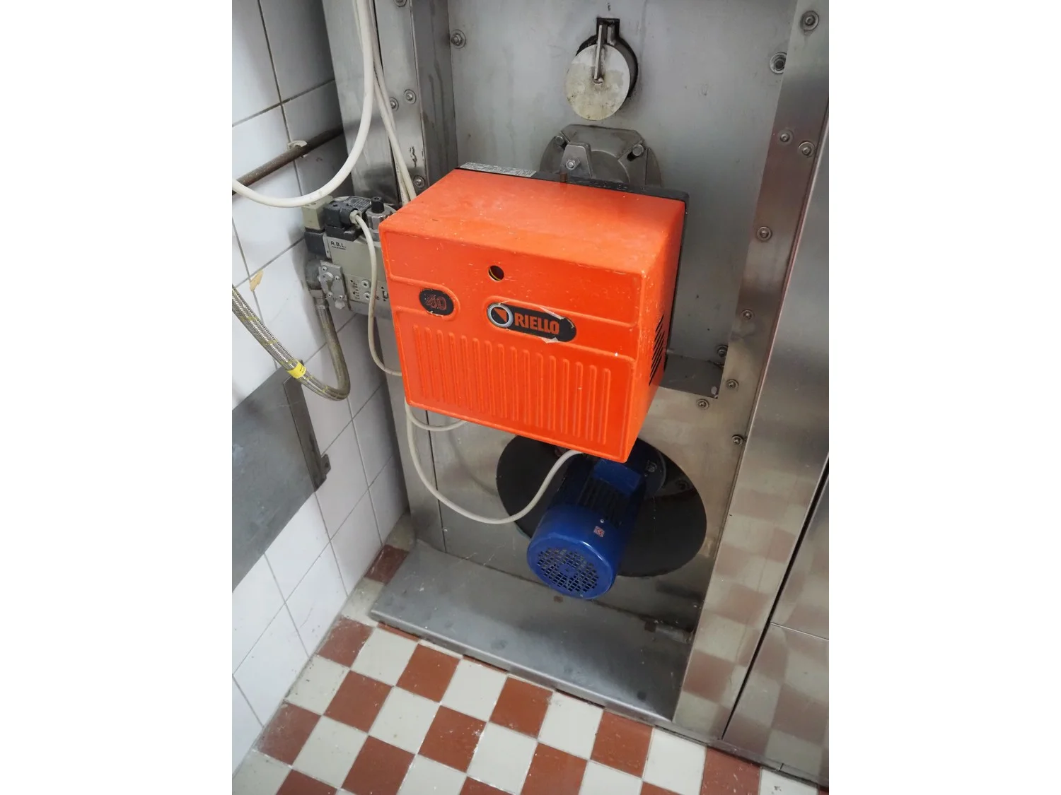 Ideal rotary oven for 1 trolley, gas heated, Riello burner, model: Riello 40 FS8, inside dimensions: 1100 mm x 970 mm x 1870 mm, total dimensions: 2500 mm x 1400 mm x 2650 mm.
