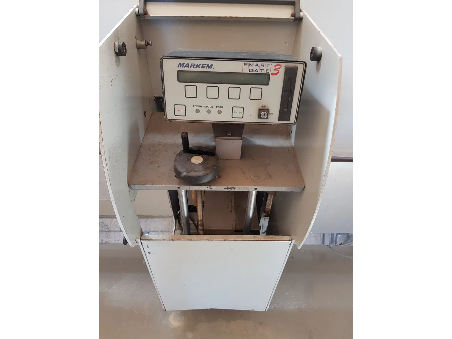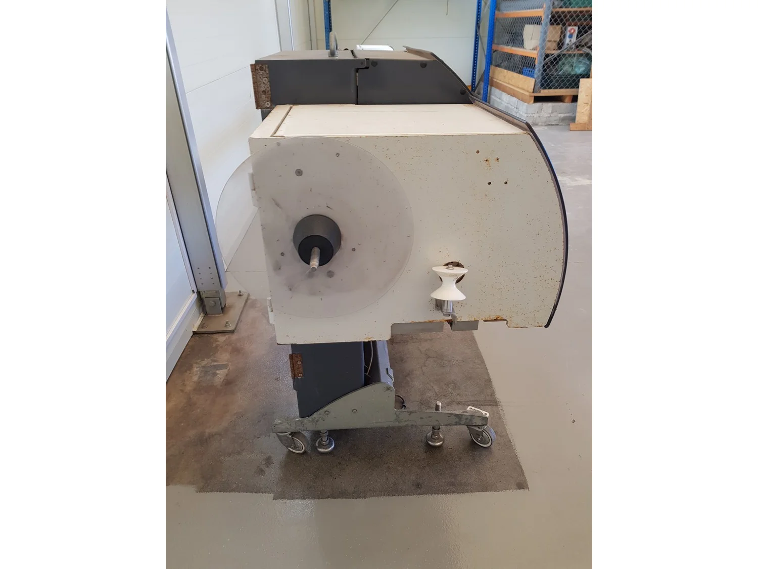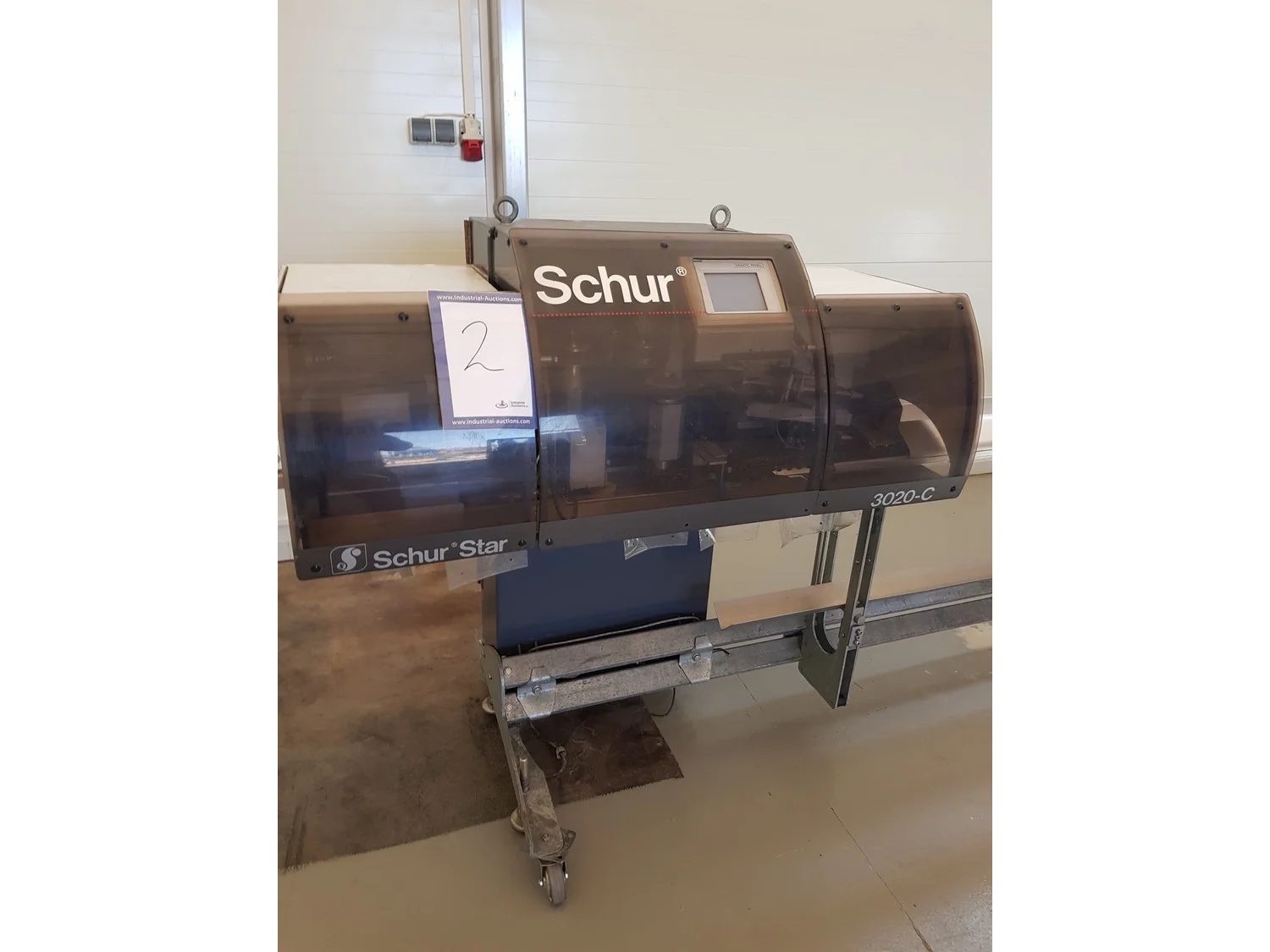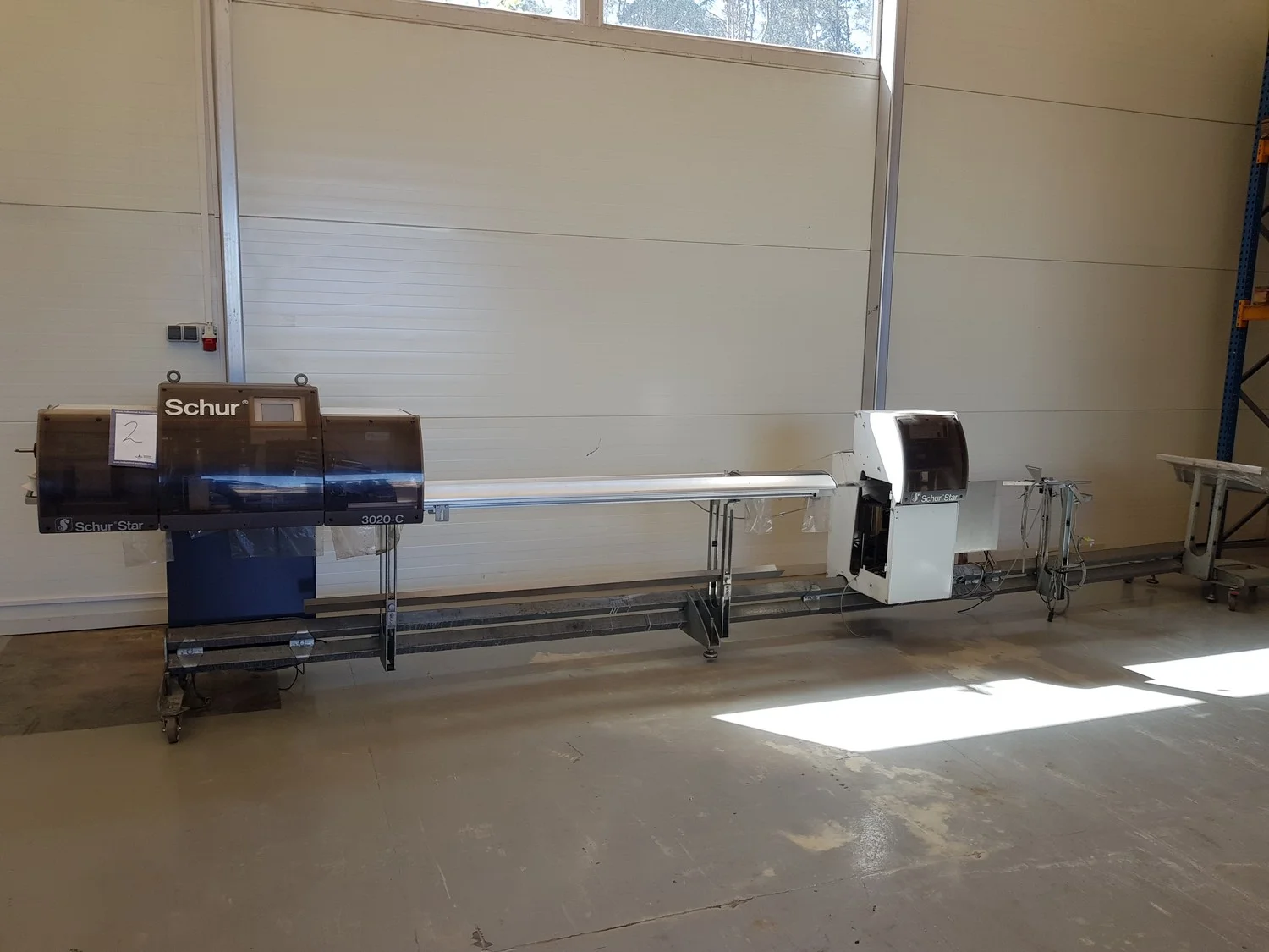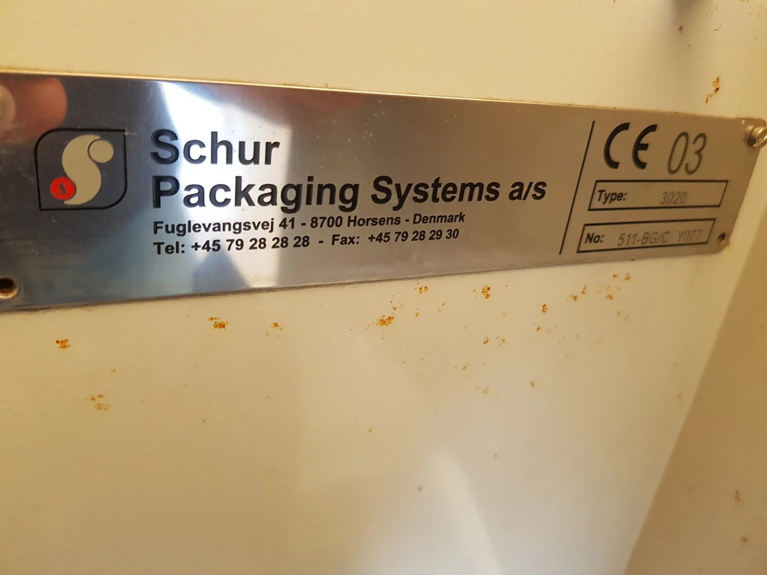 Schur Packaging Systems a/s mobile horizontal bag forming and sealing machine, type: 3020, number: 511-BG/C Y077, year of construction: 2003, seal length: 300 mm, belt width: 135 mm, total dimensions: 7000 mm x 1000 mm x1500 mm.